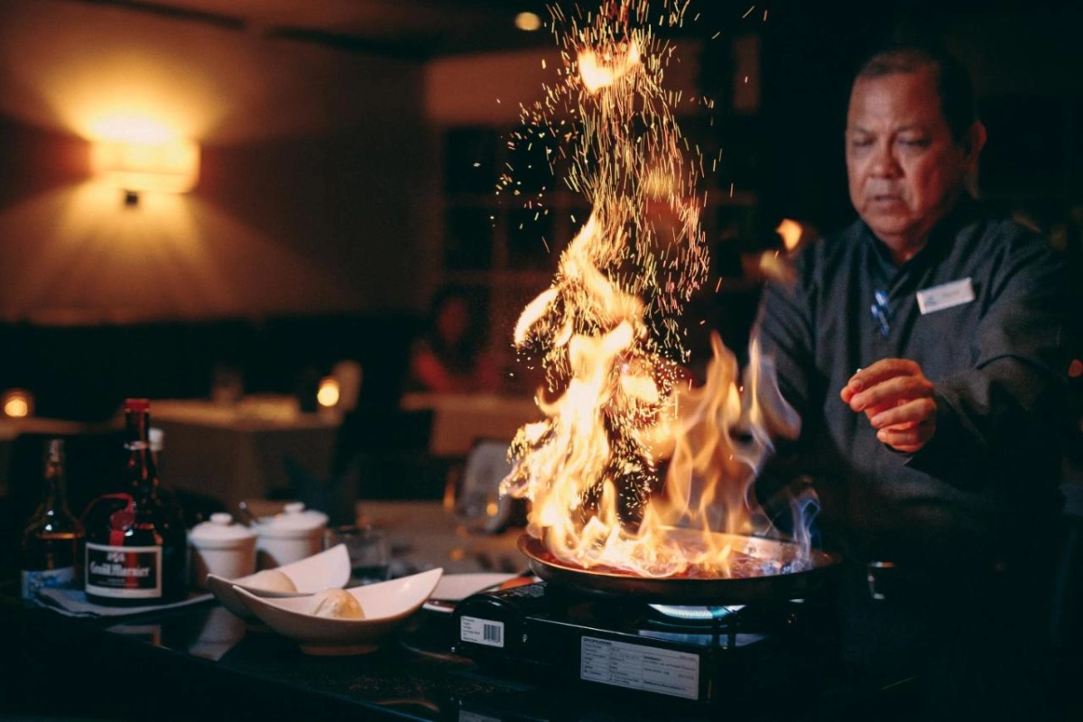Four dining venues ignite the senses. The Chophouse grills prime meats and fresh snapper with fine wines, while Omakase Sushi Bar crafts Tokyo-inspired sushi and a four-course chef's journey. Ike's Bistro serves à la carte breakfasts with tropical fruits, shifting to Mediterranean dinners poolside. Pega Pega Beach Bar & Grill mixes smoothies and poke bowls, with orange flags signaling beach service. Bars offer cocktails under live steel pan tunes.