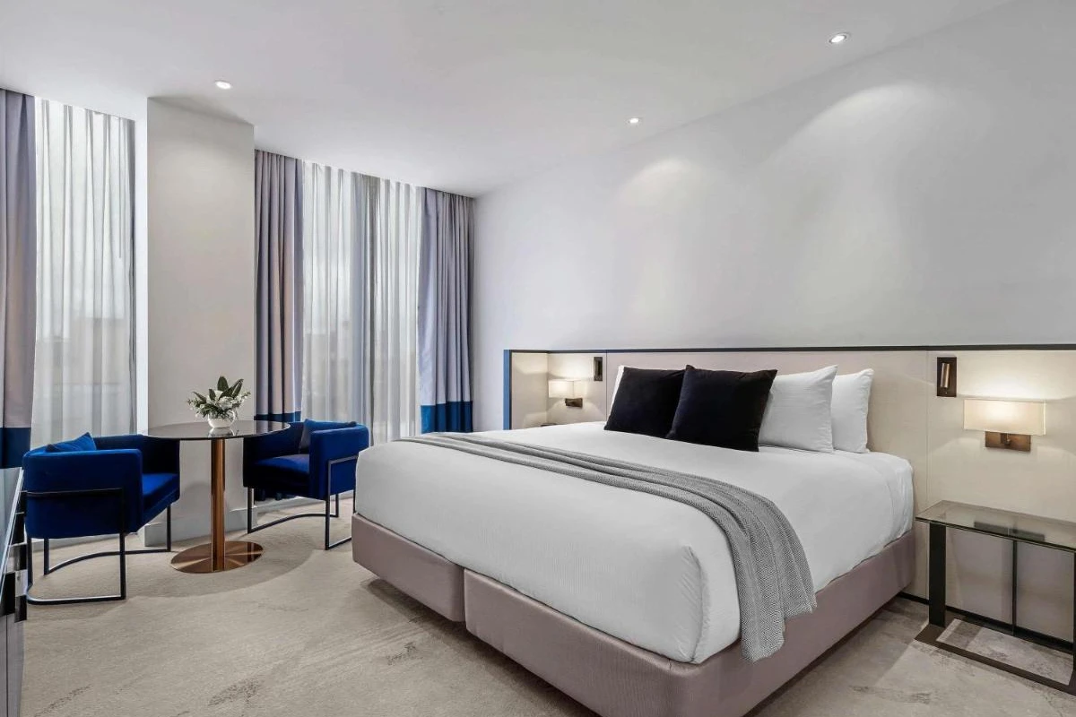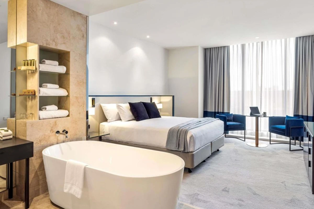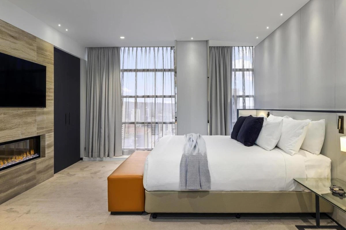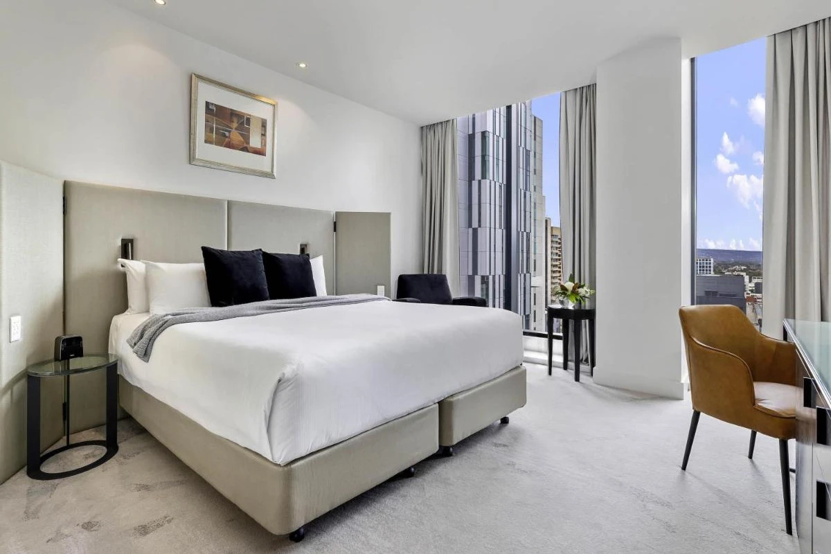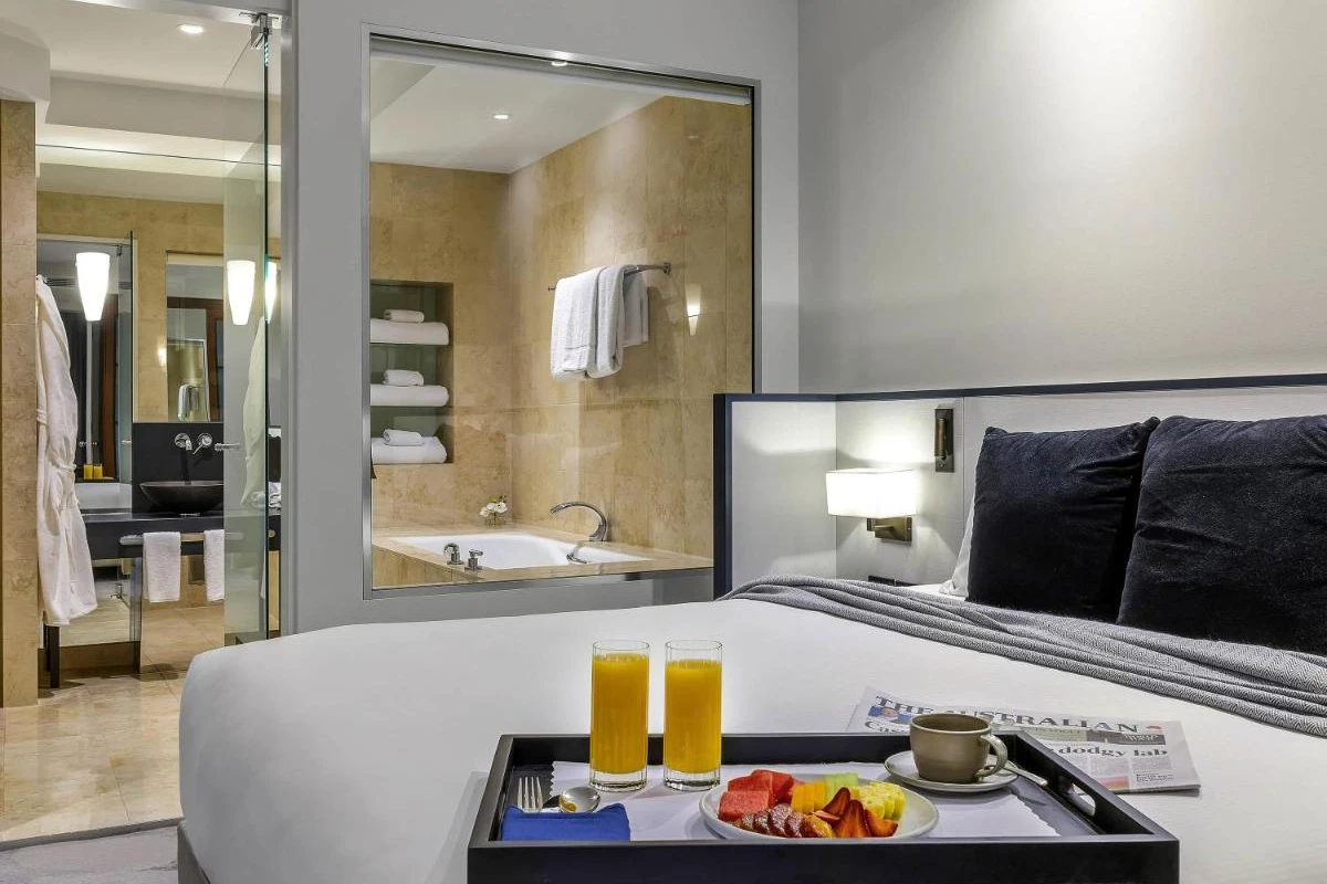 Superbly positioned just a five-minute walk from Central Market and Rundle Mall, the spacious rooms and suites feature marble en-suite bathrooms with deep bathtubs and separate showers, air-conditioning, and floor-to-ceiling windows showcasing dazzling Adelaide skyline views. Select rooms offer private balconies and separate lounge areas, blending contemporary elegance with deluxe fittings and plush furnishings, ensuring a refined sanctuary for discerning travellers seeking both comfort and style. The hotel's strict no-party policy and restriction on unregistered guests after 9pm maintain a serene ambiance.