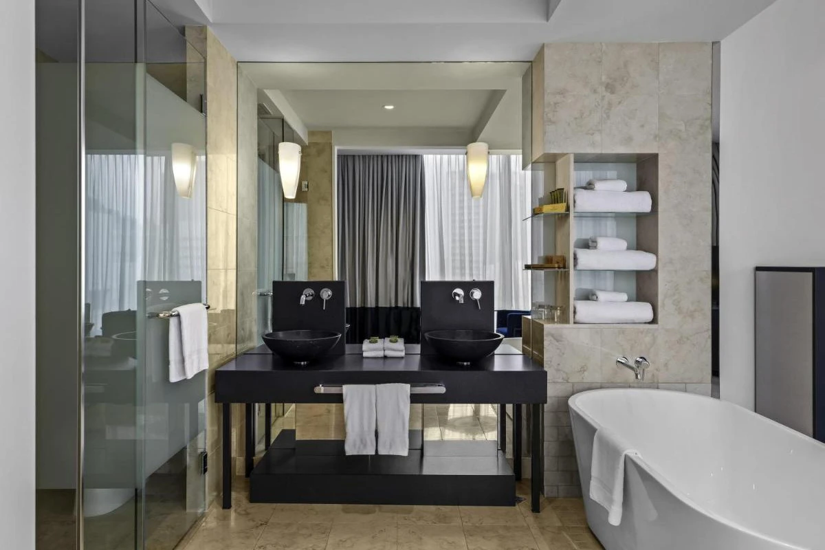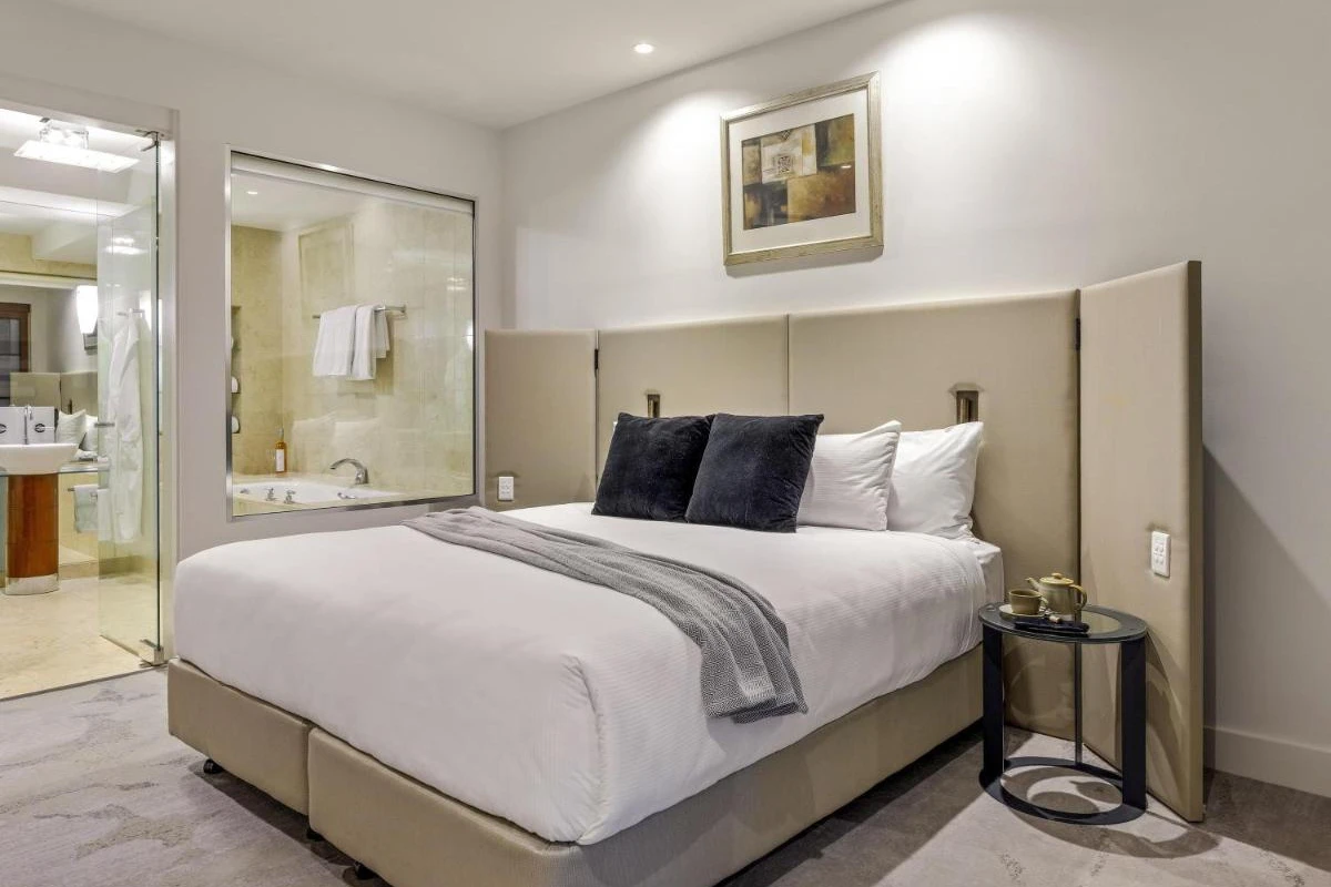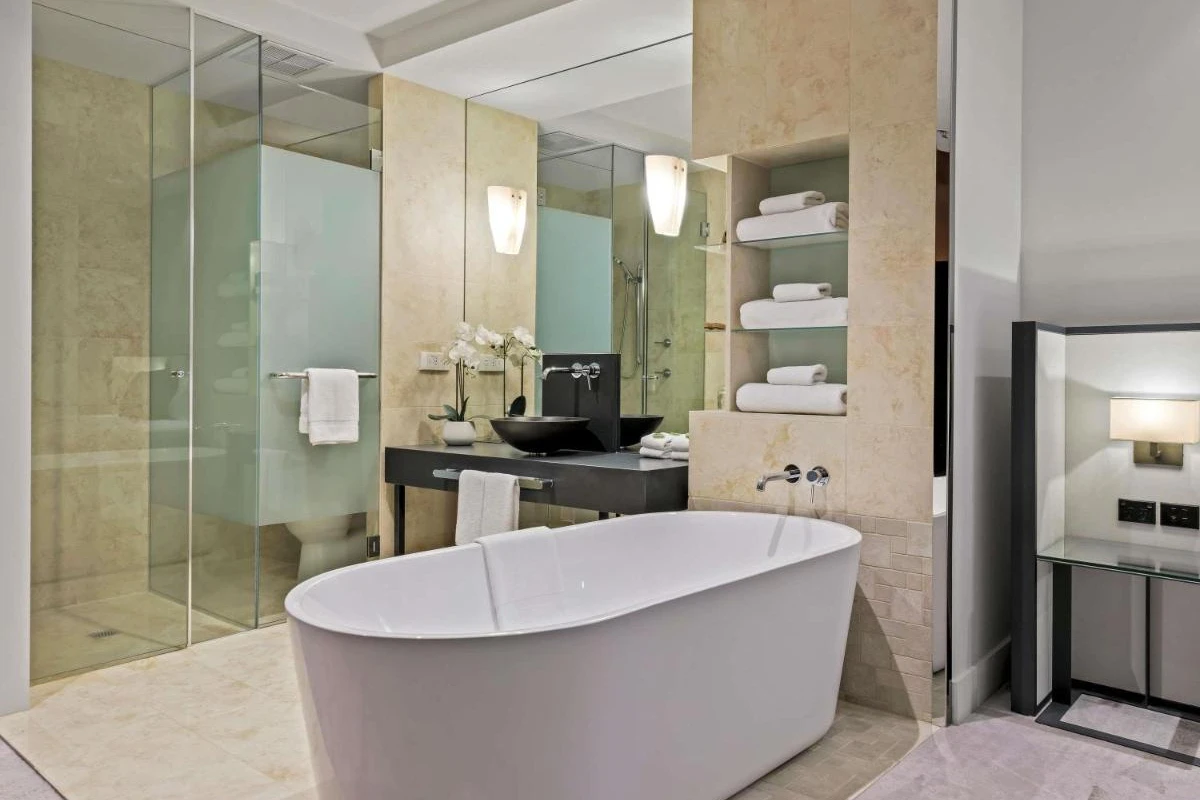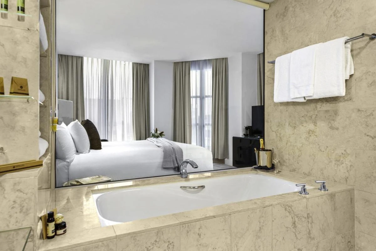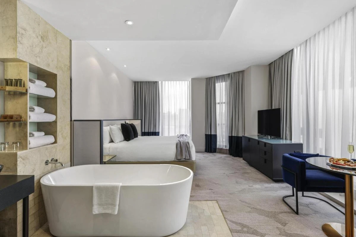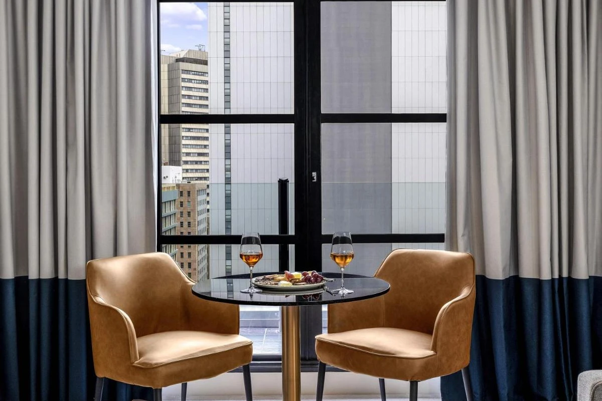 Superbly positioned just a five-minute walk from Central Market and Rundle Mall, the spacious rooms and suites feature marble en-suite bathrooms with deep bathtubs and separate showers, air-conditioning, and floor-to-ceiling windows showcasing dazzling Adelaide skyline views. Select rooms offer private balconies and separate lounge areas, blending contemporary elegance with deluxe fittings and plush furnishings, ensuring a refined sanctuary for discerning travellers seeking both comfort and style. The hotel's strict no-party policy and restriction on unregistered guests after 9pm maintain a serene ambiance.
