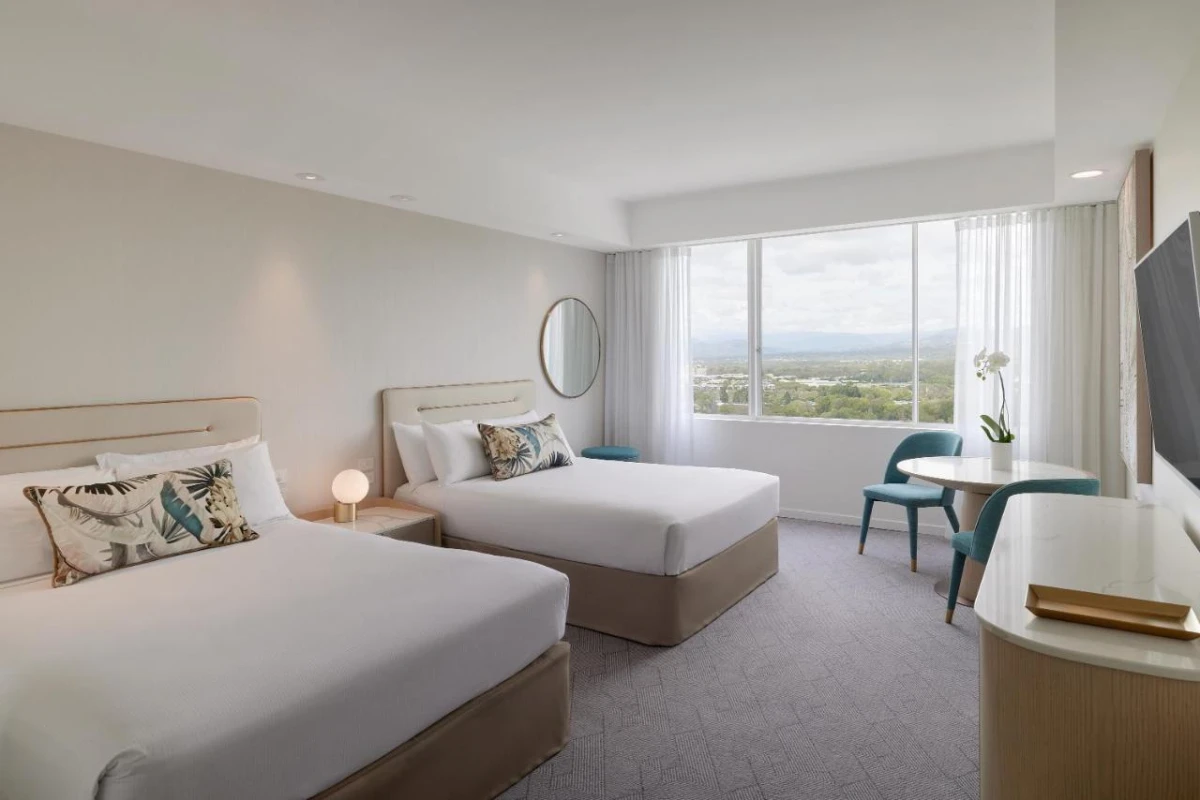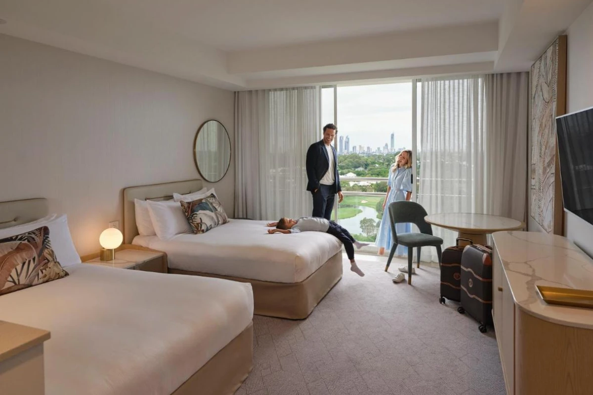 The resort's 333 stylishly appointed rooms and premium spa suites, designed for refined comfort, feature individually controlled air-conditioning, flat-screen TVs, minibars, and tea-and-coffee facilities, with most opening to private balconies showcasing expansive views of the lush hinterland, tropical pool, Gold Coast skyline, or the renowned 27-hole championship golf course, home to the Australian PGA Championship. Although Tee's Clubhouse and golf facilities are temporarily closed, they will reopen in a staggered manner, ensuring a golfer's dream experience. Each room blends contemporary elegance with serene surroundings, creating a sophisticated sanctuary for couples, families, or business travellers seeking indulgence.