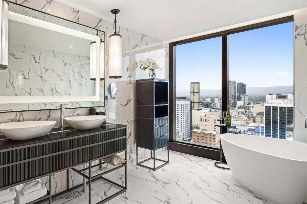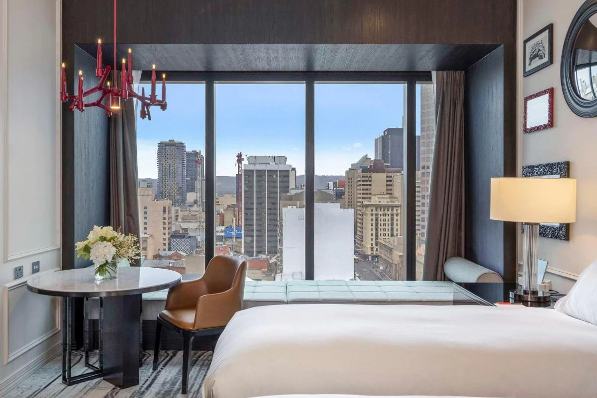 Spanning 24 floors, the 251 exquisitely appointed guestrooms blend old-world details with modern aesthetics, featuring air-conditioned comfort, flat-screen TVs, desks, and private bathrooms adorned with curated textiles and premium amenities in soothing hues. Many rooms showcase stunning panoramic views of the city, coast, or Adelaide Hills, creating a refined sanctuary that harmonizes sophisticated French design with contemporary luxury, ensuring an indulgent stay for business travellers, couples, or cultural enthusiasts seeking comfort and style.