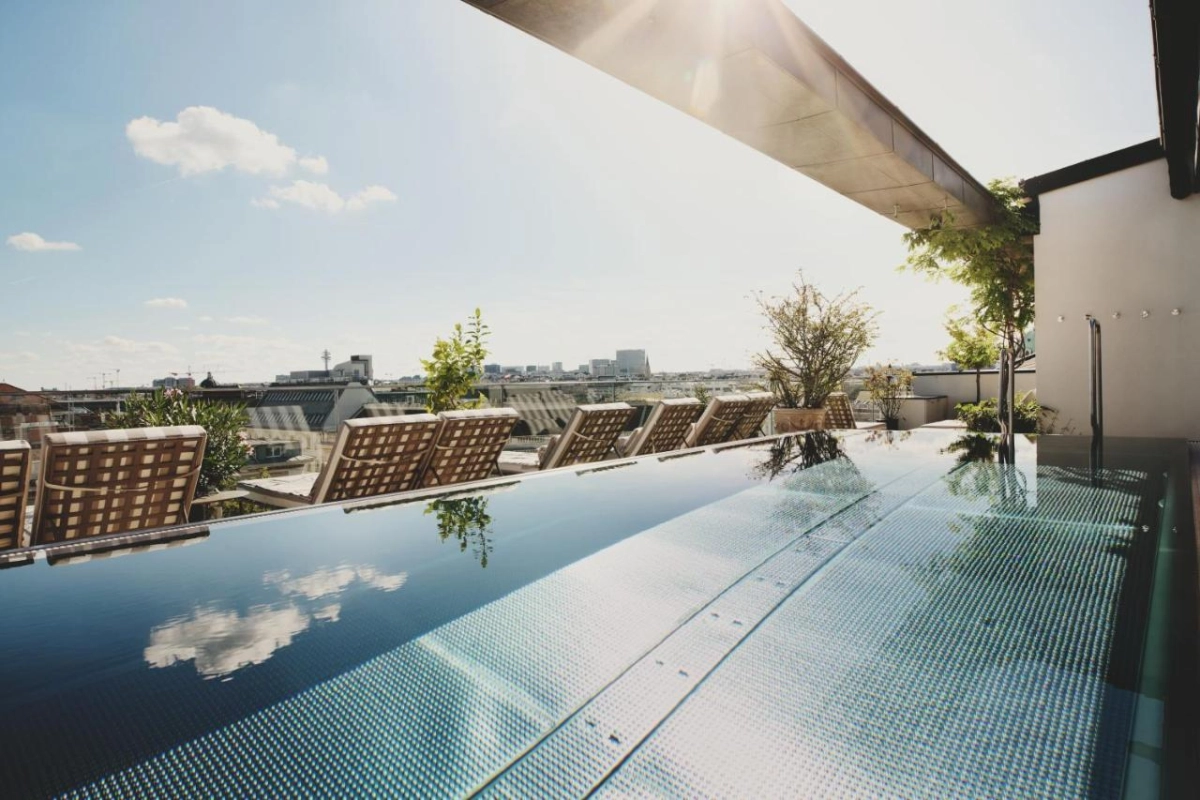 The 186 rooms, including four suites and a grand suite, radiate modern sophistication, featuring air-conditioned comfort, fine wooden floors, flat-screen TVs, minibars, and open-plan bathrooms with luxurious toiletries, designed for today's discerning traveller. The rooftop pool, warmed to 23 degrees, offers a unique urban oasis with panoramic city views. The fitness centre and 24-hour concierge enhance guest experiences, curating tailored outings to Vienna's cultural landmarks.