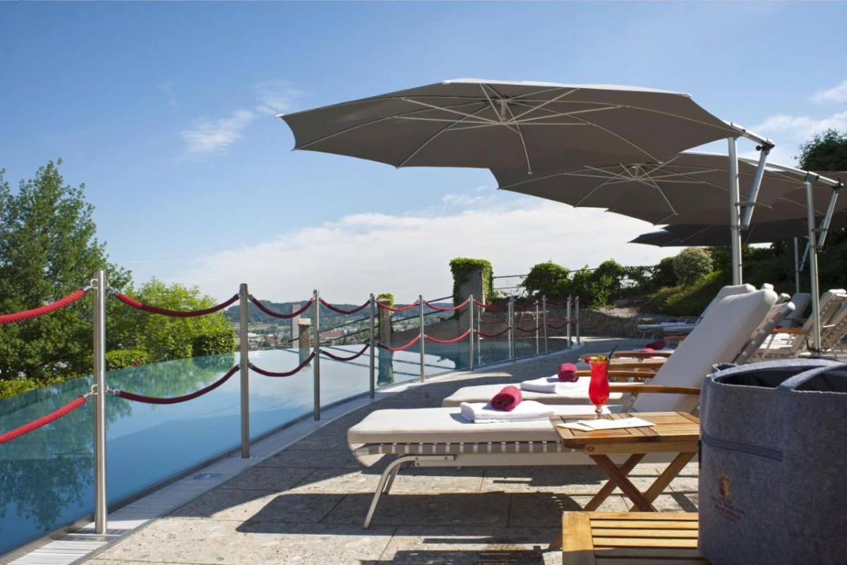 The 24 exclusive rooms and suites radiate luxurious individuality, adorned with priceless antiques, marble bathrooms, air-conditioned comfort, flat-screen TVs, minibars, and premium toiletries. Each offers serene views of the city or lush park, with welcome touches like a fruit basket and homemade Guglhupf cake. The Mönchstein Spa, featuring a steam bath, sauna, and bespoke massage, beauty, and wellness treatments, invites profound relaxation, complemented by a unique infinity pool and outdoor hot tub overlooking Salzburg.