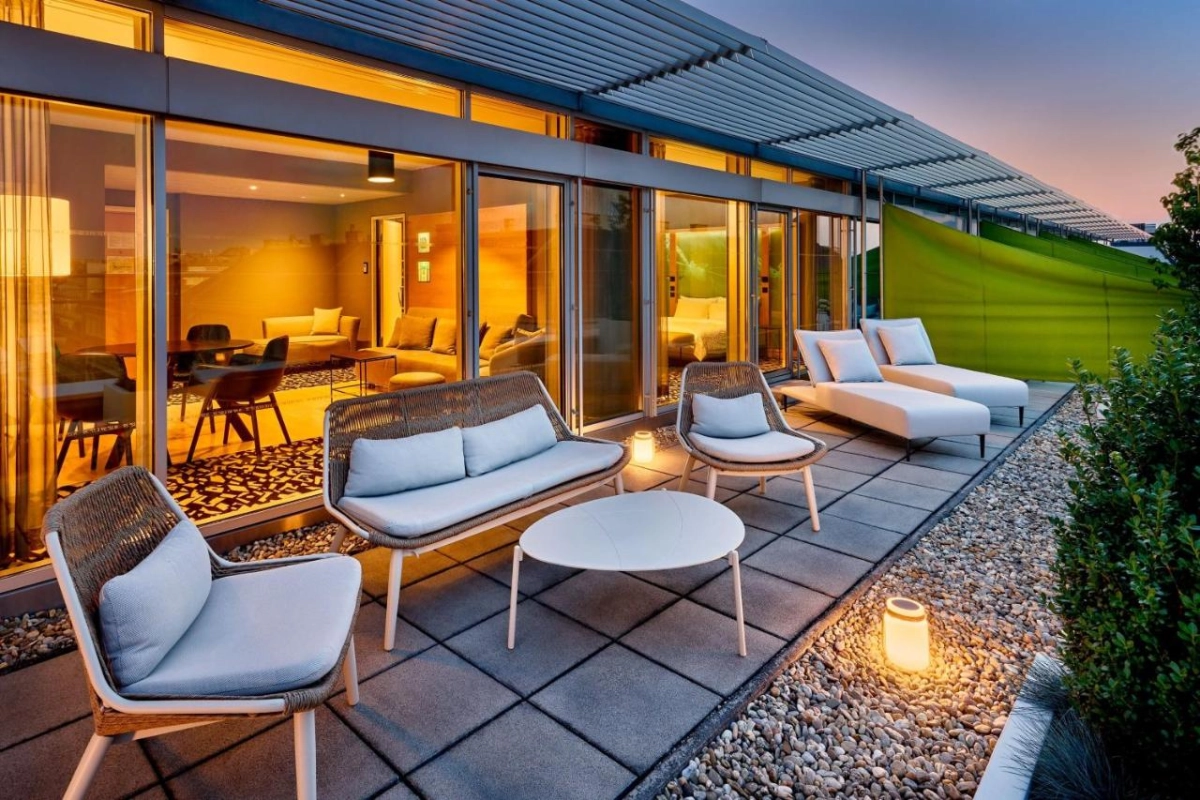 The 294 rooms and suites radiate modern elegance, featuring large flat-screen TVs with multimedia systems, air-conditioned comfort, minibars, and spacious bathrooms with free-standing Victorian-style baths or separate massage showers, adorned with premium toiletries. Many offer views of the city, courtyard, or Schillerpark, with private roof terraces available on request. The spa, with an indoor pool, hot tub, steam bath, sauna, and 24-hour fitness centre with personal trainers, invites rejuvenation, while the Unlock Art™ keycard grants entry to Kunsthalle Vienna.