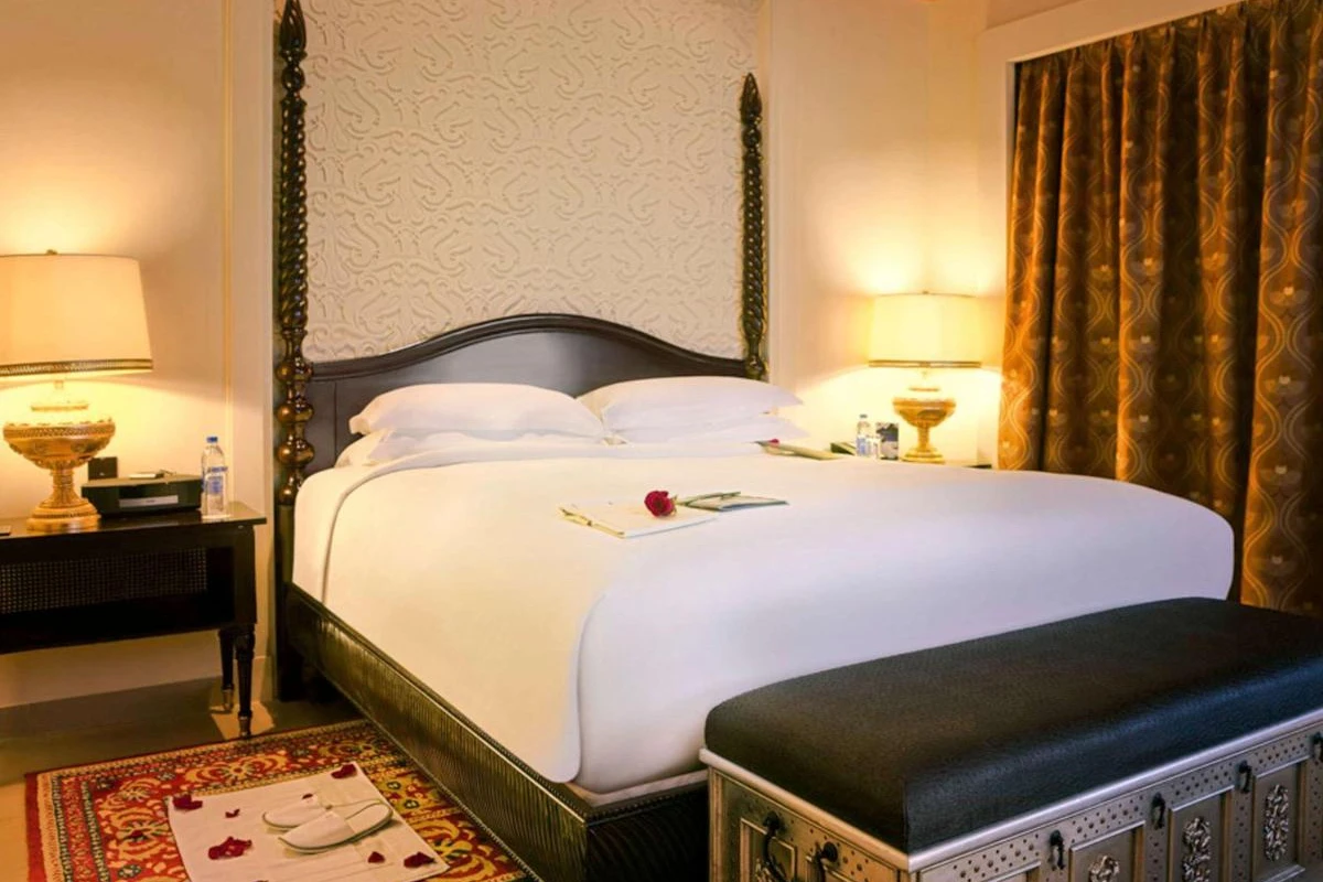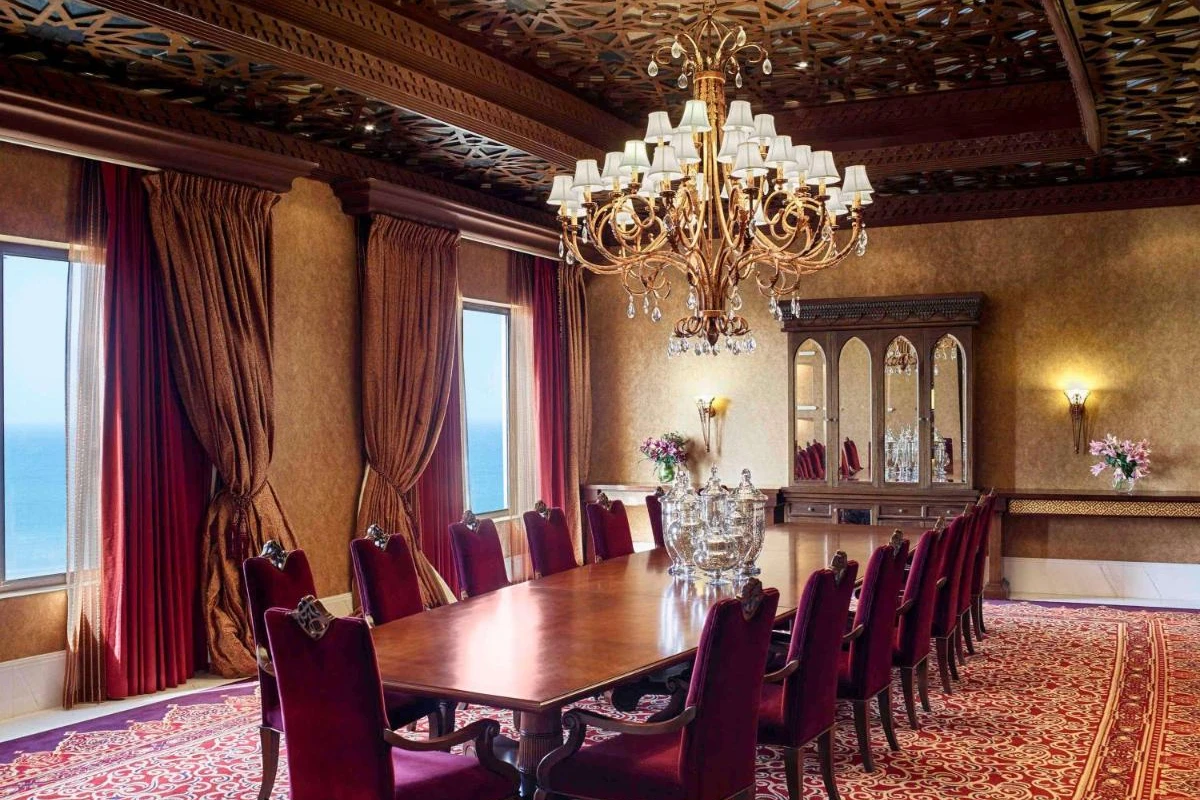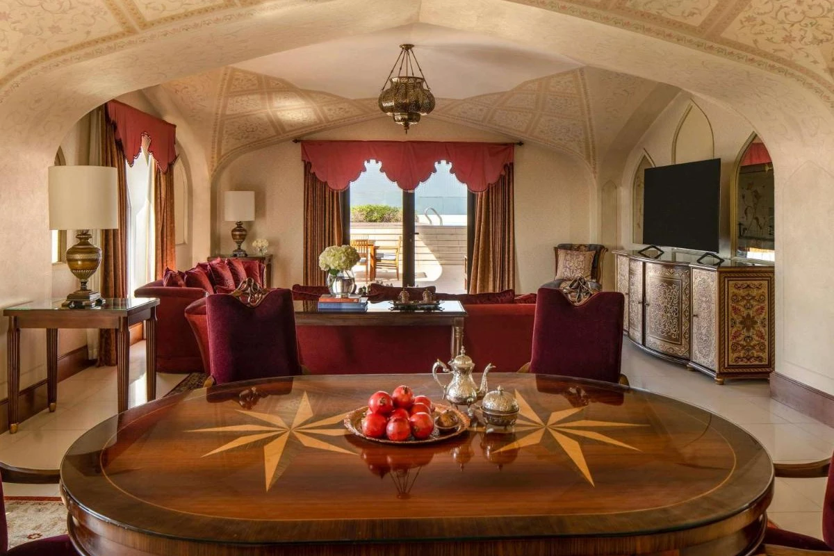 The 262 rooms, suites, and four sea-facing villas exude sophistication with air-conditioned spaces, flat-screen TVs, minibars, and marble bathrooms with premium toiletries. Private balconies, some with infinity pools in Prestige and Opera suites, open to Arabian Gulf vistas, crafting an intimate haven for couples or families. A large outdoor pool with a swim-up bar adds a serene touch.