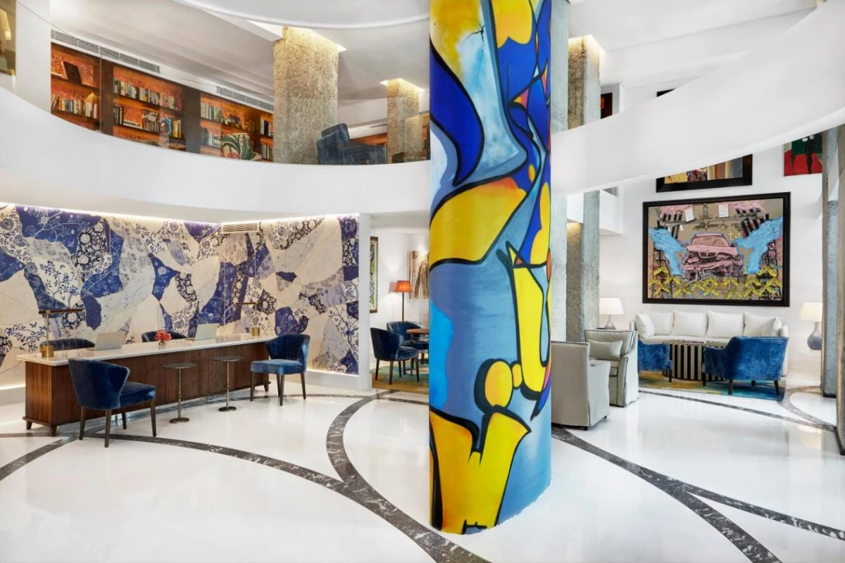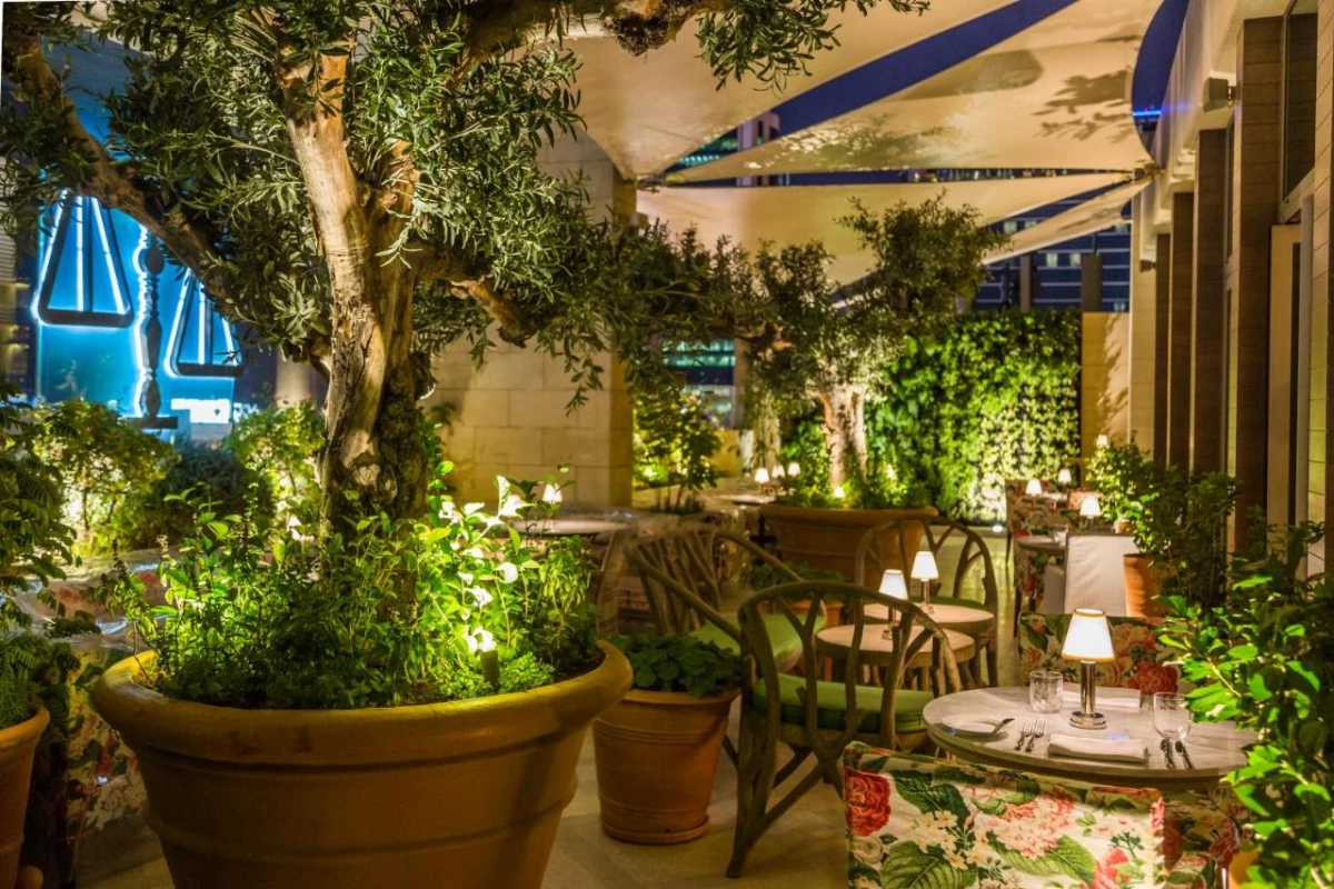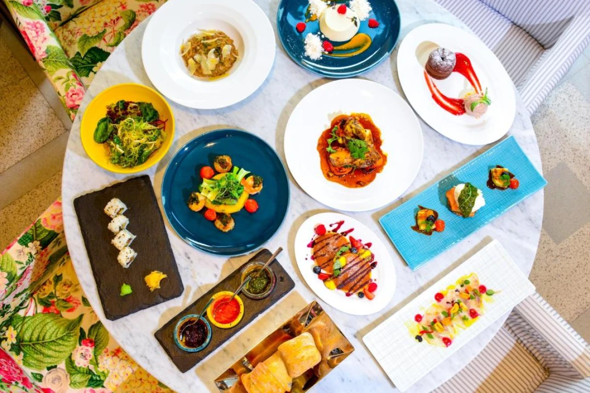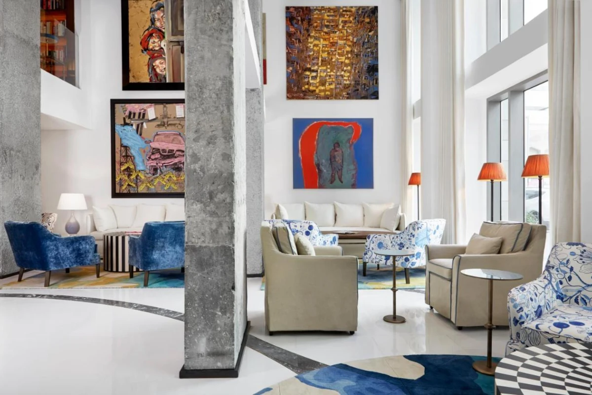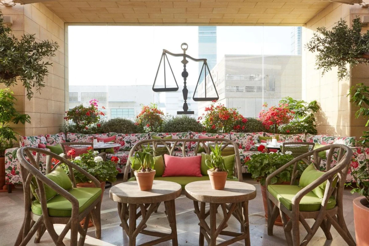 Cafe Gray, nestled among the lobby's concrete columns and iconic graffiti wall, serves à la carte breakfasts with fresh fruits, while Indigo Terrace's rooftop restaurant and bar offers international dishes and cocktails amid a British garden-inspired setting, paired with soft Arabian melodies, weaving a refined yet inviting ambience.