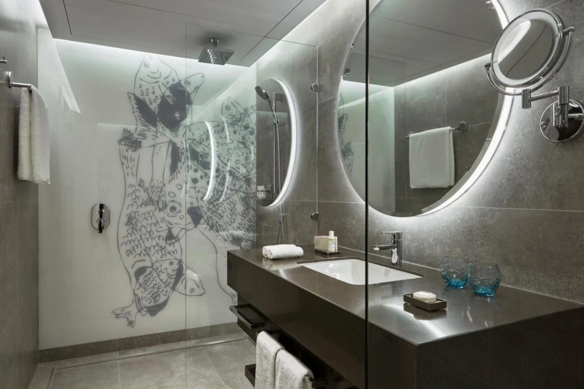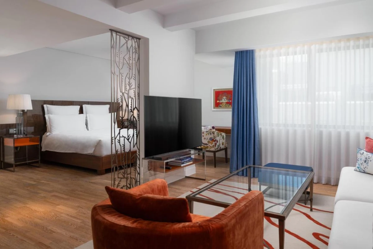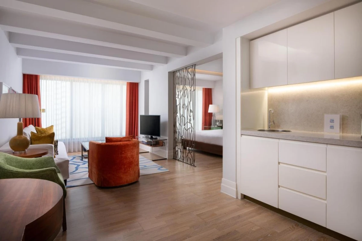 The 46 suites, spread across a 10-storey building, exude modern elegance with air-conditioned spaces, flat-screen TVs, coffee machines, microwaves, refrigerators, minibars, and private bathrooms with showers and premium toiletries. Each features a kitchenette, dining area, and open-plan living room, with many opening to city views, crafting an intimate haven for couples or professionals. An emerald green chlorine-free rooftop pool adds a serene touch.