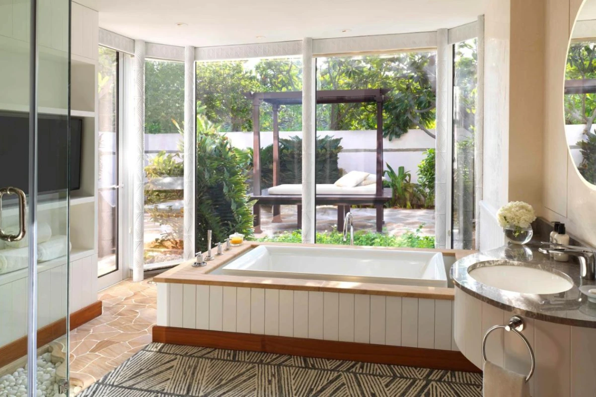 The 260 rooms, suites, and villas feature air-conditioned spaces with 600-threadcount linens, interactive flat-screen TVs with multilingual satellite channels, minibars, and plush bathrooms with premium toiletries. Many open to Arabian Gulf or garden views, crafting an intimate retreat for couples or families. A members-only Royal Beach Club with indoor and outdoor pools adds a serene touch.