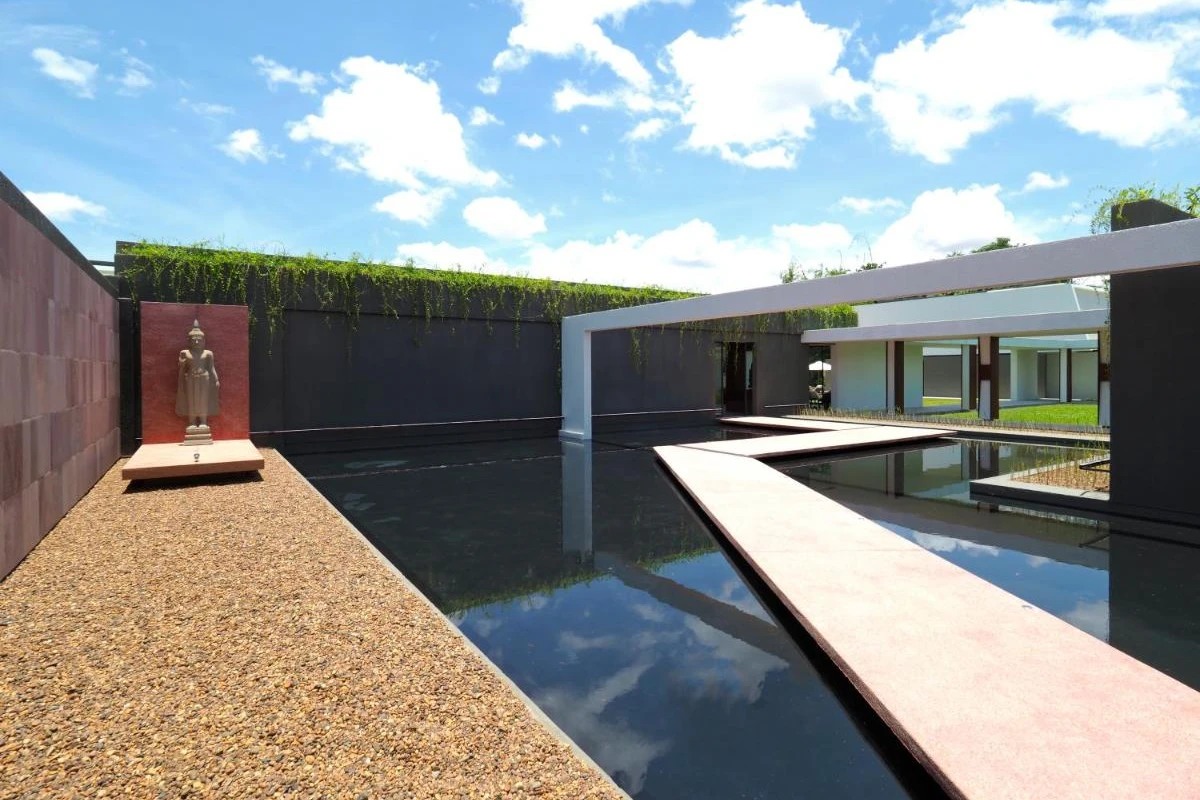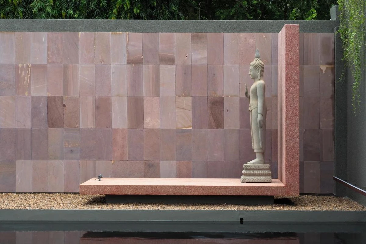A riverside infinity pool with black-bottomed depths offers cool respite amid fragrant lemongrass, spider lilies, frangipani trees, and vivid-green Lee Kuan Yew plants, evoking a tranquil arrival along the pink palimanan sandstone walkway. The intimate spa provides sublime treatments for deep relaxation, and a shared lounge fosters quiet conversations in the lush garden setting.