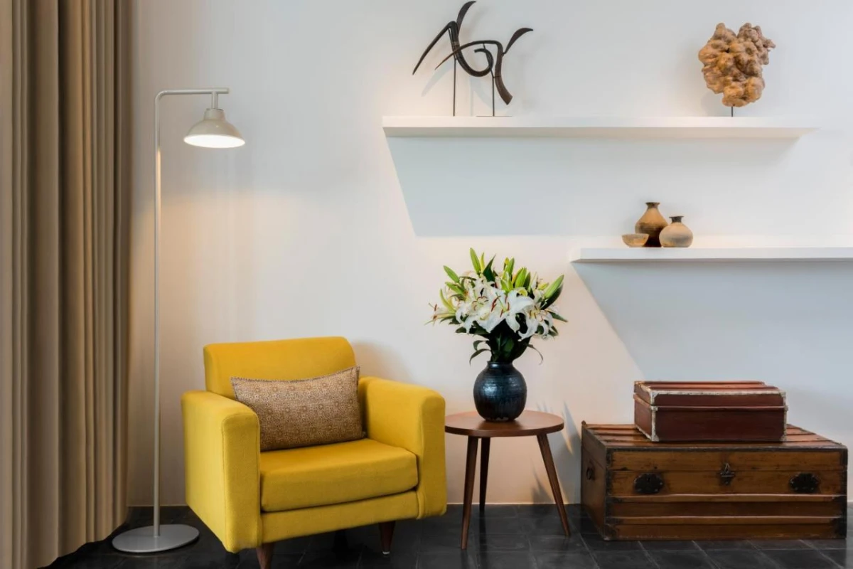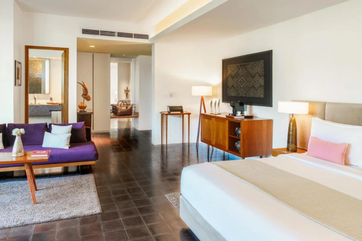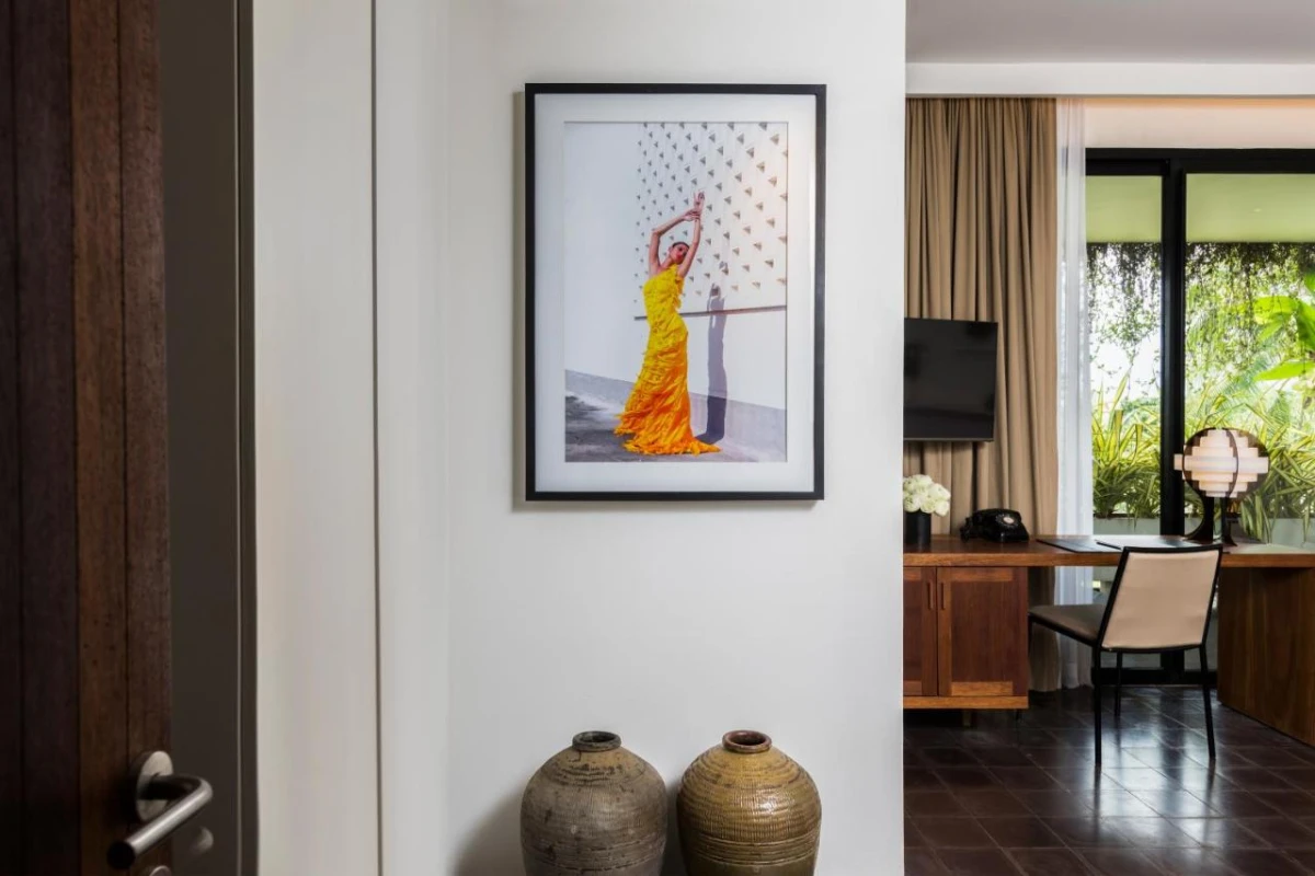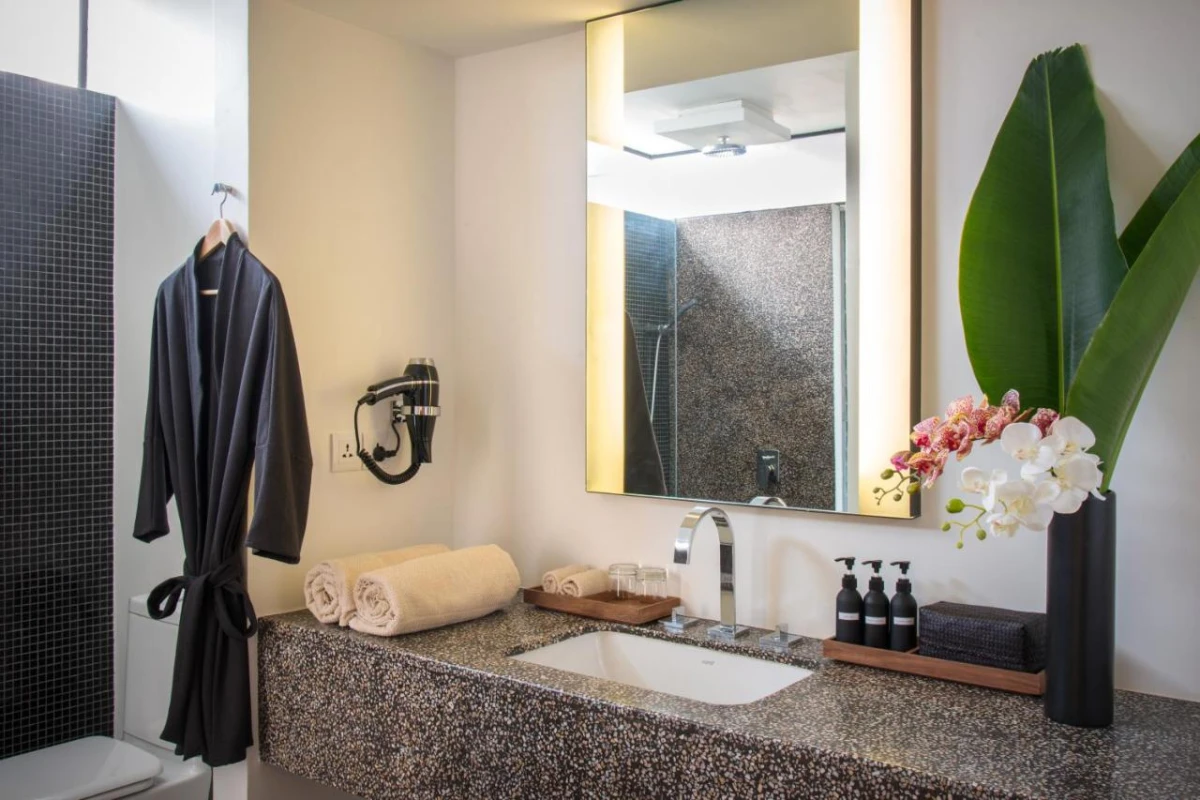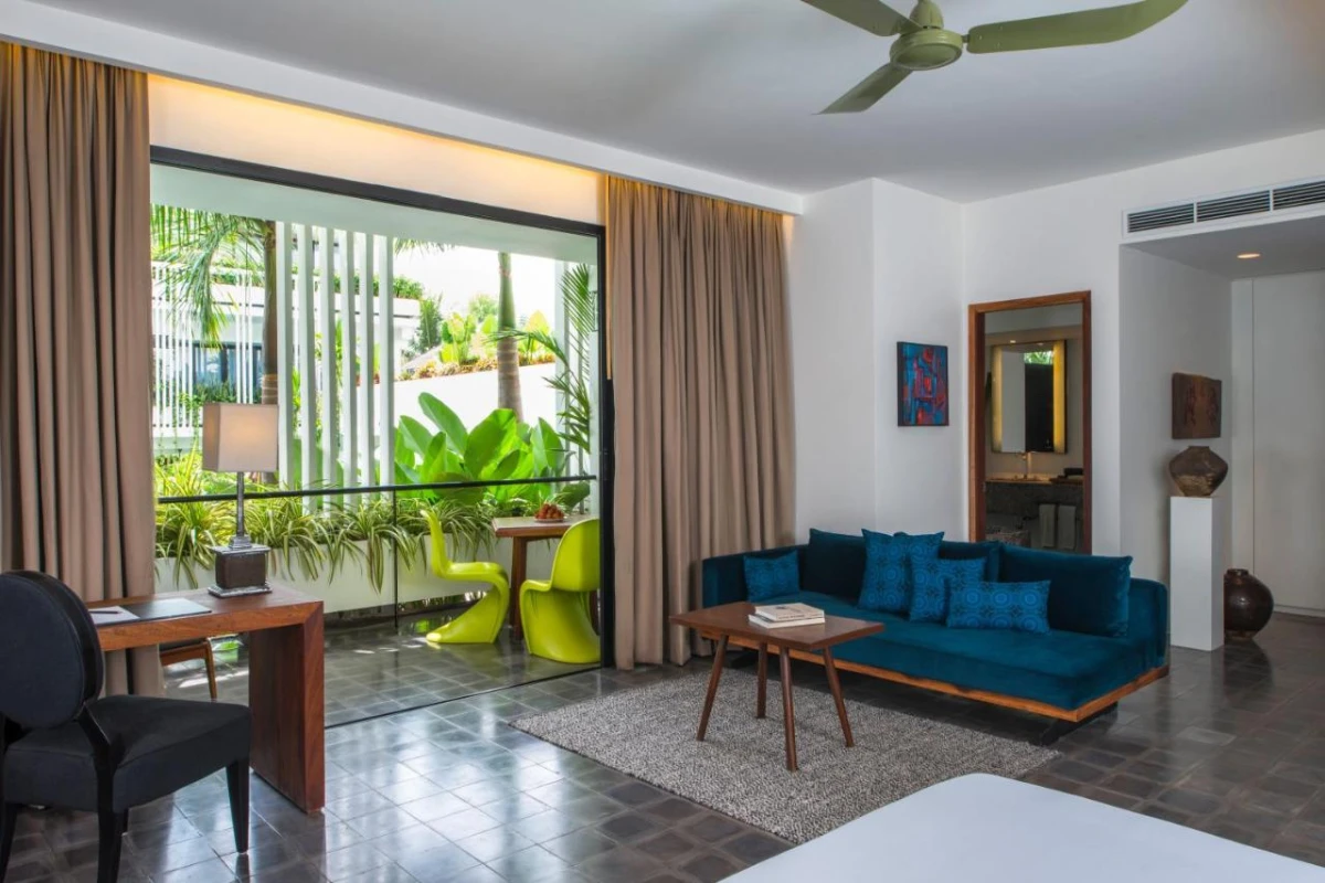 Air-conditioned rooms evoke mid-century motifs through Cambodian artifacts, wardrobes, and laptop-compatible safes, with cozy seating areas equipped with flat-screen satellite televisions and sofas for relaxed evenings. Electric kettles and plush bathrobes add convenience, while en-suite terrazzo bathrooms open to private terraces, offering bathtubs or showers, hairdryers, and complimentary toiletries for a touch of everyday luxury.