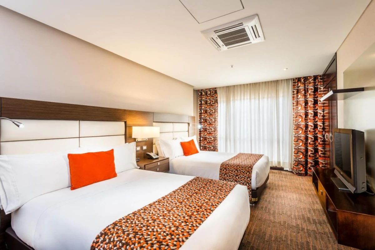 The 326 elegantly designed rooms brim with refined comfort, featuring air-conditioned tranquility, cable TVs, kitchenettes, minibars, spacious seating areas, work desks, and plush bathrooms with premium toiletries. Many rooms offer city views, crafting a serene retreat for professionals, couples, or explorers. An exclusive executive floor elevates the experience with express check-in, a private restaurant, and personalized service. Complimentary Wi-Fi ensures seamless connectivity in this polished haven.
