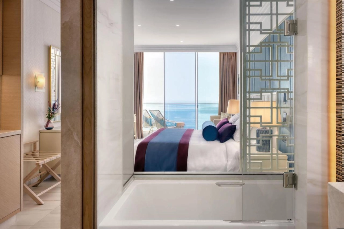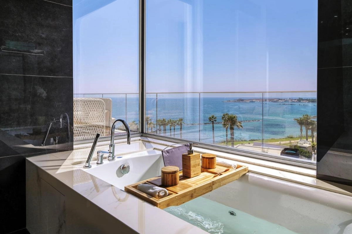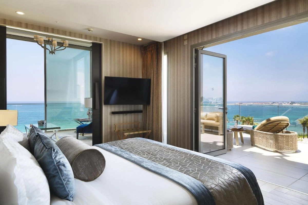 The 155 rooms and suites, each with unobstructed Mediterranean views, blend plush furnishings with private balconies overlooking Paphos' medieval castle and charming harbor. Thoughtful touches like deep soaking bathtubs and artisanal coffee machines create a cozy yet sophisticated ambiance. The Evera Spa pampers with side-by-side massages and tailored therapies, complemented by a serene indoor pool and sauna. The outdoor infinity pool, with its soothing water features and swim-up bar, merges seamlessly with the sea, while assigned sunbeds ensure effortless lounging. A modern fitness centre and direct beach access invite active moments or tranquil strolls along powdery sands.