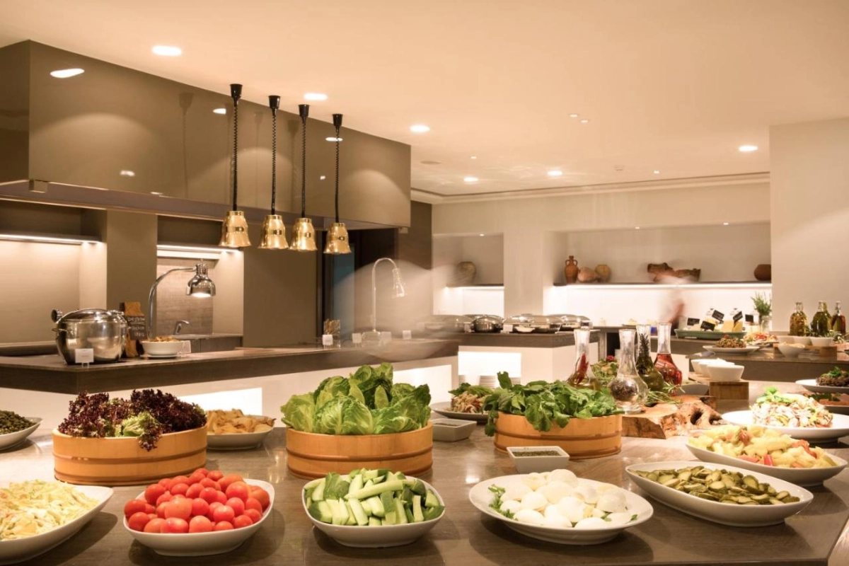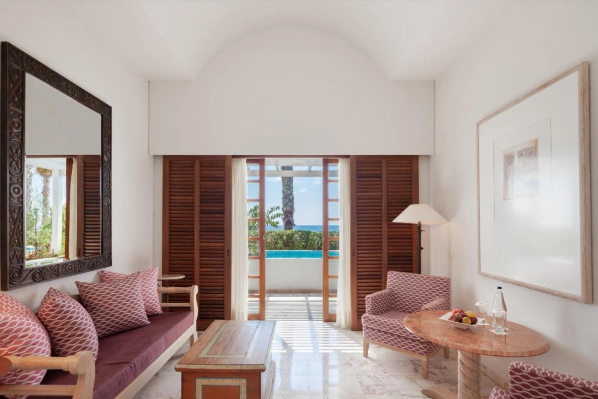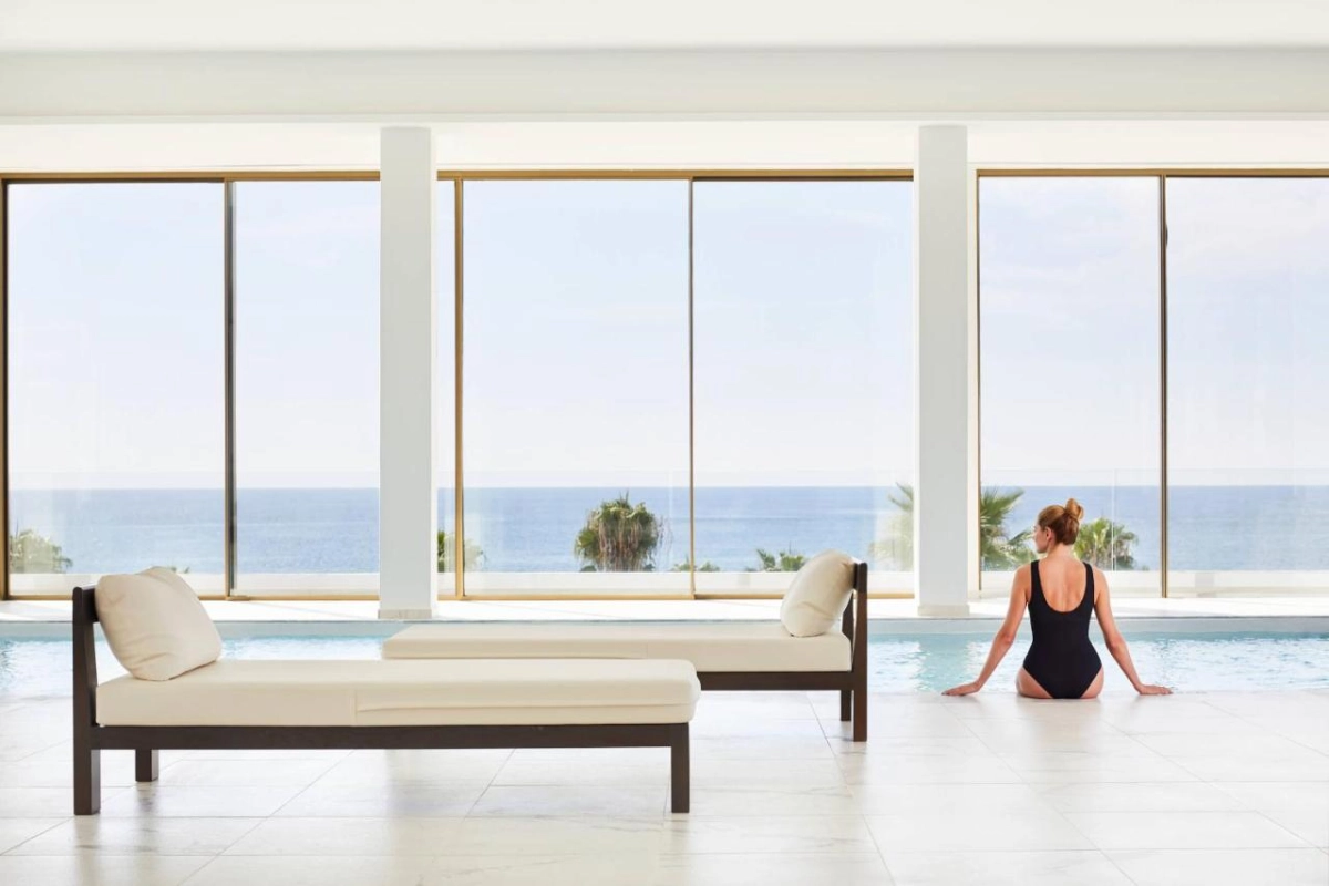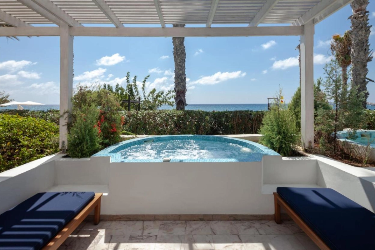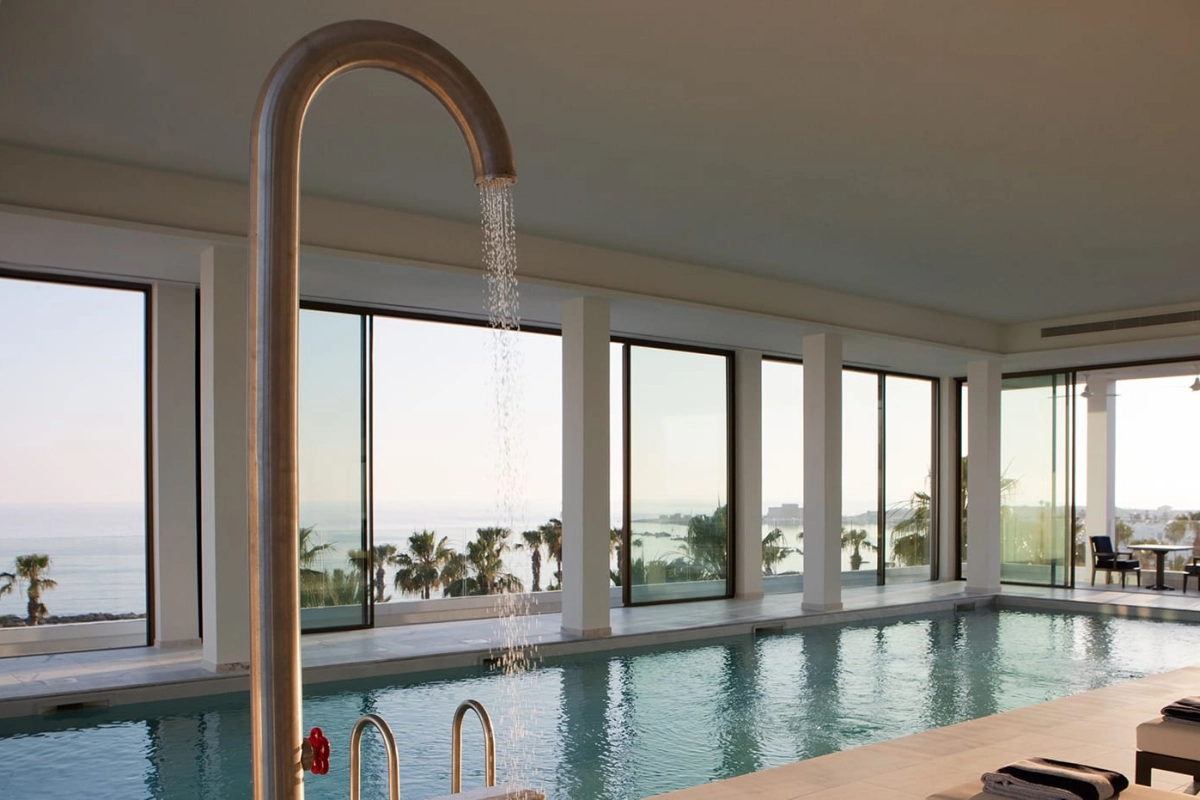 The 218 rooms and suites, adorned with marble accents and plush furnishings, provide serene comfort with private balconies overlooking lush gardens or the azure sea. Each features sumptuous bathrobes, well-stocked minibars, and sleek satellite TVs, ensuring a refined retreat. The Ouranos Wellbeing Spa, an adults-only sanctuary, pampers with tailored treatments, a sauna, steam room, and modern gym, while the rooftop indoor pool offers tranquil escapes. The outdoor pool, framed by cascading waterfalls and swaying palms, invites leisurely lounging, complemented by direct access to a private beach for gentle waves or water sports.
