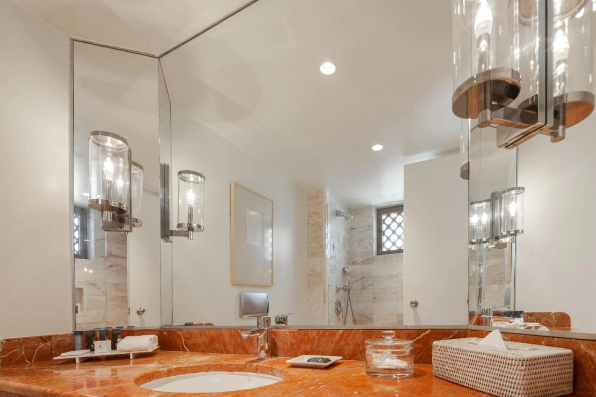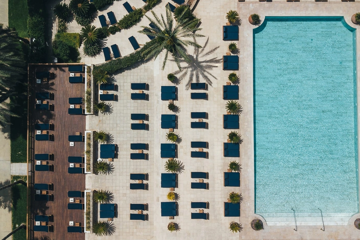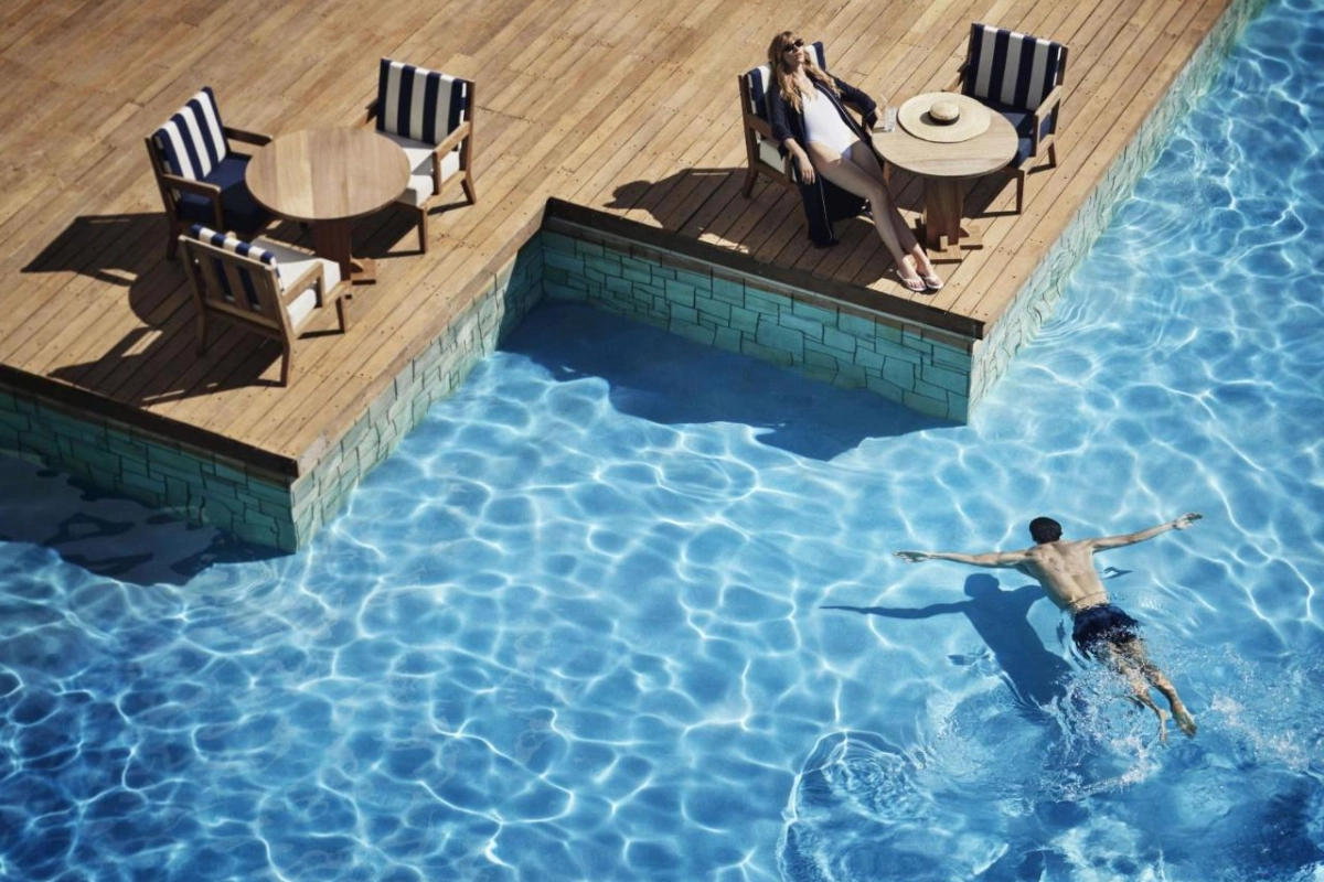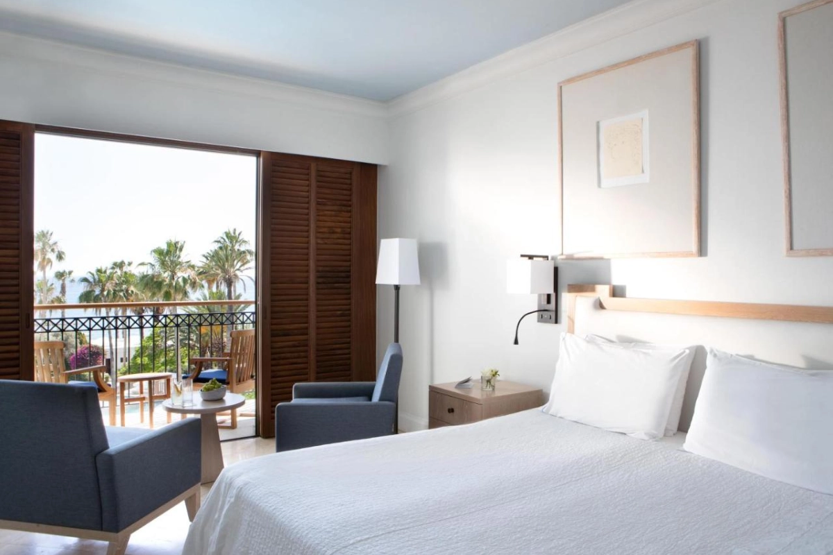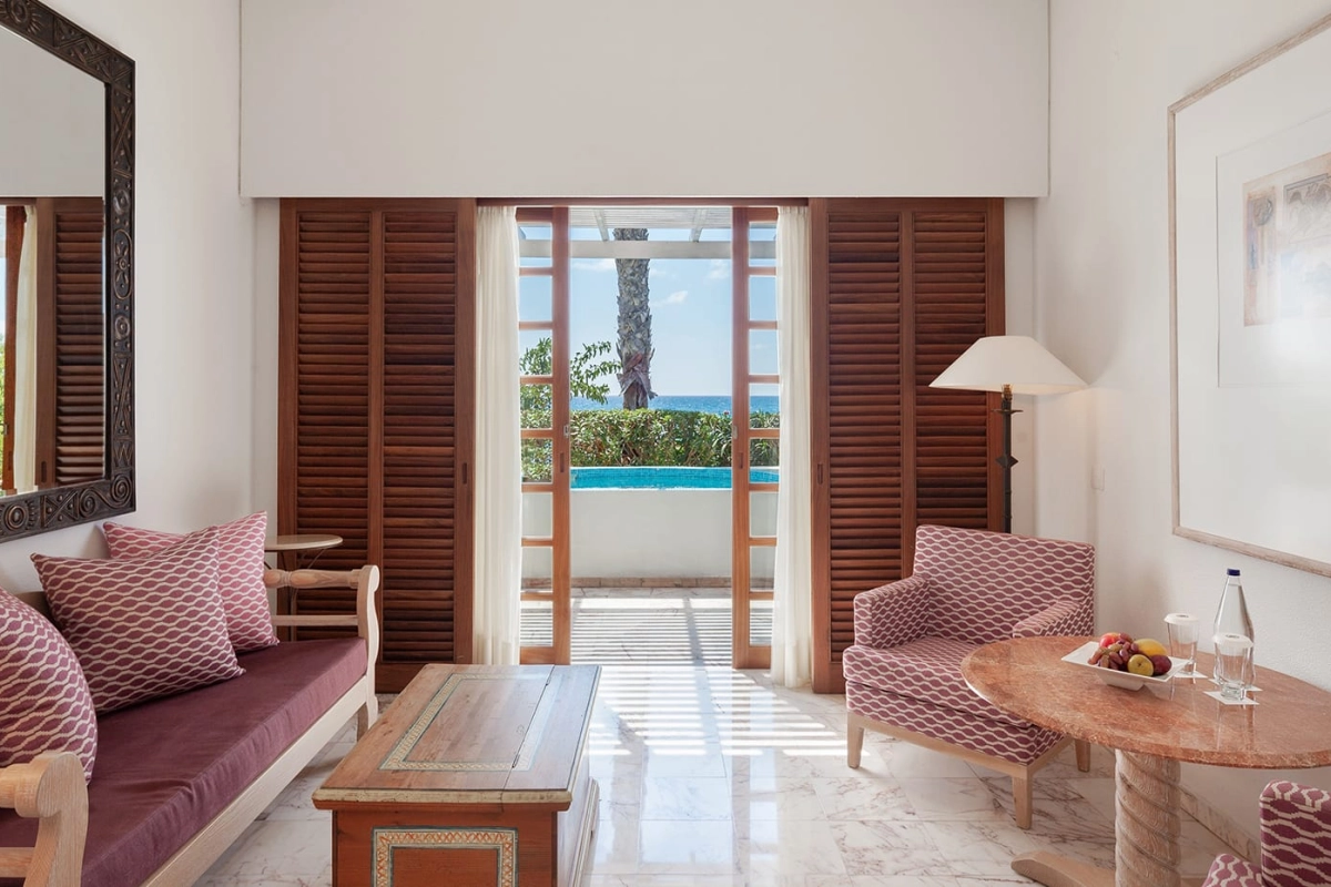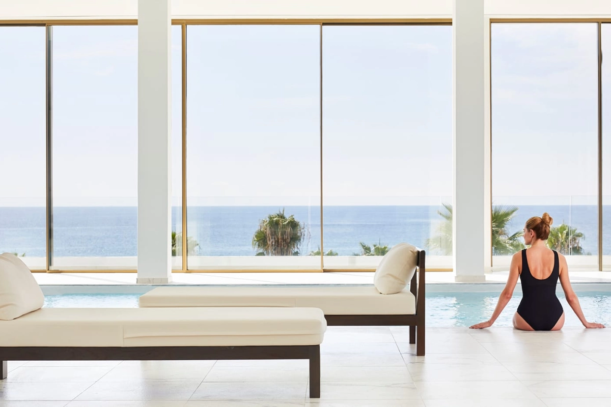 The 218 rooms and suites, adorned with marble accents and plush furnishings, provide serene comfort with private balconies overlooking lush gardens or the azure sea. Each features sumptuous bathrobes, well-stocked minibars, and sleek satellite TVs, ensuring a refined retreat. The Ouranos Wellbeing Spa, an adults-only sanctuary, pampers with tailored treatments, a sauna, steam room, and modern gym, while the rooftop indoor pool offers tranquil escapes. The outdoor pool, framed by cascading waterfalls and swaying palms, invites leisurely lounging, complemented by direct access to a private beach for gentle waves or water sports.
