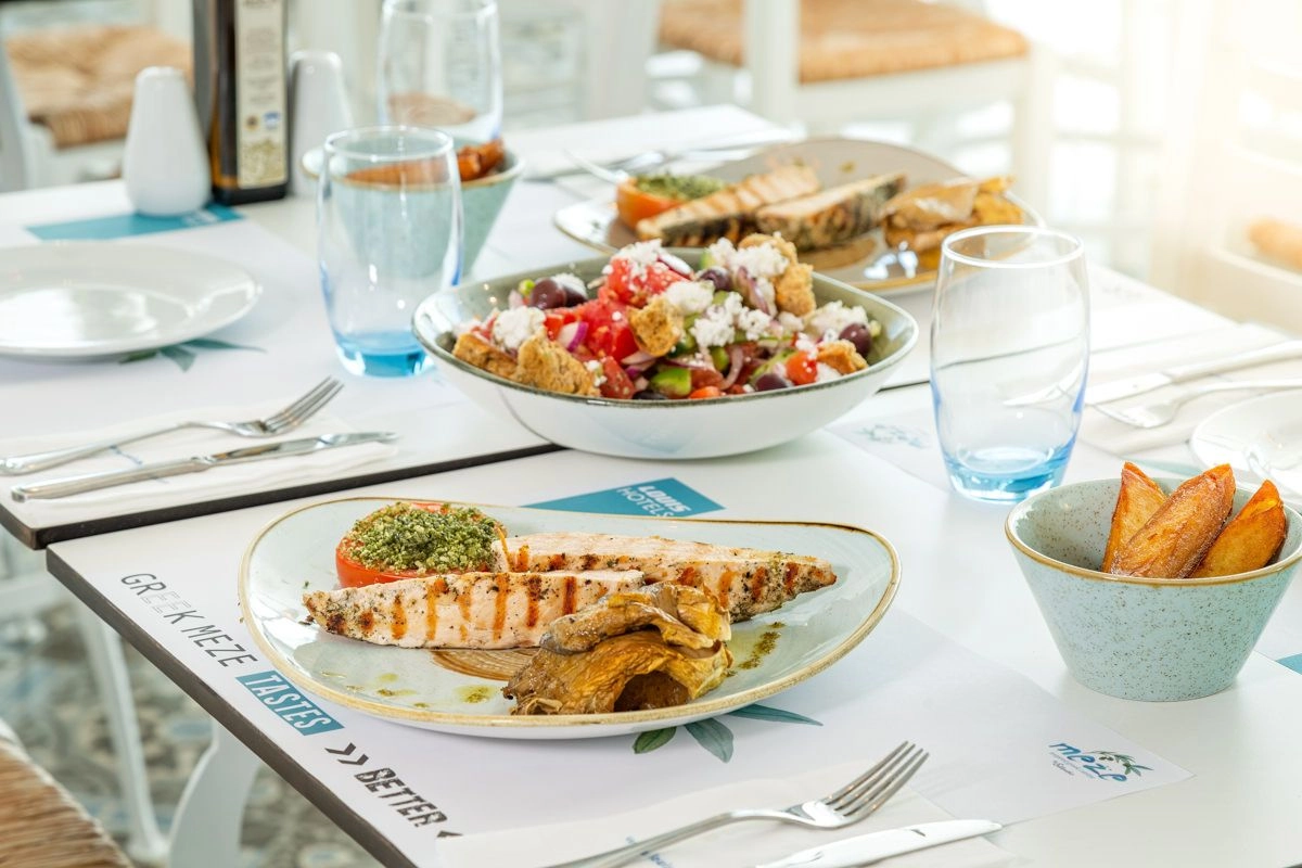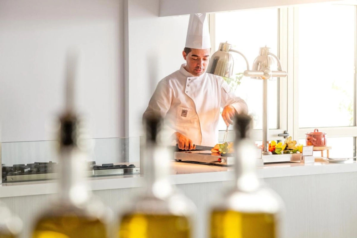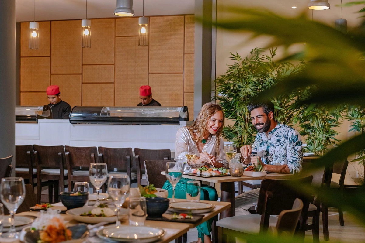 Dining is a culinary delight at Palettes, where daily buffets offer international and Cypriot dishes, from fresh Mediterranean salads to savoury local specialties, served for breakfast, lunch, and dinner with nightly themed menus. Meze by Elliniko crafts an authentic Greek dining experience, featuring cheeses, charcuterie, and shareable plates inspired by Thessaloniki's food markets. Akiko delivers Asian fusion with sushi, sashimi, and dishes like tempura and lemon chicken in a serene setting. The Mirrors Indoor Bar serves morning coffees, afternoon aperitifs, and evening cocktails in an elegant ambiance, while the Utopia Pool Bar offers premium drinks by the outdoor pool. Leisure thrives with a main outdoor pool featuring a 10-seater jacuzzi, an indoor pool, and a wellness centre with sauna, steam bath, and massage services. Evening entertainment, from live music to cultural performances, adds a vibrant touch to the tranquil setting.