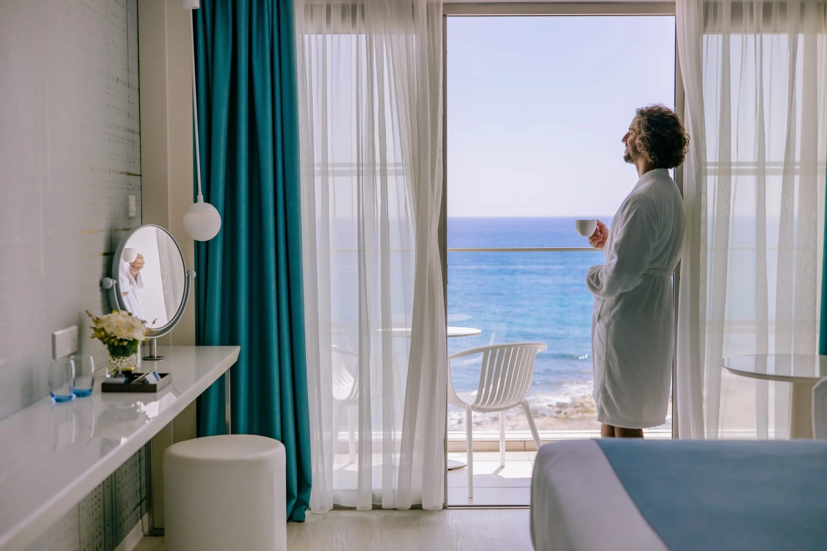 The 148 rooms and suites feature sleek, modern design with air-conditioned comfort, flat-screen TVs with satellite channels, Nespresso machines, minibars, and private bathrooms with baths or showers, complete with bathrobes and slippers. Many rooms open to balconies with sweeping Mediterranean views, creating an intimate retreat for relaxation.