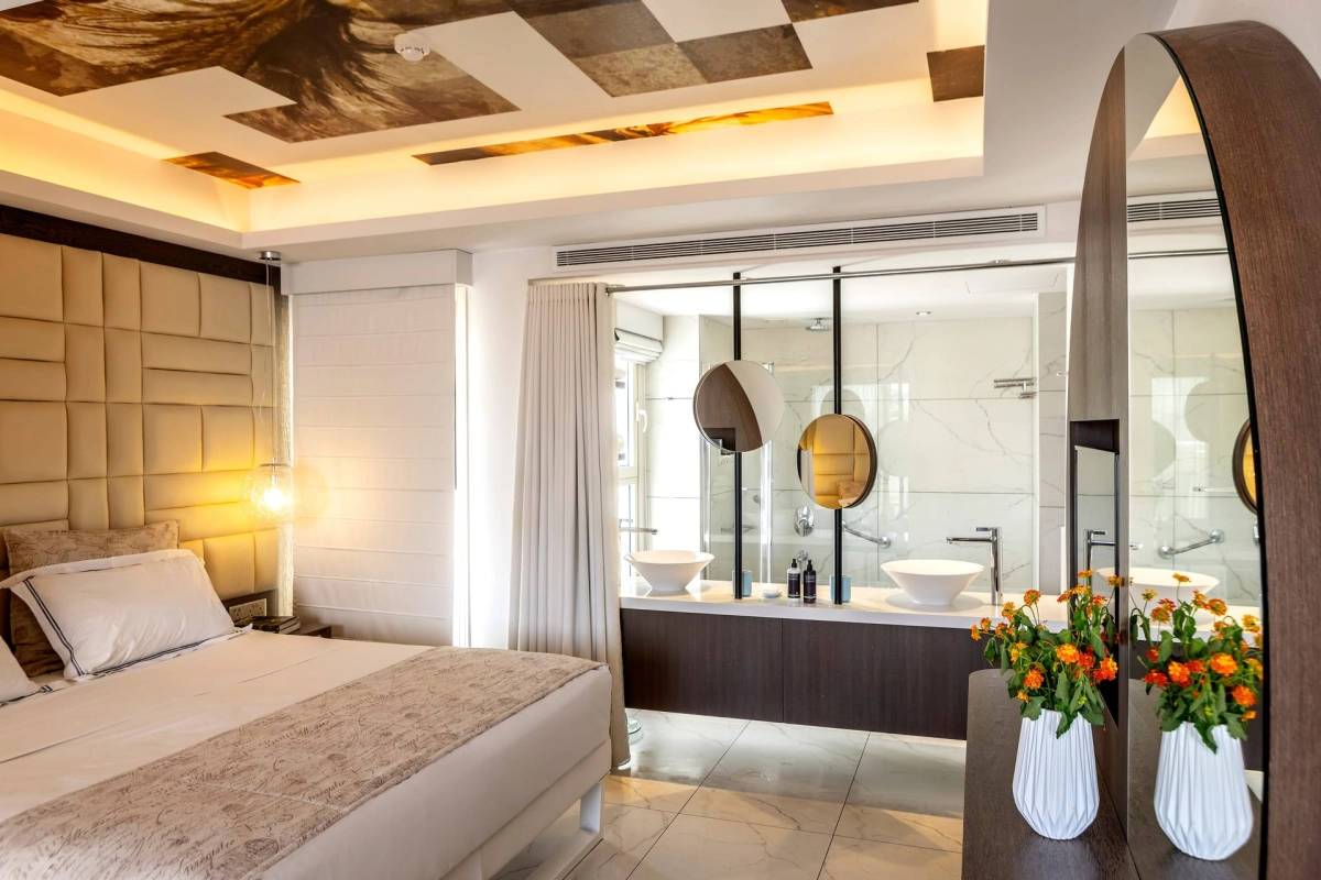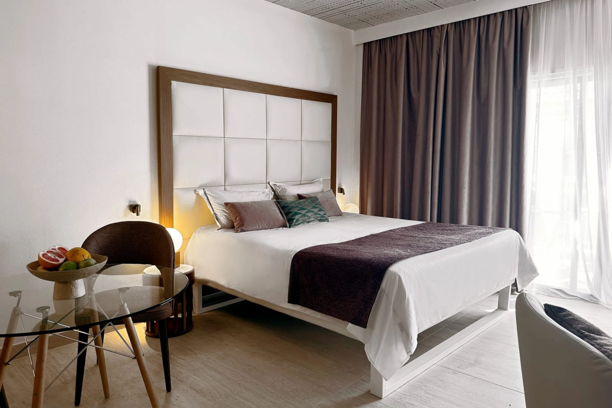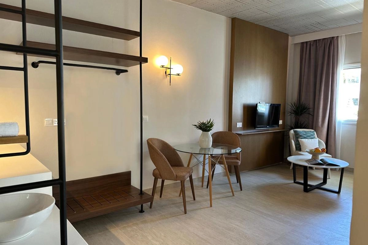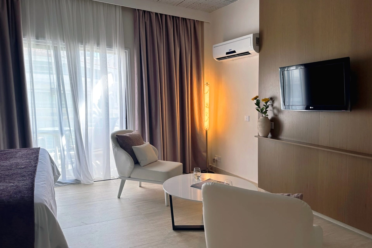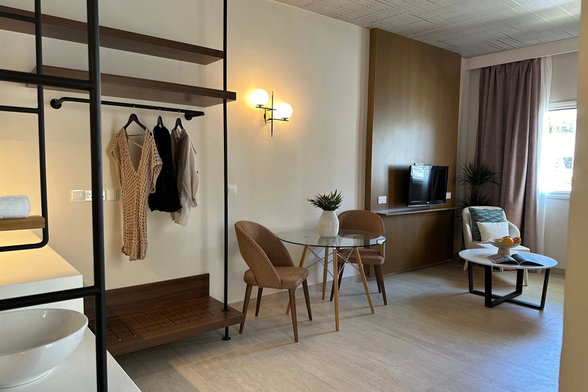 The 78 spacious studios, suites, and apartments are designed with contemporary elegance, featuring air-conditioned comfort, modern kitchens, flat-screen TVs, and fully renovated bathrooms with premium toiletries. Private balconies open to views of lush gardens or the Mediterranean, creating an intimate escape for couples. Guests can opt for tailored meal plans like Premium All-Inclusive for effortless indulgence.