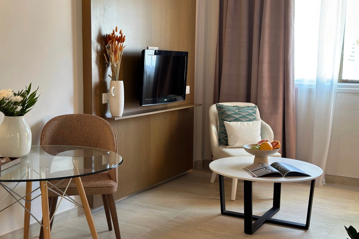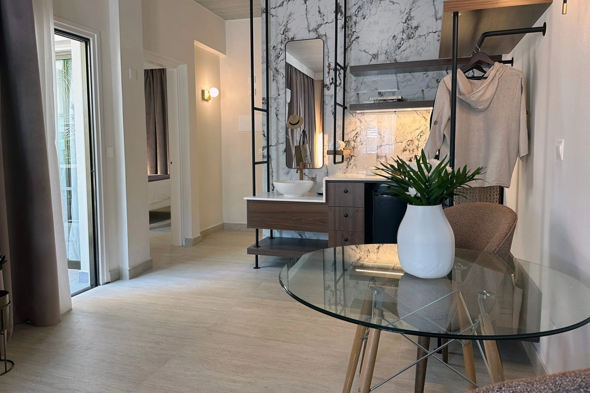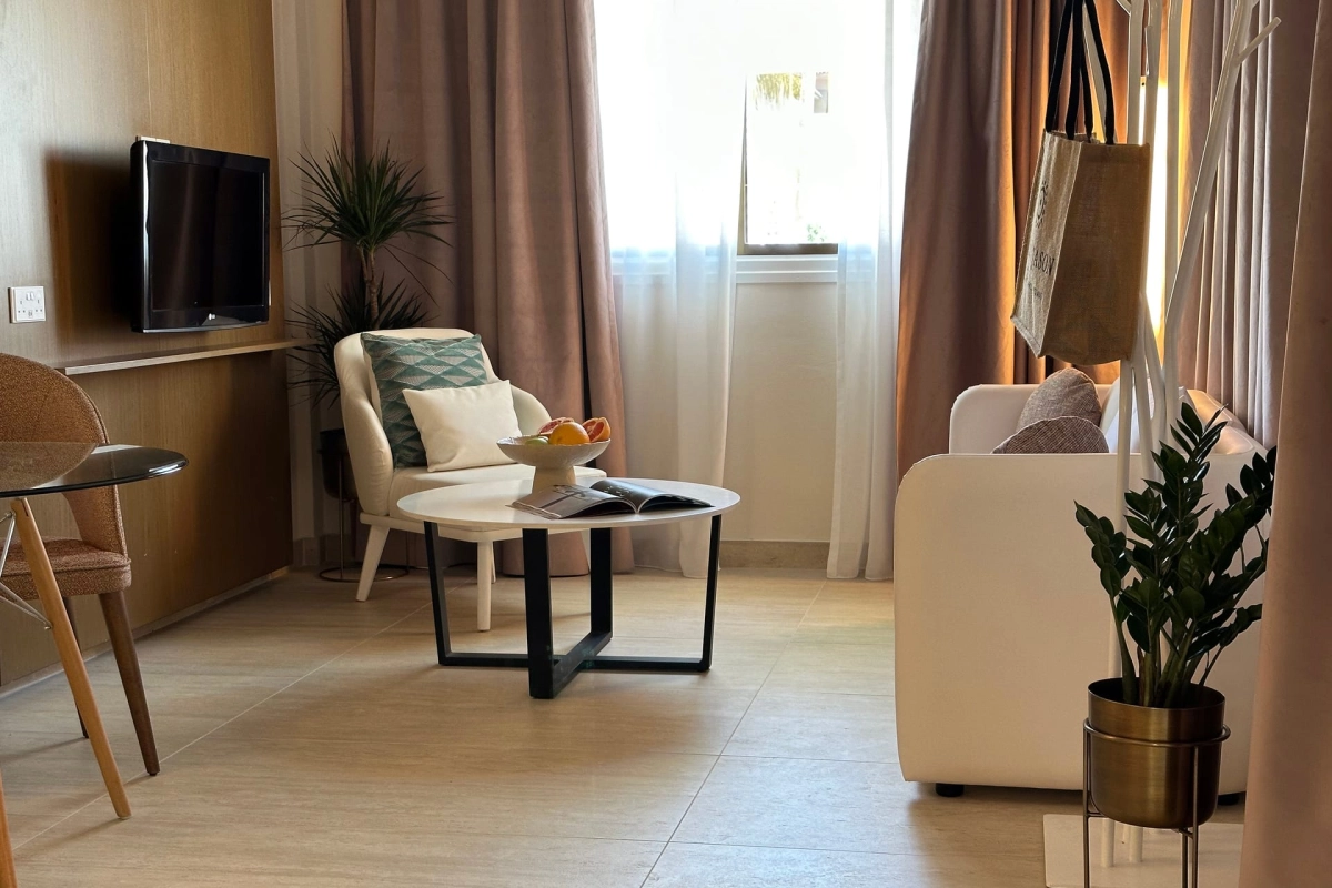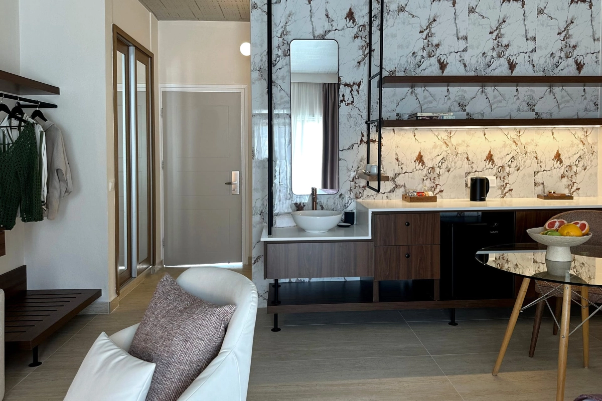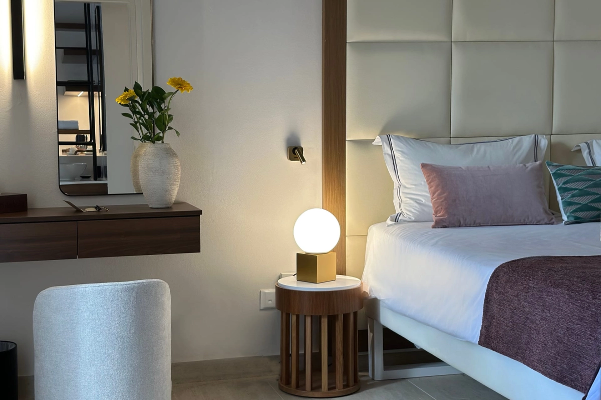The 78 spacious studios, suites, and apartments are designed with contemporary elegance, featuring air-conditioned comfort, modern kitchens, flat-screen TVs, and fully renovated bathrooms with premium toiletries. Private balconies open to views of lush gardens or the Mediterranean, creating an intimate escape for couples. Guests can opt for tailored meal plans like Premium All-Inclusive for effortless indulgence.