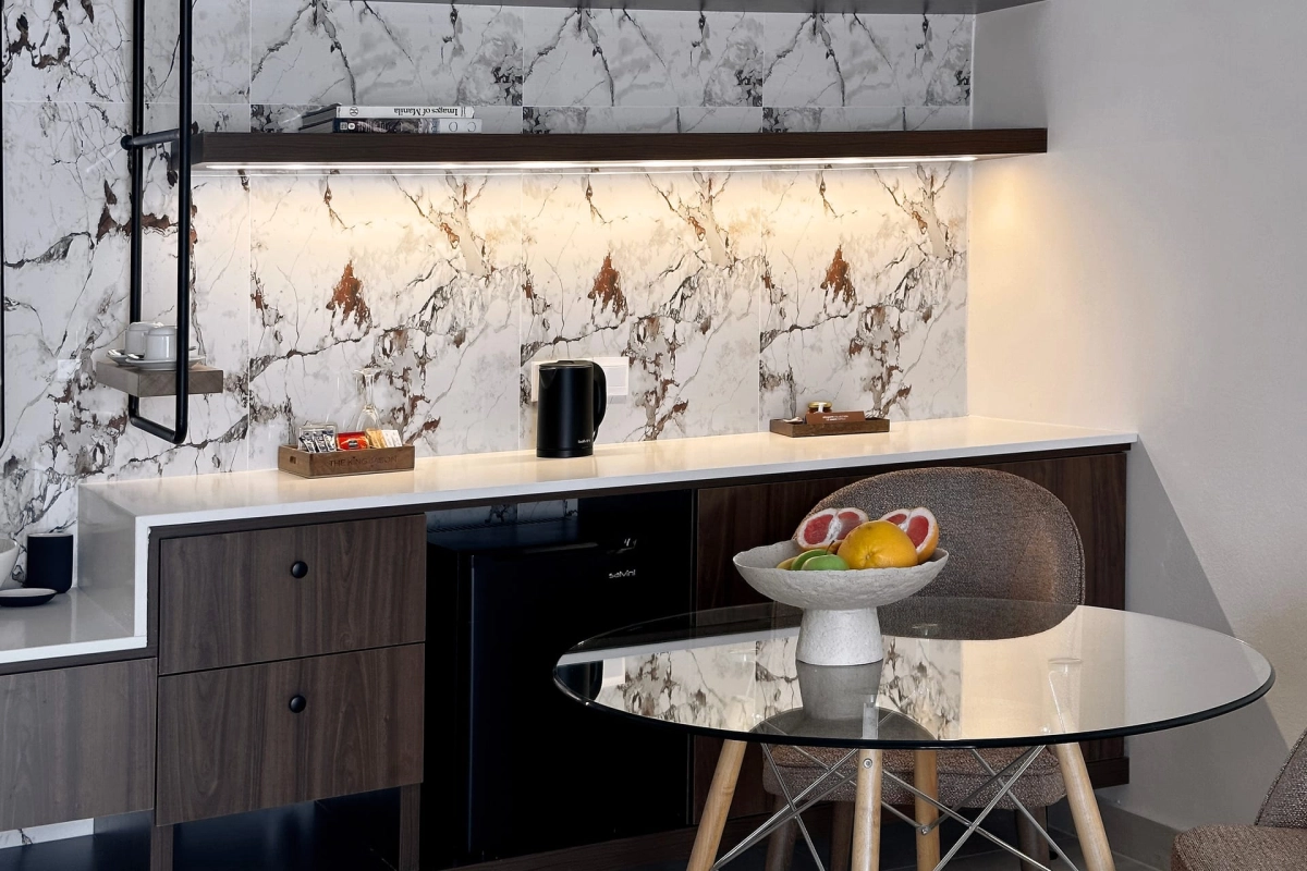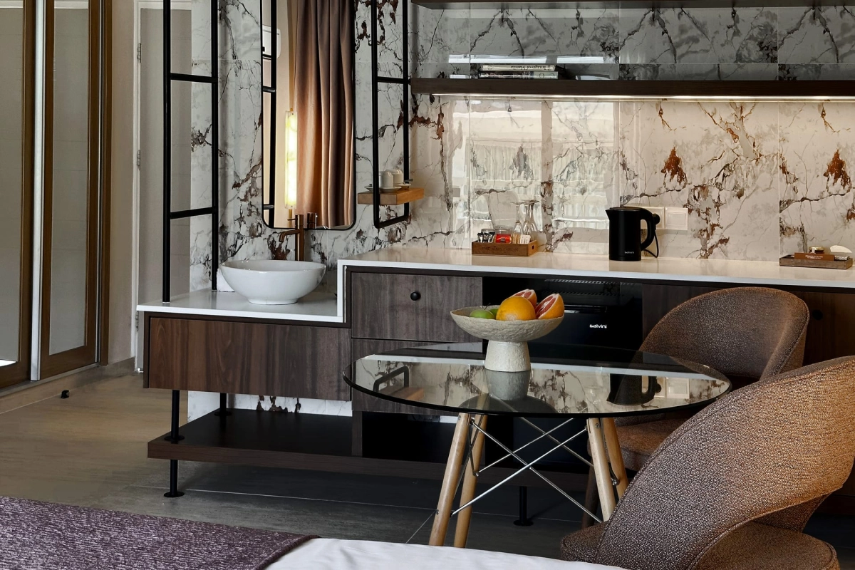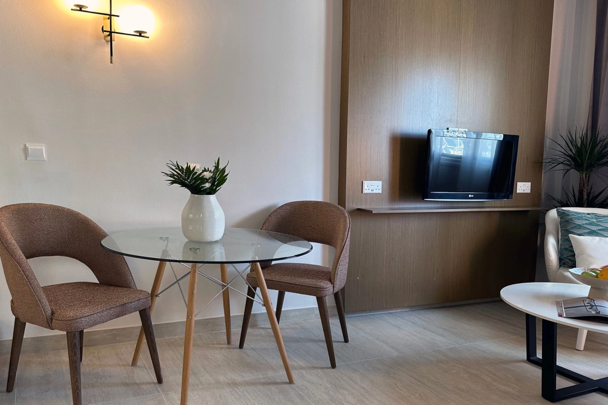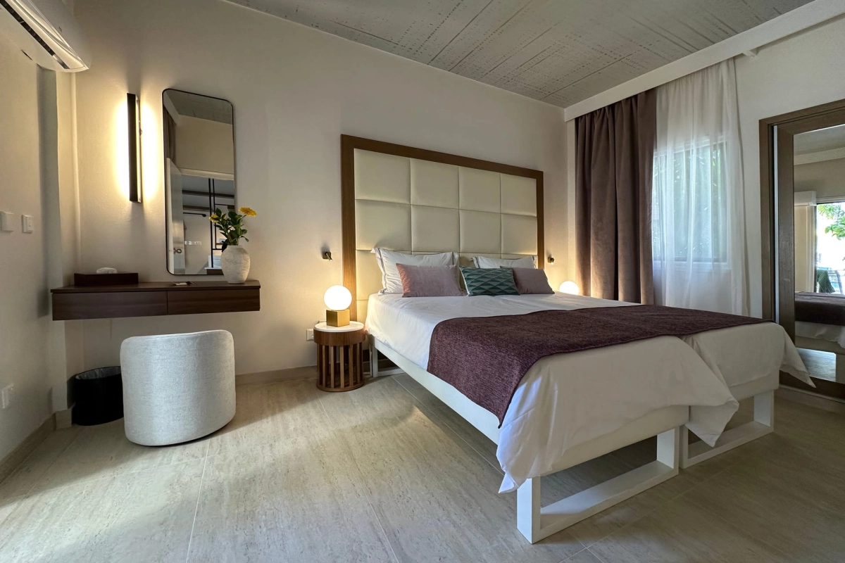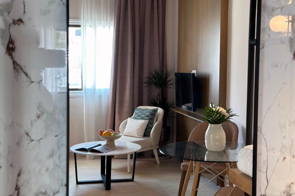 The 78 spacious studios, suites, and apartments are designed with contemporary elegance, featuring air-conditioned comfort, modern kitchens, flat-screen TVs, and fully renovated bathrooms with premium toiletries. Private balconies open to views of lush gardens or the Mediterranean, creating an intimate escape for couples. Guests can opt for tailored meal plans like Premium All-Inclusive for effortless indulgence.