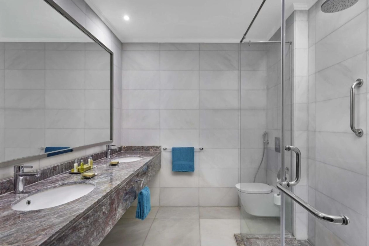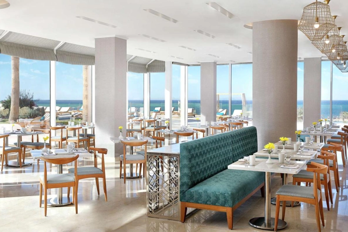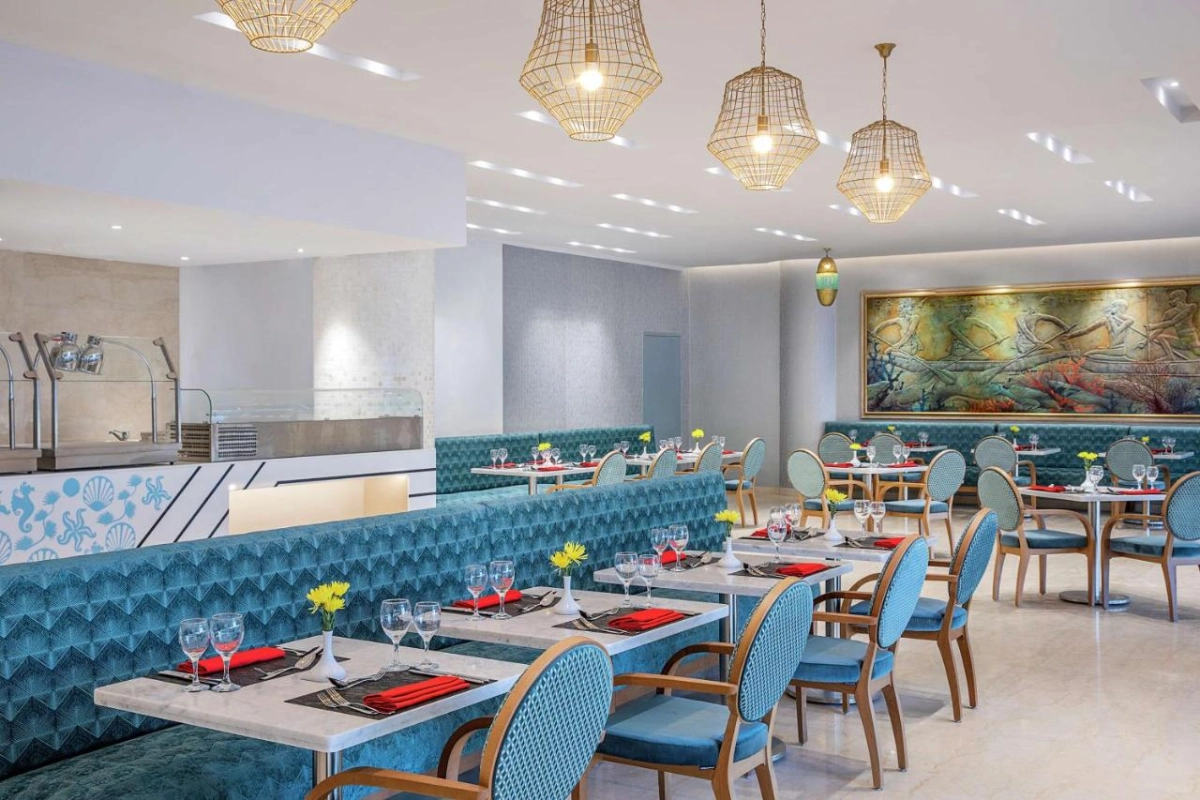 Twelve dining venues offer diverse flavours. Lophelia serves fresh Mediterranean seafood with sea views, while the buffet restaurant provides breakfasts with fresh fruits and international dishes. Bluefin's swim-up bar and Sands Beach Bar craft cocktails and local beers, accompanied by soft oud melodies or live entertainment at the Anaconda Night Club, fostering a warm, festive atmosphere.