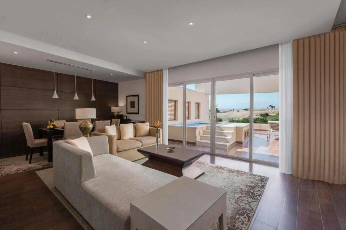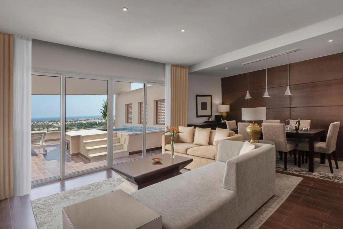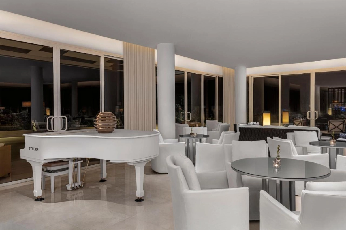 The 93 rooms and suites feature air-conditioned spaces, LED HD TVs, minibars, safes, telephones, and private bathrooms with premium toiletries. Spacious terraces open to views of the golf course or sea, creating a restful sanctuary for couples or travellers. A vast outdoor pool and free Wi-Fi ensure a seamless blend of relaxation and connectivity.