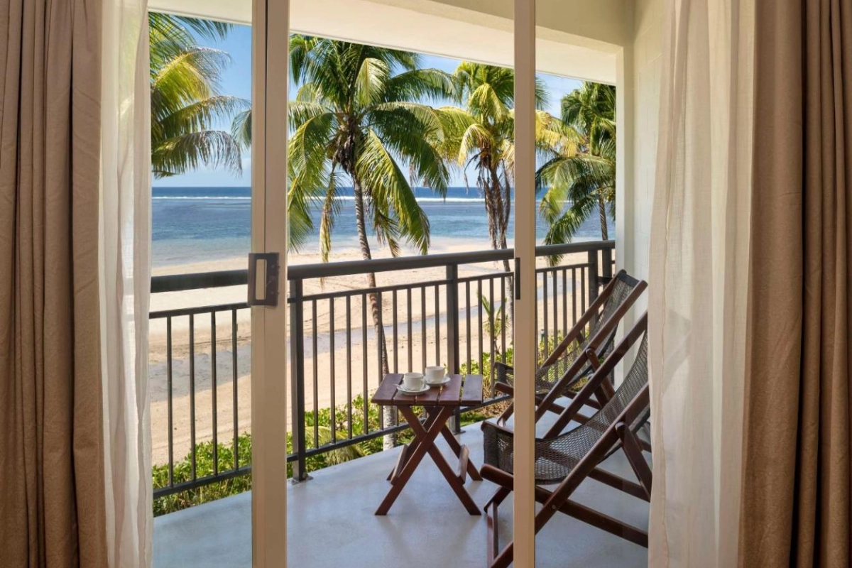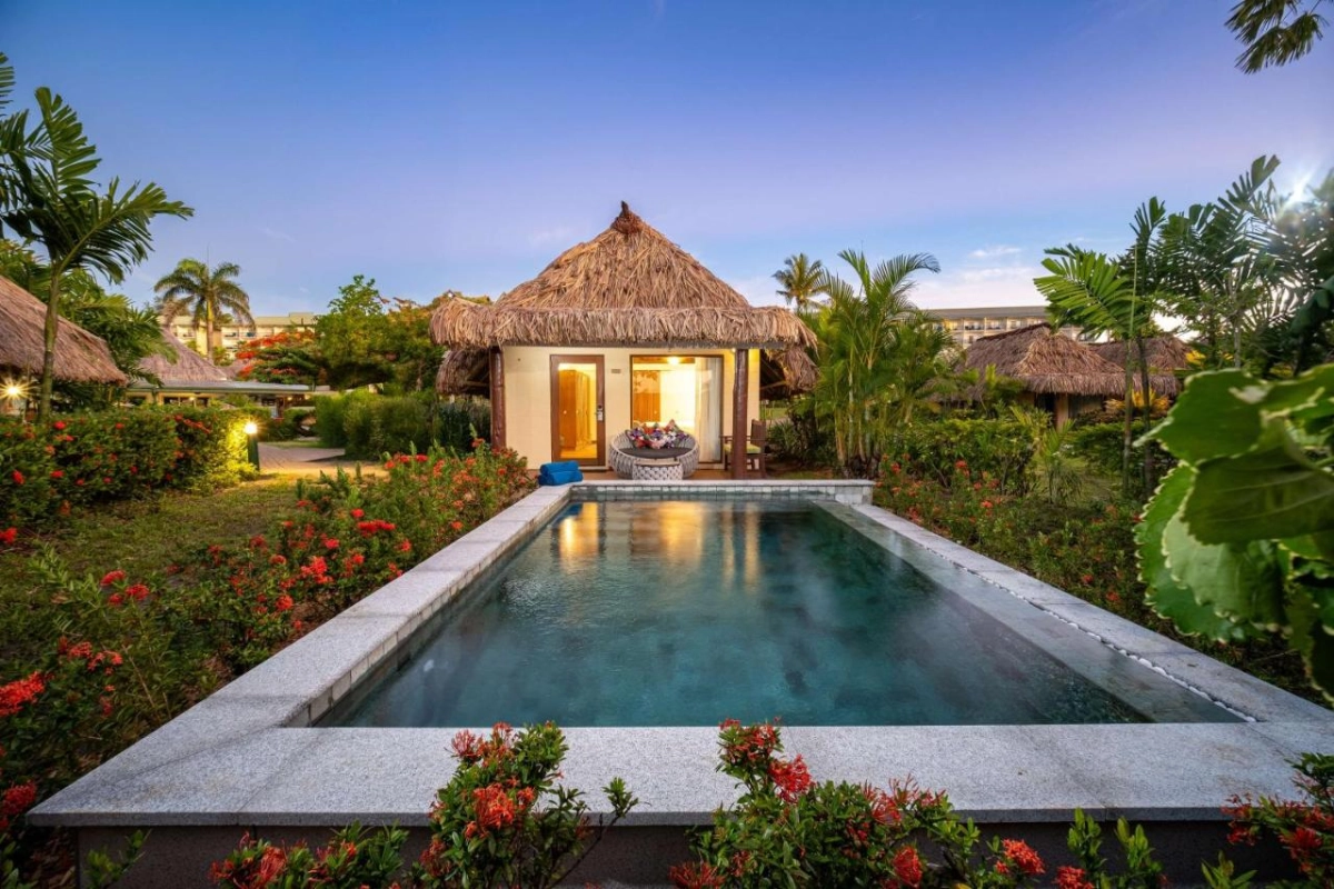 Outrigger Fiji Beach Resort, a radiant five-star retreat on Viti Levu's Coral Coast, Fiji, nestles amid 40 acres of swaying palm trees and lush tropical gardens, offering hillside rooms, thatched plantation bures, and beachfront bures with private pools, all echoing the charm of a traditional Fijian village.