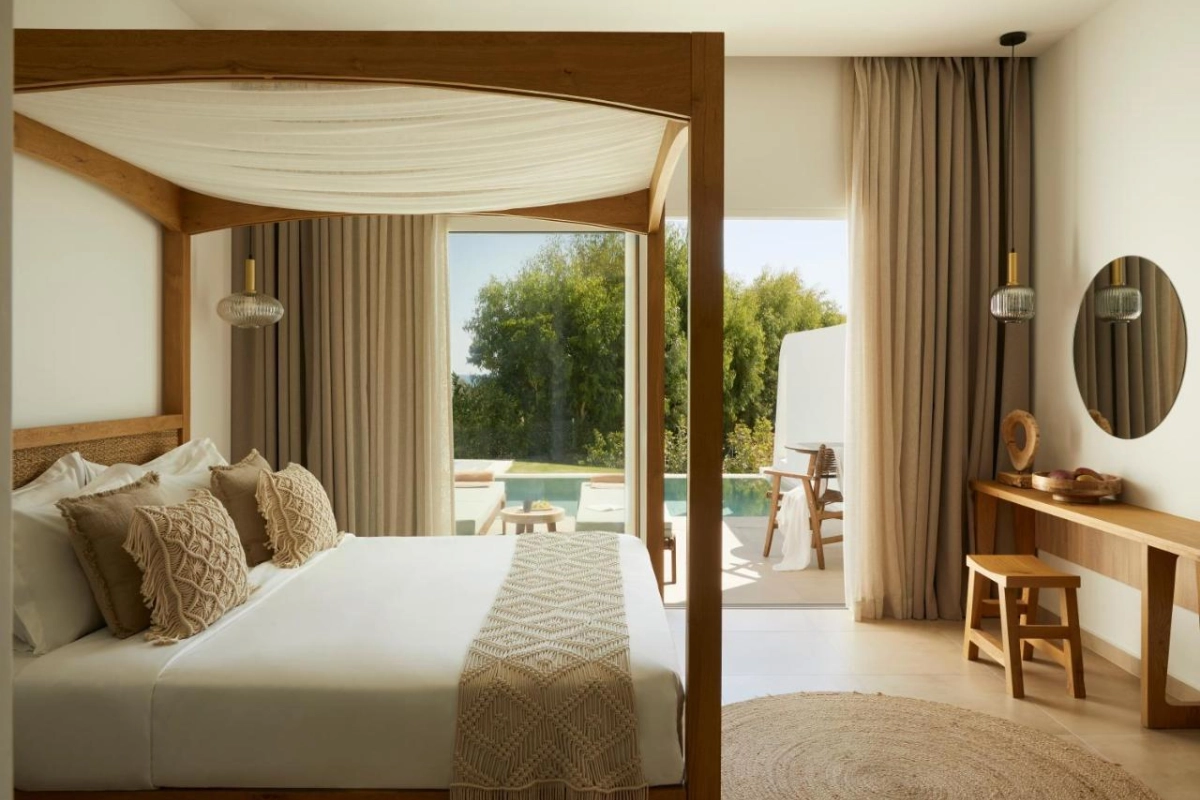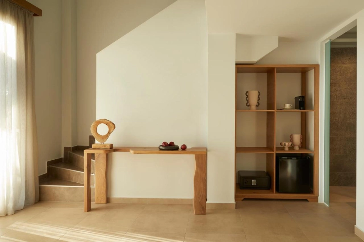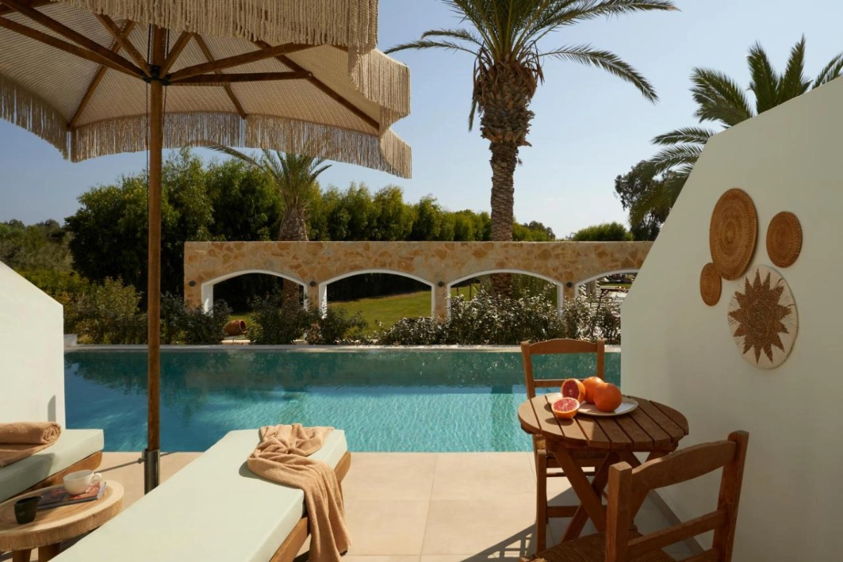 The 91 exquisitely designed rooms and suites feature air-conditioned comfort, flat-screen TVs, kettles, refrigerators, safes, and modern bathrooms with artisanal toiletries. Select suites boast private pools or open-air whirlpools, creating intimate sanctuaries steps from the sea. The lagoon-inspired main pool, surrounded by plush sunbeds and a sun terrace, invites leisurely days, while concierge services arrange tailored experiences like private boat trips or cultural tours to nearby villages.