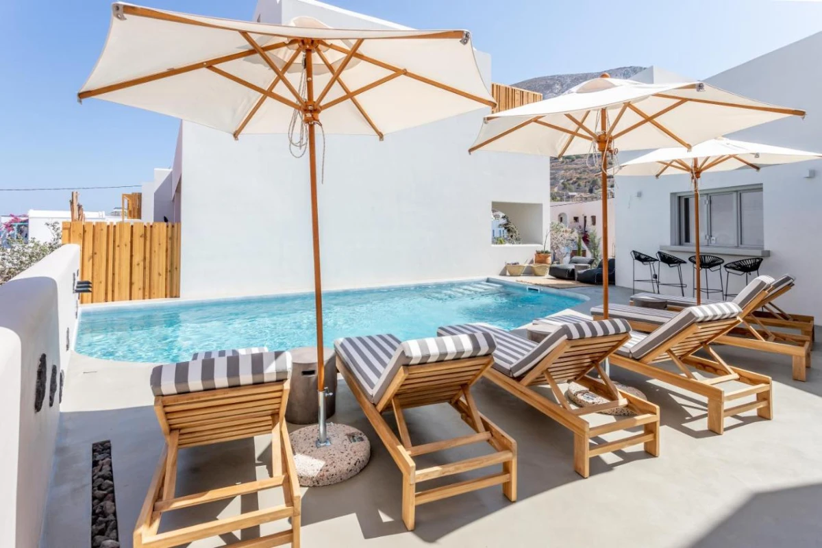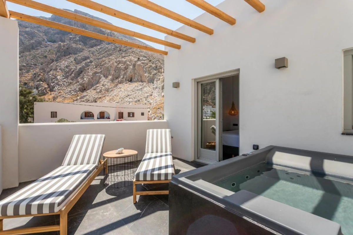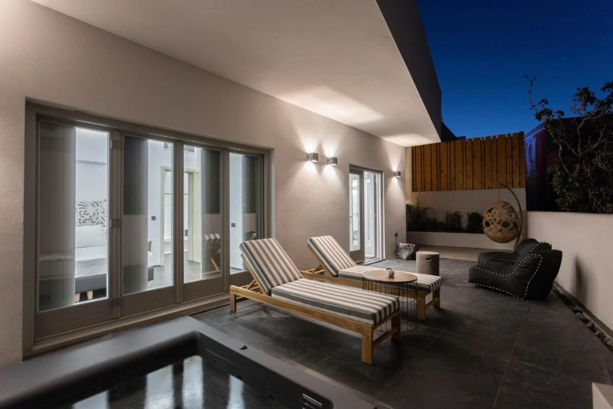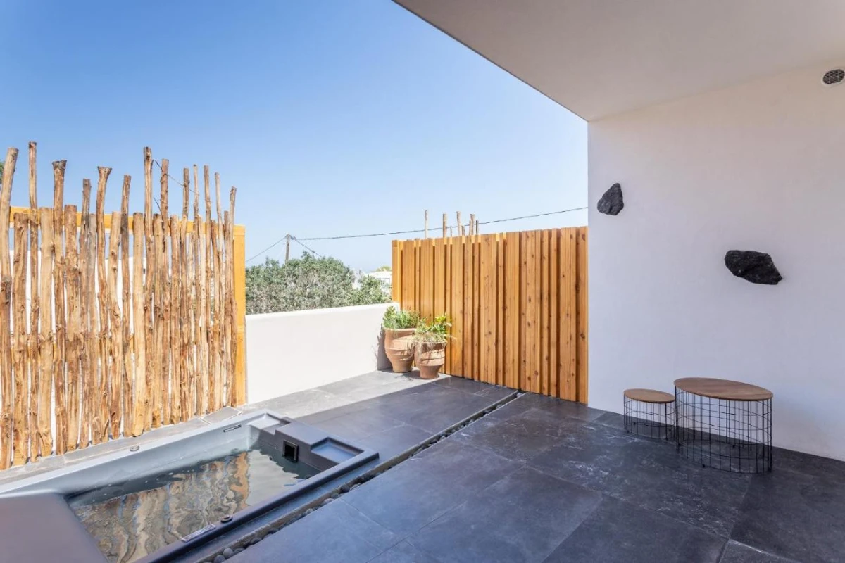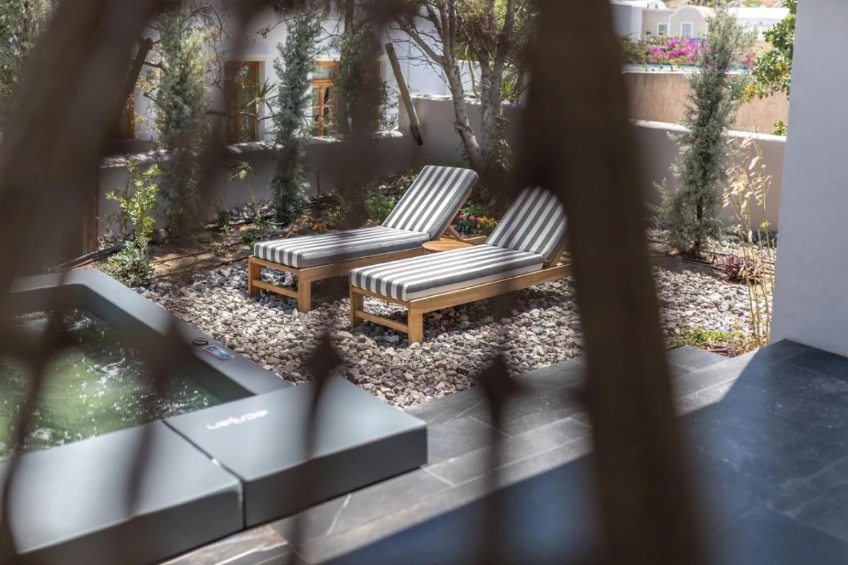 The 20 exquisitely crafted rooms and suites feature minimalist decor in soothing tones, equipped with air-conditioned comfort, flat-screen televisions, coffee machines, fridges, and luxurious bathrooms with premium toiletries and showers. Many accommodations include private outdoor hot tubs and balconies, unveiling captivating views of Santorini's majestic mountains or lush surroundings, creating an intimate retreat for relaxation.