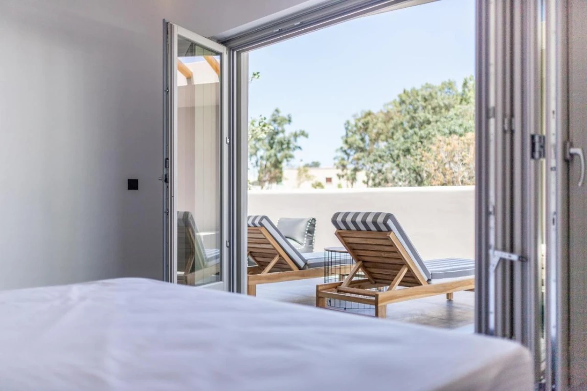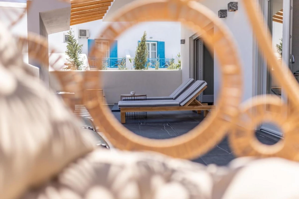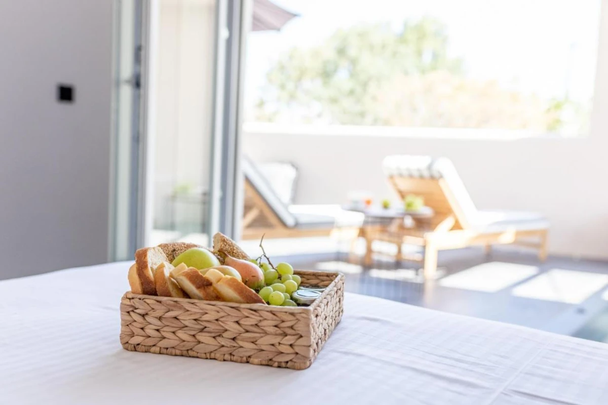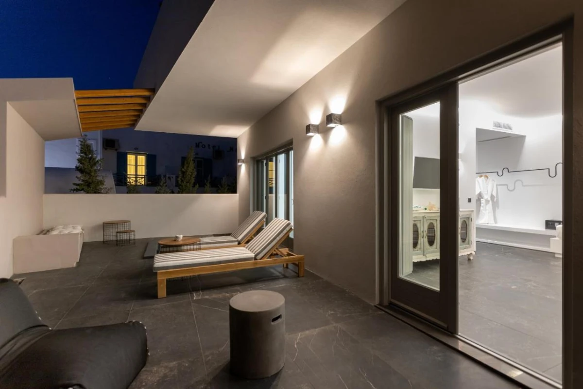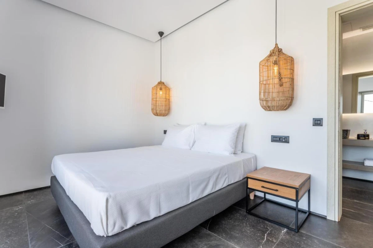The 20 exquisitely crafted rooms and suites feature minimalist decor in soothing tones, equipped with air-conditioned comfort, flat-screen televisions, coffee machines, fridges, and luxurious bathrooms with premium toiletries and showers. Many accommodations include private outdoor hot tubs and balconies, unveiling captivating views of Santorini's majestic mountains or lush surroundings, creating an intimate retreat for relaxation.