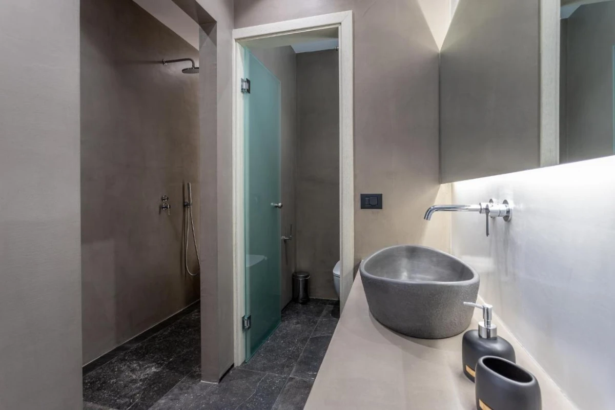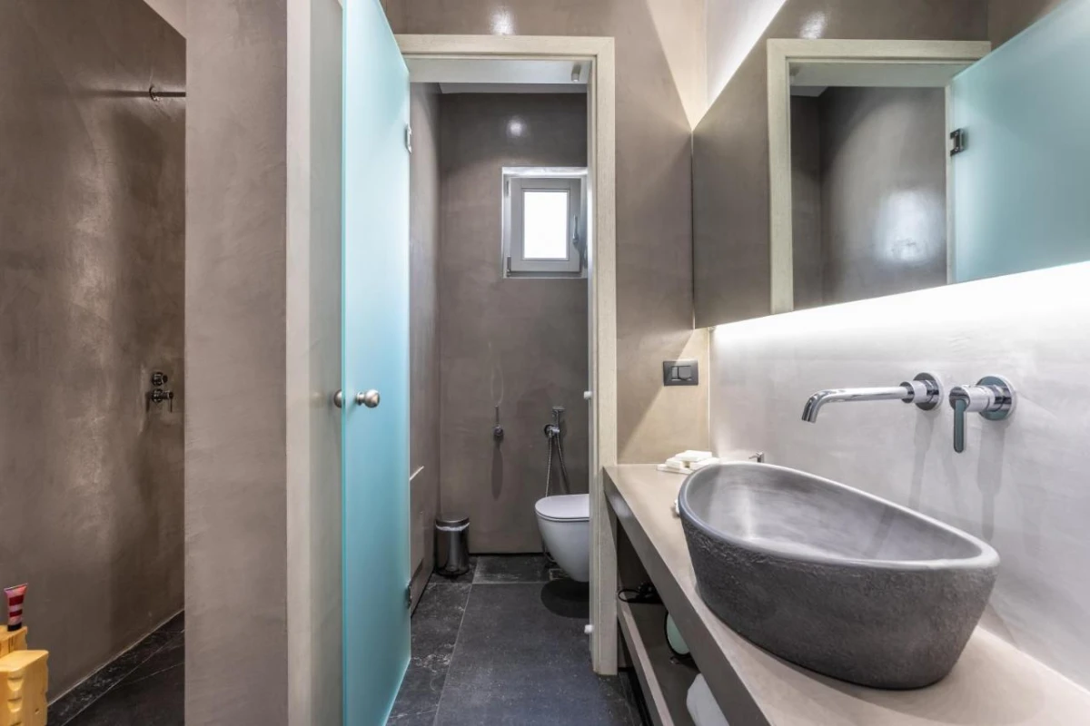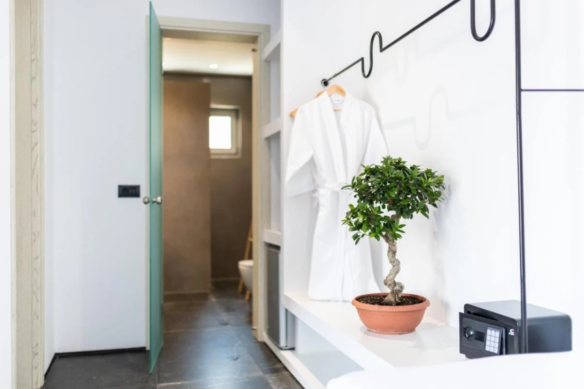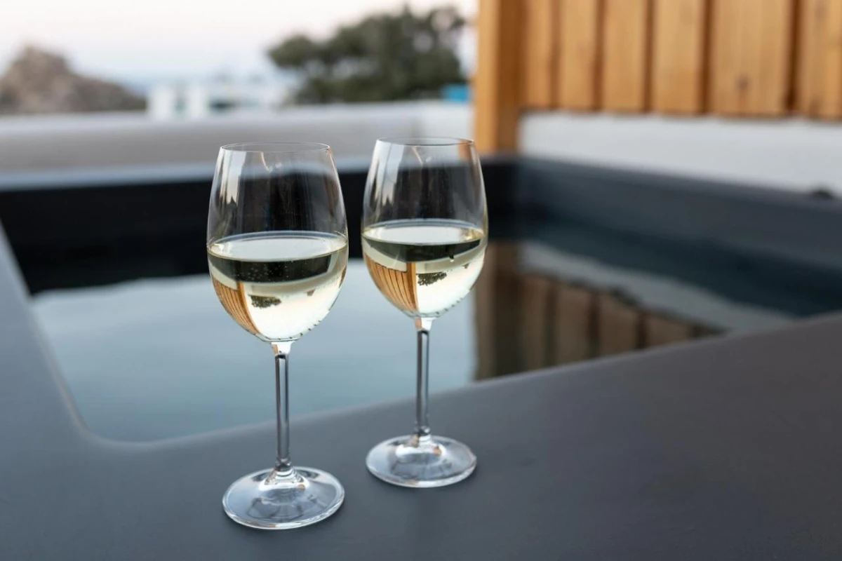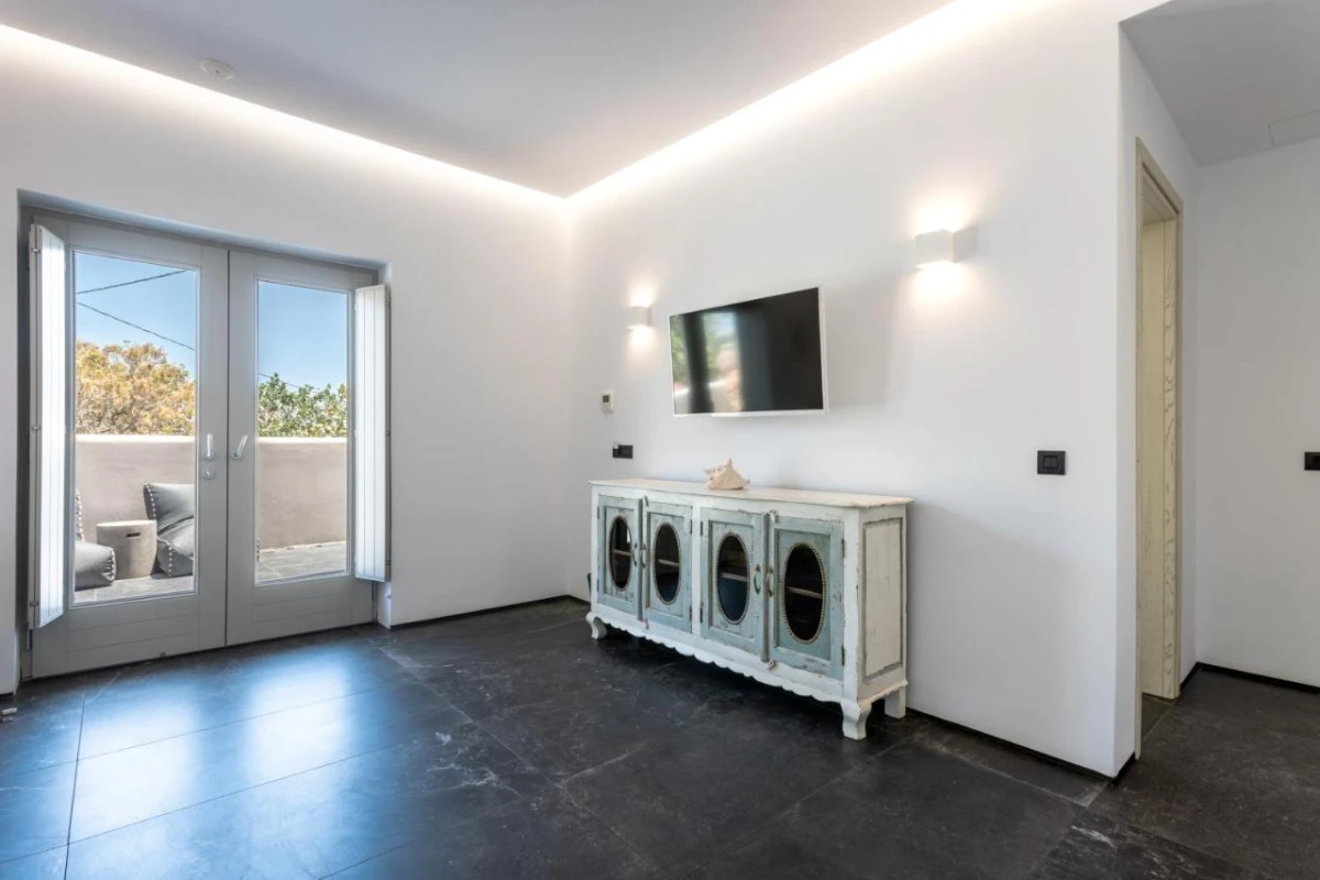 The 20 exquisitely crafted rooms and suites feature minimalist decor in soothing tones, equipped with air-conditioned comfort, flat-screen televisions, coffee machines, fridges, and luxurious bathrooms with premium toiletries and showers. Many accommodations include private outdoor hot tubs and balconies, unveiling captivating views of Santorini's majestic mountains or lush surroundings, creating an intimate retreat for relaxation.