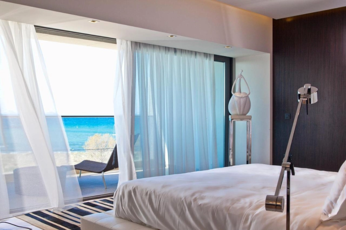 The 53 modern rooms and suites feature air-conditioned elegance, flat-screen satellite televisions, laptop-sized safes, and private bathrooms with bathrobes, slippers, and premium toiletries. Each opens to a balcony or living area with views of the Aegean Sea or pool, with select units offering spa baths or private pools, crafted to evoke light and tranquility.