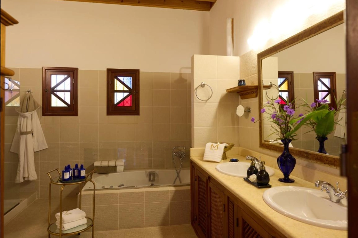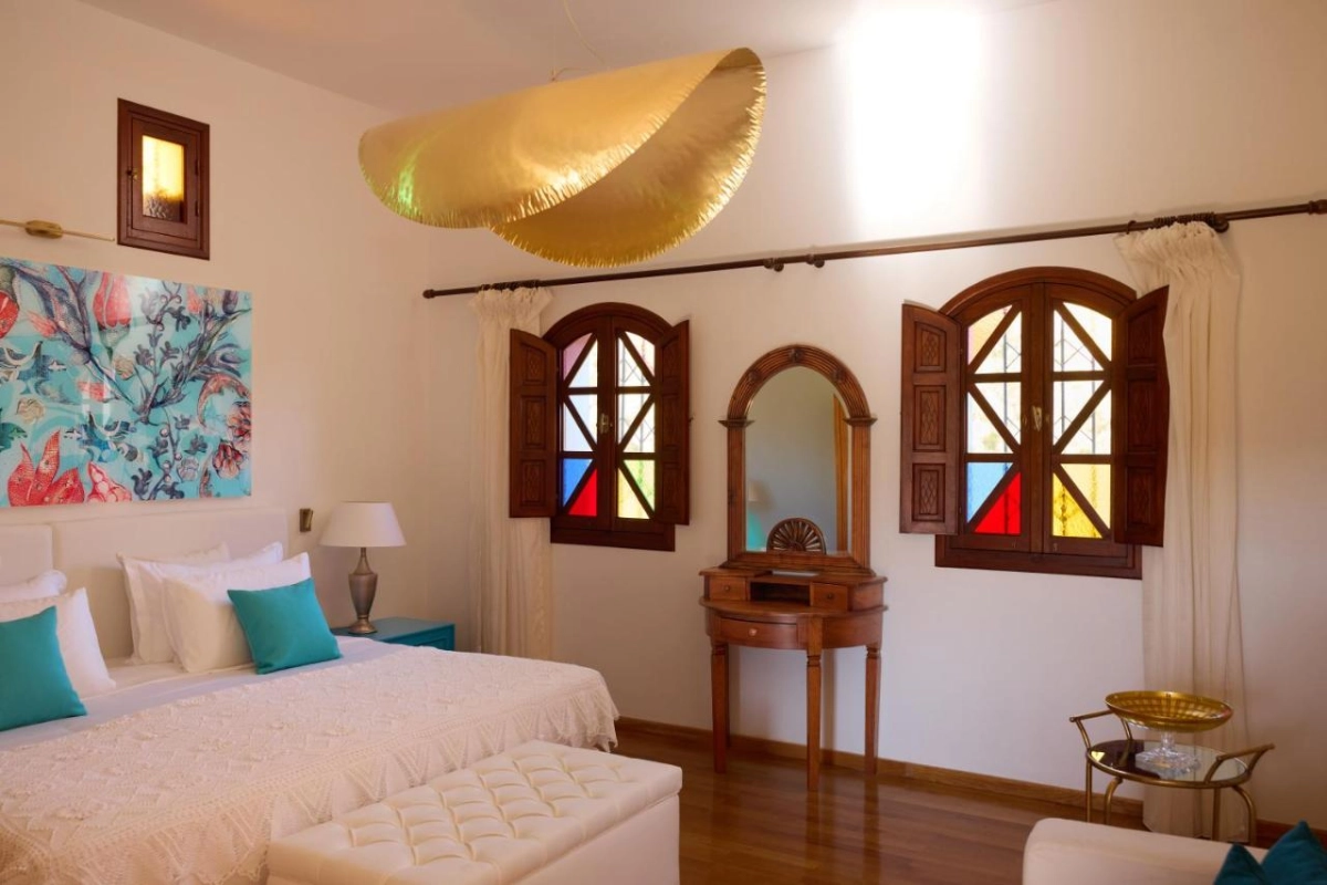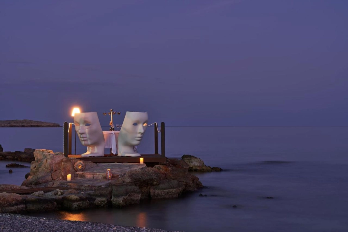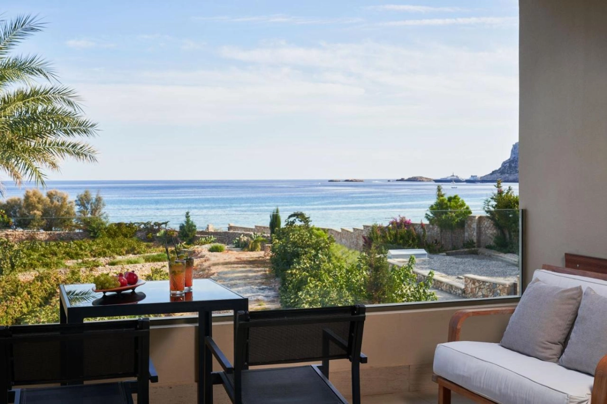 The 136 elegantly appointed rooms and suites feature air-conditioned comfort, flat-screen satellite televisions, minibars, sofas, and private bathrooms with premium toiletries. Each opens to a private balcony with sweeping Aegean Sea views, with select suites boasting private pools or spacious terraces, blending seamlessly with the island's natural beauty.