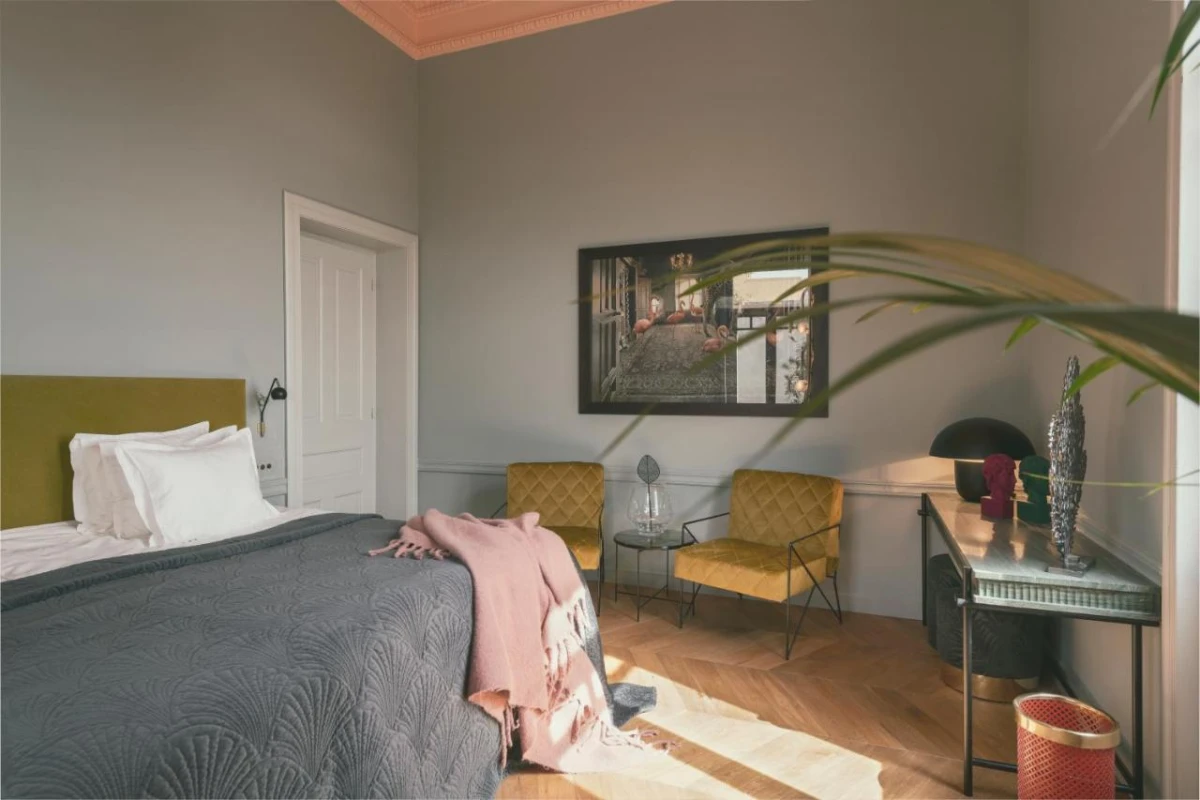 The nine exquisite suites feature celebrated interior design pieces, private art collections, air conditioning, sleek desks, wardrobes, and luxurious bathrooms with showers and premium toiletries. Many suites offer balconies with captivating views of the city or Aegean Sea, creating an elegant and airy retreat.