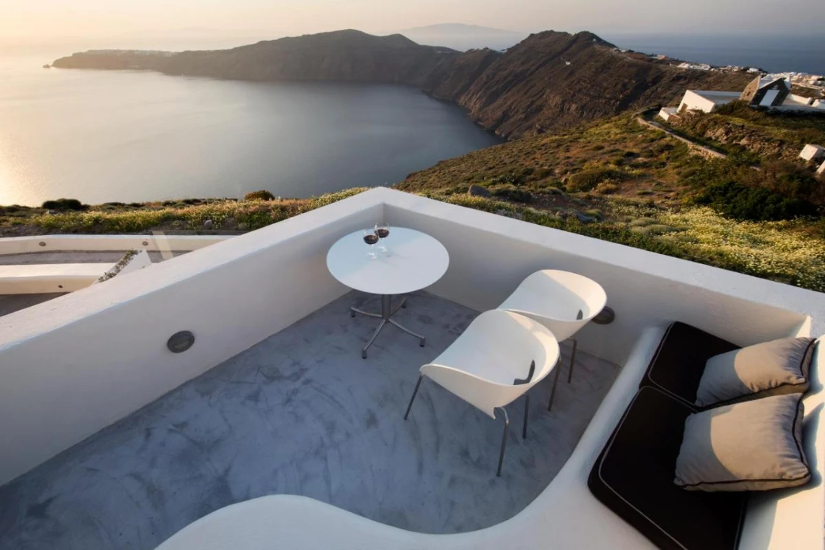 The 20 exquisitely designed rooms and suites blend volcanic-inspired earthy tones with modern elegance, featuring air conditioning, flat-screen satellite televisions, DVD/CD players, minibars, safety deposit boxes, and private bathrooms with hairdryers and premium toiletries. Each opens to a private balcony or terrace with breathtaking Aegean vistas, some with private hot tubs.
