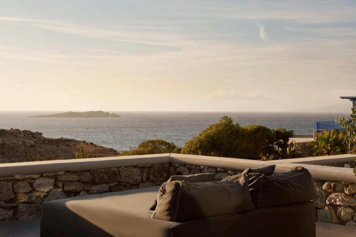 The luxurious suites, crafted in traditional whitewashed Cycladic style, blend timeless charm with modern comforts. Each features air-conditioned interiors, satellite TVs, mini-fridges, and cozy seating areas, with private bathrooms stocked with plush bathrobes and hairdryers. Balconies or terraces open to breathtaking sea vistas, and select suites elevate the experience with private outdoor hot tubs, perfect for soaking under the stars. The airy, light-filled spaces invite relaxation, harmonizing Mykonos' iconic aesthetic with sophisticated touches.