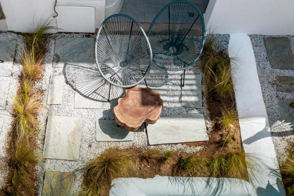 The 17 meticulously designed rooms and suites, ranging from classic to grand, fuse modern comforts with artistic flair. Each features air-conditioned interiors, flat-screen TVs, wardrobes, and private bathrooms with plush bathrobes and luxurious toiletries. Private balconies or terraces open to sweeping views of the Aegean Sea or Naoussa's whitewashed village, with some suites offering intimate outdoor hot tubs. The bohemian-inspired decor, with handcrafted furnishings and soft, earthy tones, creates a warm, inviting ambiance for a tranquil stay.