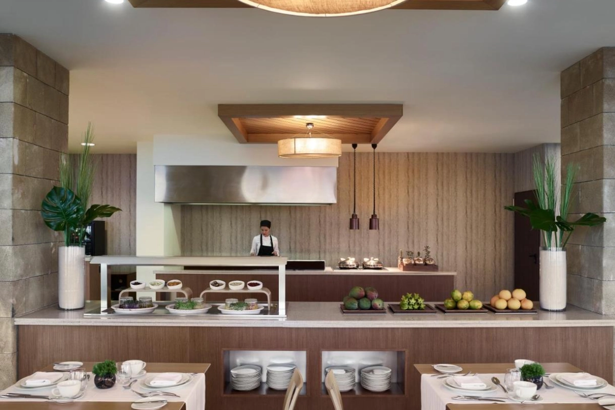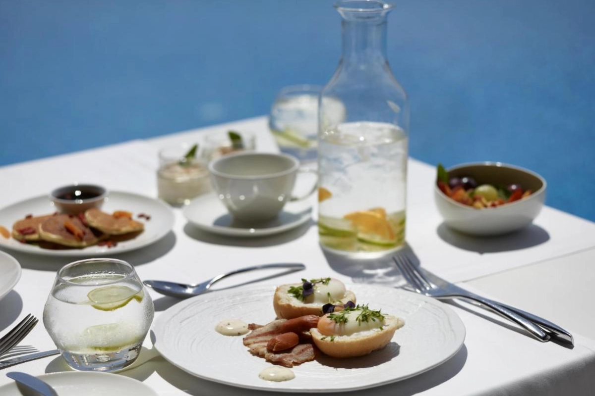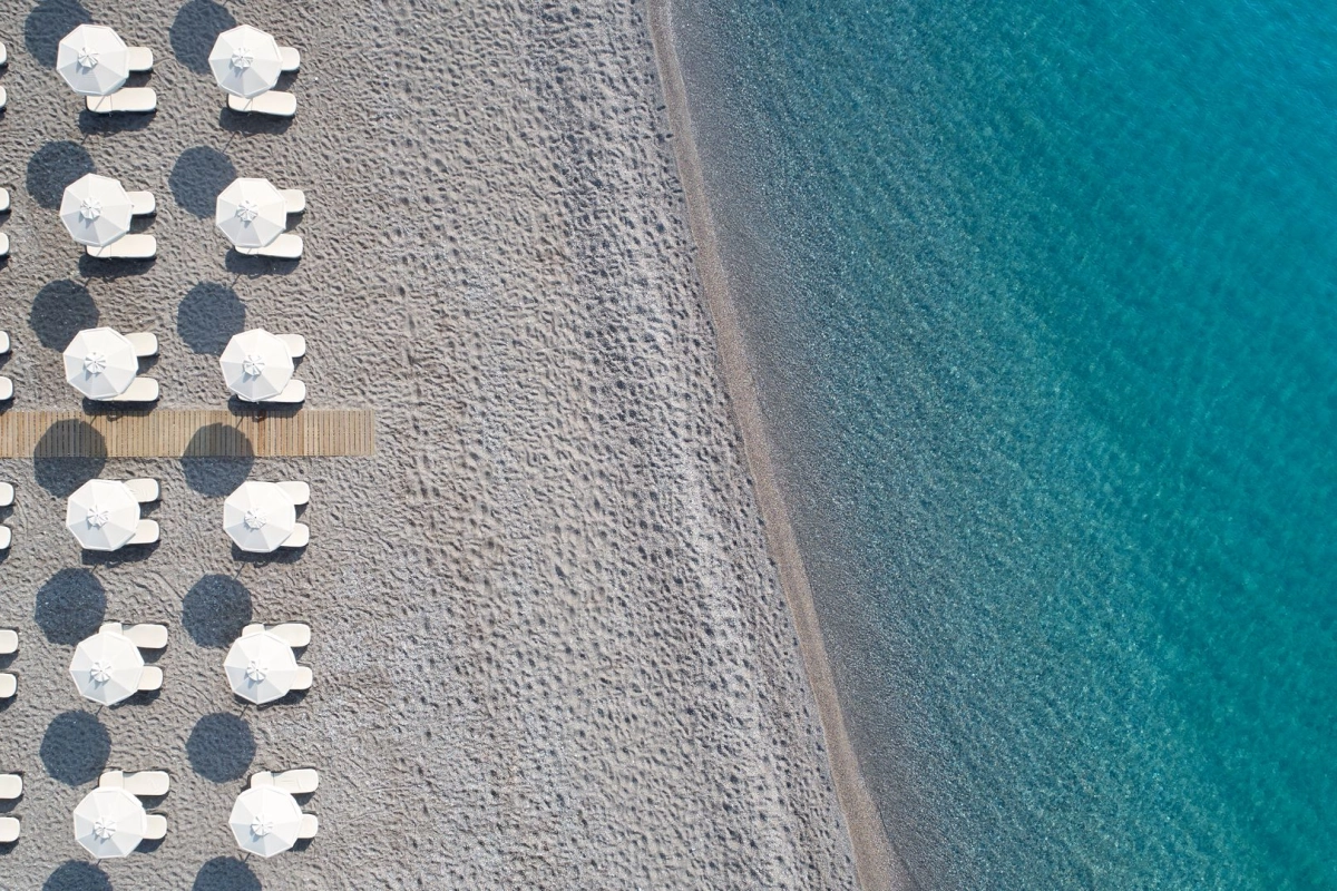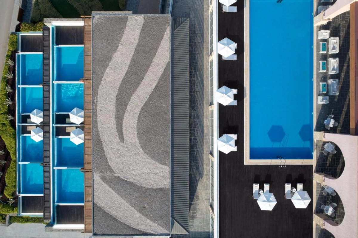 The 44 exquisitely designed rooms and suites, dressed in earthy tones, feature spacious interiors with satellite LCD TVs, minibars, and furnished balconies showcasing panoramic sea views. Select suites elevate the experience with private pools or hot tubs, perfect for unwinding in seclusion. High-quality furnishings, plush bathrobes, and slippers create a refined yet inviting ambiance, ensuring every moment feels indulgent. The clean lines and modern design foster a seamless connection with the island's natural beauty.