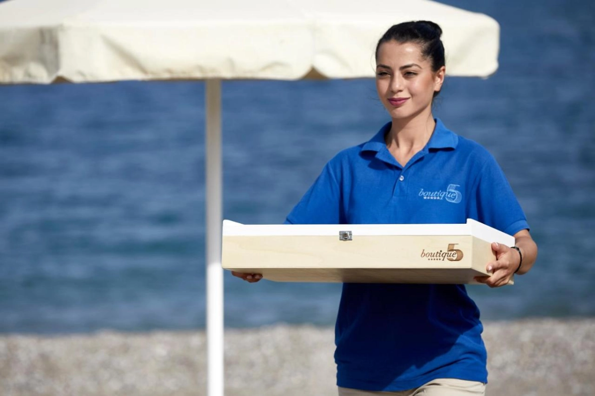 Dining at Boutique 5 is a sensory delight at Impressions Restaurant, where breakfast unfolds with freshly baked pastries, local honeys, and aromatic coffee from a rich buffet. Lunch offers light, à la carte options like citrus-dressed salads and grilled seafood, while dinner transforms into a romantic affair under the stars, featuring Mediterranean dishes such as rosemary-roasted lamb paired with curated Greek and international wines. The Sketch Bar, nestled by the outdoor pool, serves refreshing daytime drinks and transforms into a chic evening venue with signature cocktails and live entertainment. The Bliss Spa, spanning an entire floor, offers rejuvenating massages, Turkish baths, and botanical facials, complemented by a serene indoor pool, hot tub, and modern gym. A private beach, just 40 meters away, provides complimentary umbrellas, sundecks, and Balinese beds, while a tennis court adds a touch of activity for those seeking balance.
