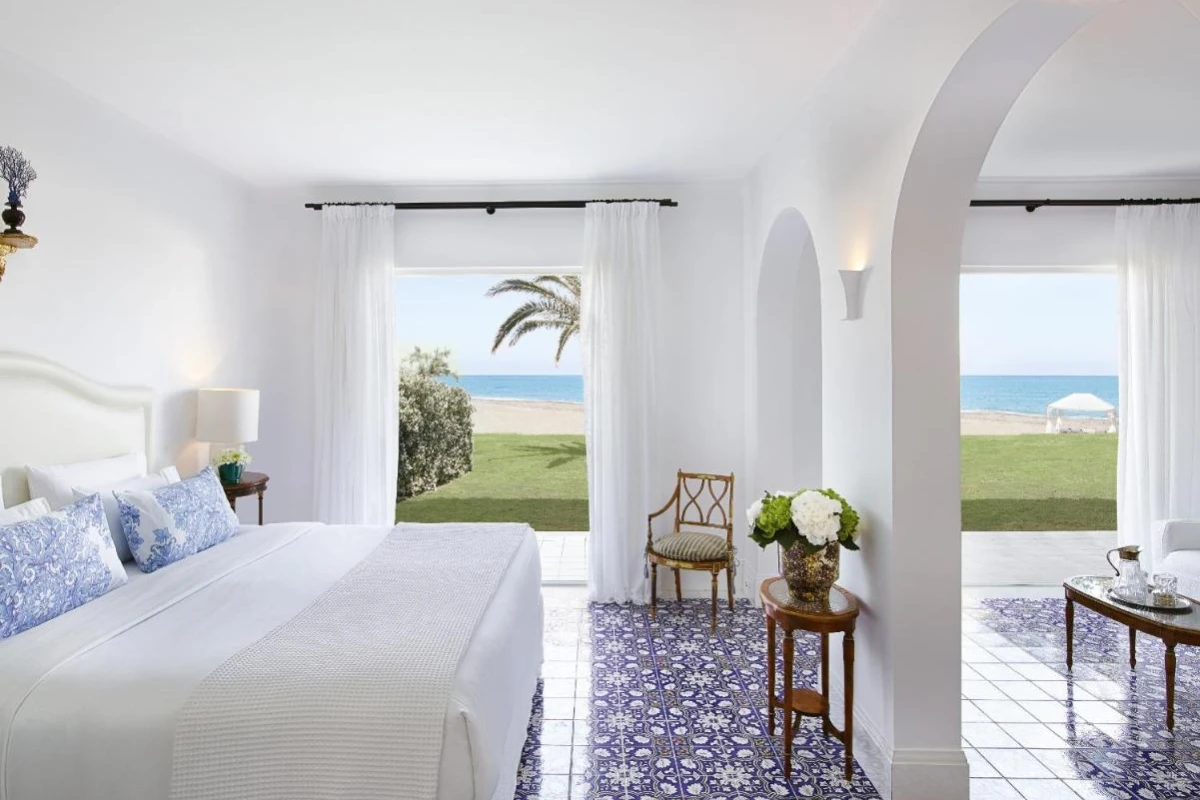 The collection of suites, maisonettes, and villas channels retro glamour, with bespoke floor tiles, rich fabrics, and a harmonious blend of antique and contemporary furnishings. Each accommodation opens to a private balcony, some offering sweeping views of the Cretan Sea, and features spa-inspired bathrooms with plush toiletries, slippers, and hairdryers. Modern comforts like flat-screen TVs and minibars enhance the experience, creating an inviting space that feels both timeless and indulgent.