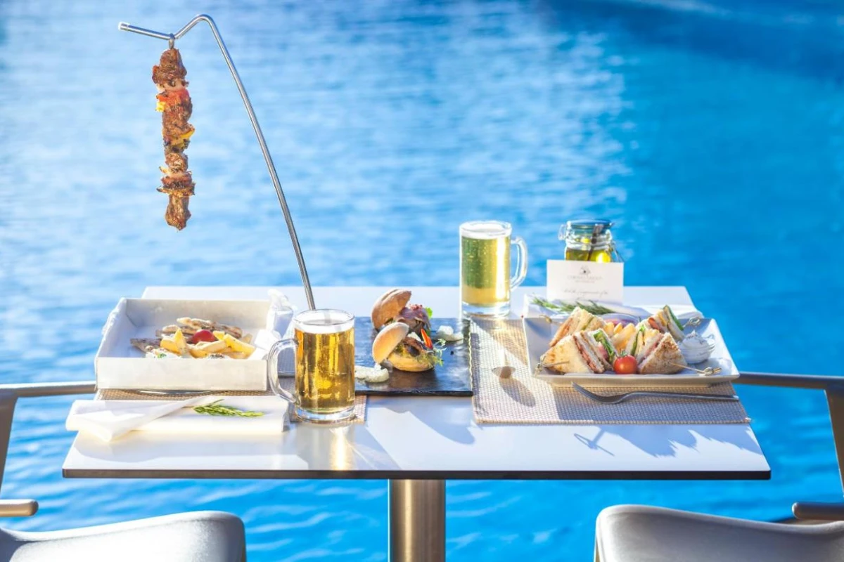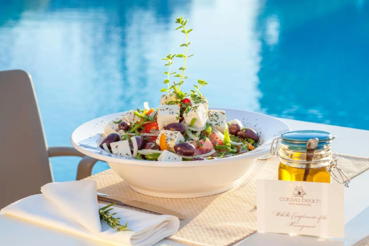 Dining at Caravia Beach is a delight for the senses. The Máina Gastro Restaurant, exclusive to adults, presents Mediterranean-inspired à la carte dishes crafted from the island's finest produce, enjoyed in an ambient setting overlooking the lagoon pool. The restaurant's adjacent lounge bar serves artfully crafted cocktails and light bites, perfect for savouring under the starlit sky. Three shimmering outdoor pools, including a dedicated adults-only section with plush sunbeds and parasols, invite leisurely days by the water. The Beach Bar complements the experience with refreshing drinks and snacks along the kilometre-long white sand beach. The Anassa Spa Wellness Center offers indulgent treatments, from soothing massages to tailored beauty therapies, alongside a tranquil sauna, steam room, chromotherapy area, and indoor pool. For those seeking activity, the resort provides tennis courts, mini-golf, volleyball, and water sports like windsurfing, while evening entertainment includes live music and Greek dance performances, ensuring vibrant nights.