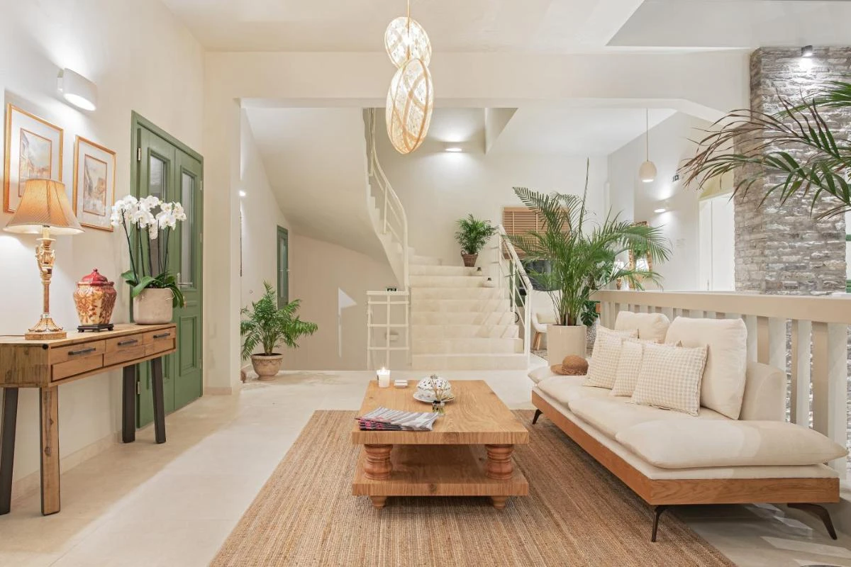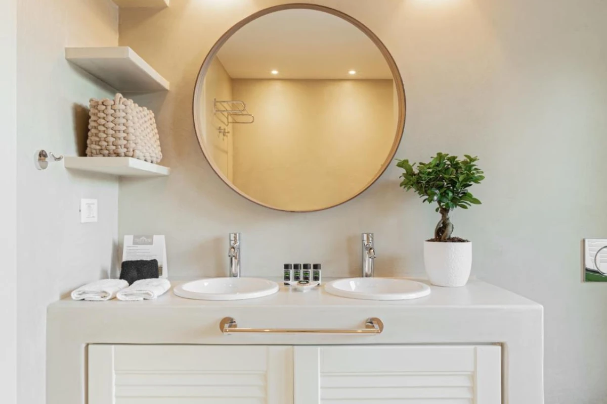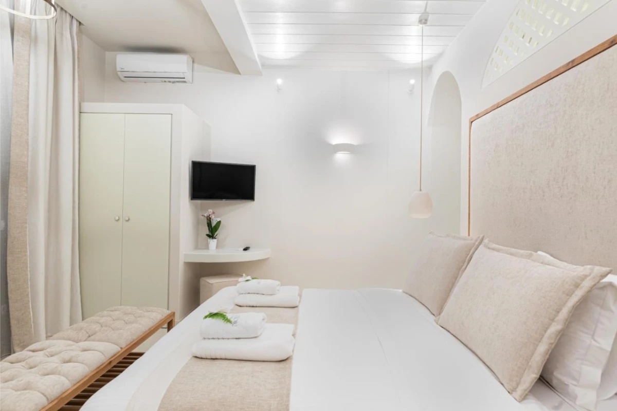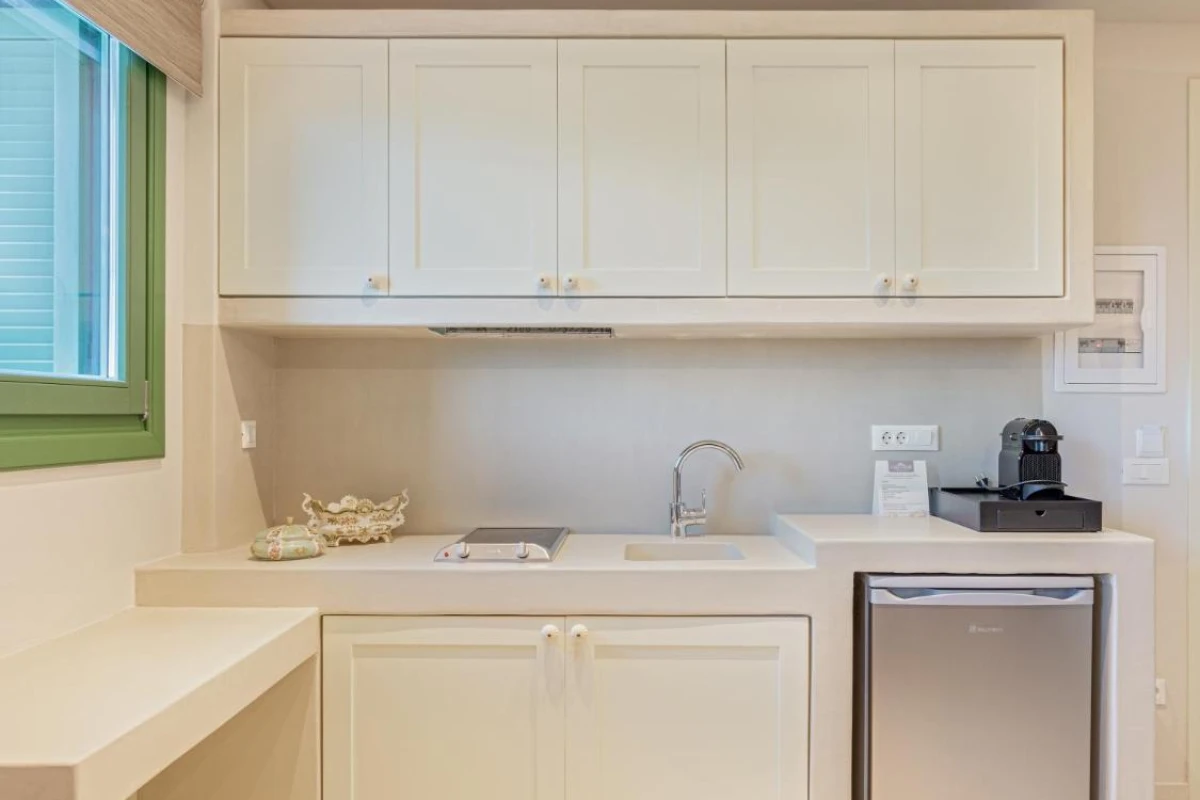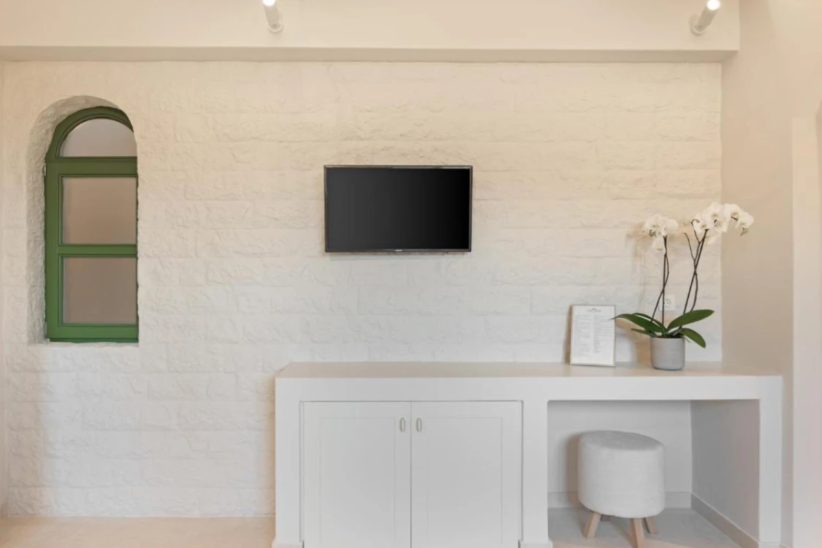 Each of the eight luxurious suites is a harmonious blend of minimalist design and vibrant accents, featuring air-conditioned comfort, private balconies, and patios with outdoor dining areas that frame serene sea, mountain, or courtyard views. Thoughtfully appointed with flat-screen TVs, coffee machines, toasters, fridges, stovetops, kettles, and kitchenware, the suites also include walk-in shower bathrooms with plush linens and towels, creating a refined yet cozy haven for relaxation.