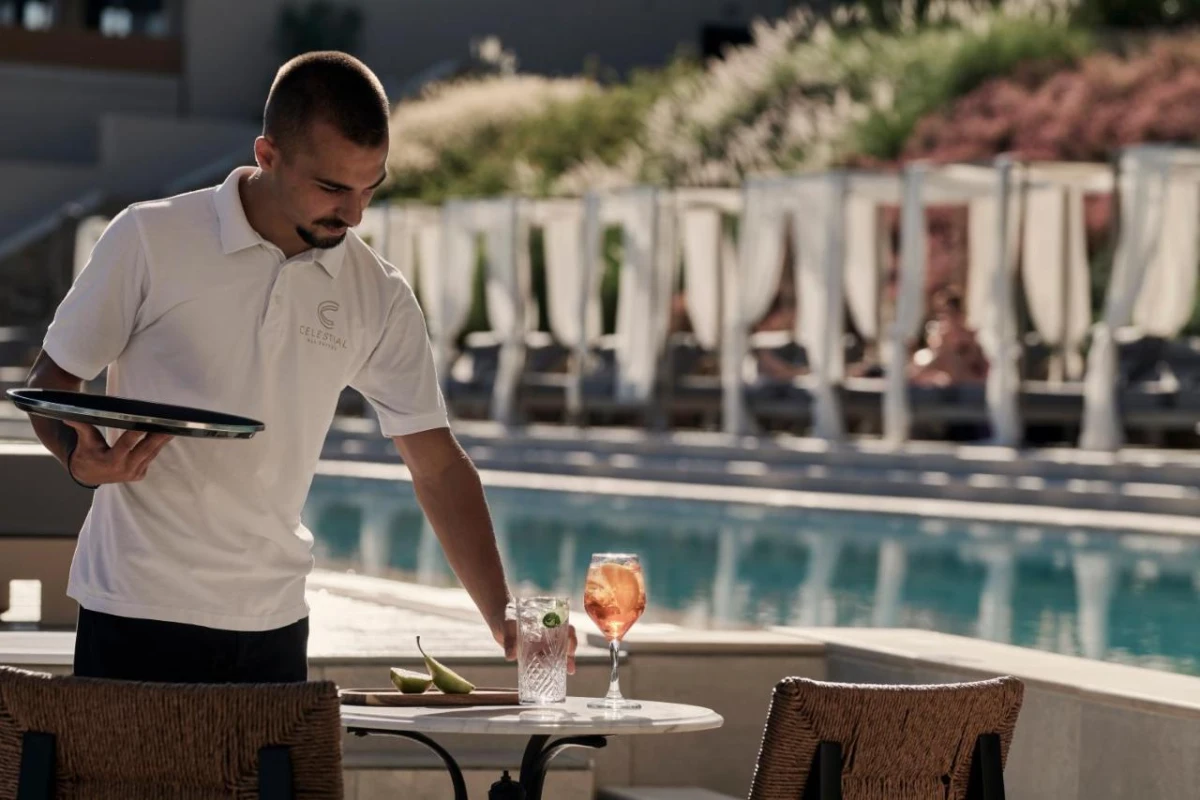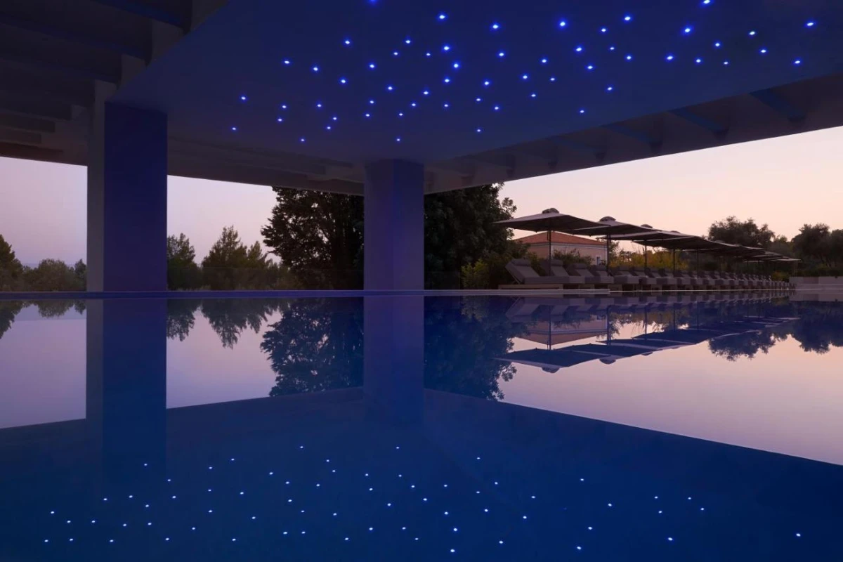 Dining at Celestial All Suites is a celebration of culinary artistry. The refined restaurant serves exquisite Greek and international dishes crafted from fresh, local ingredients, enjoyed on a sea-view terrace or in the elegant dining room. The bar crafts signature cocktails and fine wines, perfect for savouring under the starlit sky or amidst the lush gardens. A sparkling outdoor pool, framed by plush sun loungers, offers a serene retreat, while the rejuvenating wellness centre, complete with a sauna and bespoke massage treatments, soothes the senses. A modern gym caters to active guests, and the attentive 24-hour front desk curates tailored experiences, from hiking and horse riding to private boat trips exploring Kefalonia's hidden coves.