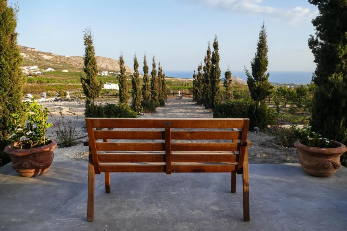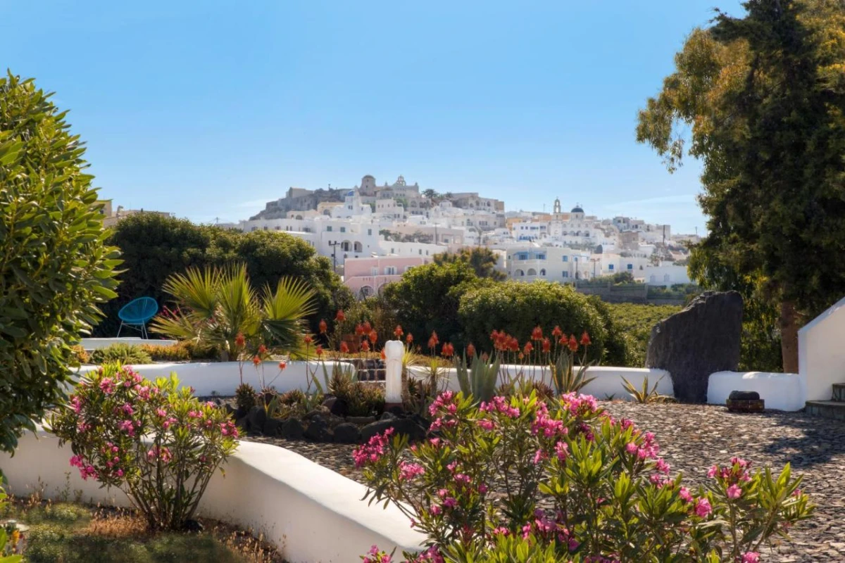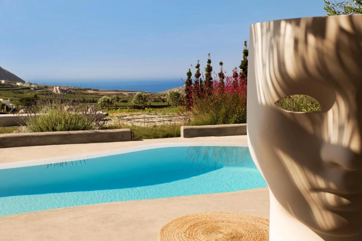 Christou Estate Santorini, an exquisite adults-only boutique retreat in Pyrgos Kallistis, Santorini, nestles within a 5,500-square-metre oasis of olive trees, cypresses, pomegranates, herbs, and organic vegetable gardens, offering a serene escape steeped in Cycladic charm.