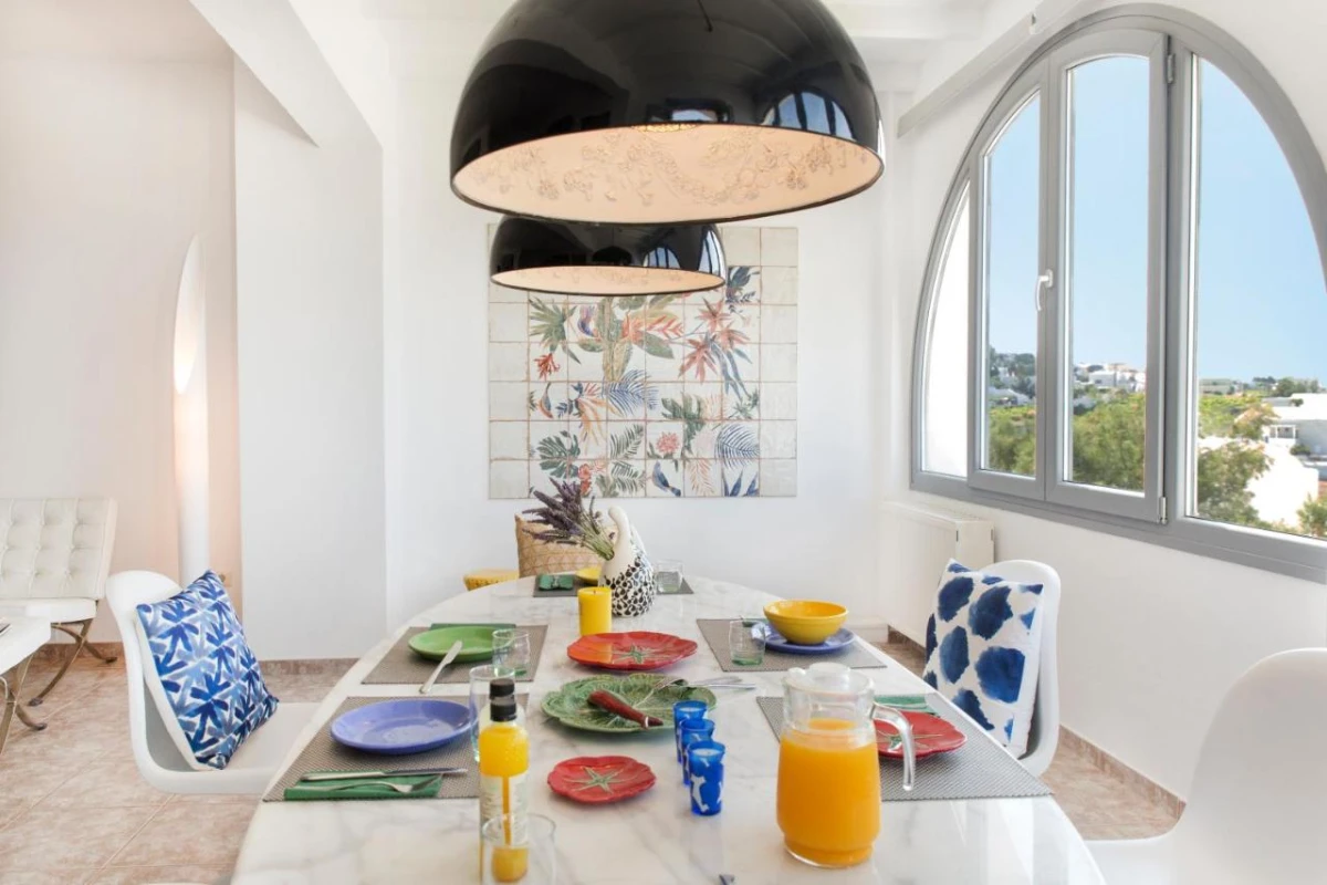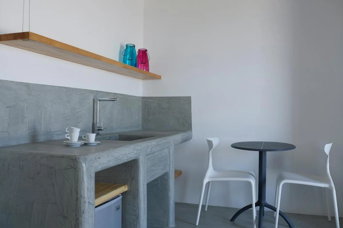 The three elegantly designed villas, bathed in the island's radiant light, feature separate entrances for ultimate privacy. Each villa is appointed with air conditioning, flat-screen TVs, coffee machines, fridges, ovens, kettles, wardrobes, and pristine bathrooms with showers. Select villas include kitchenettes with dishwashers, enhancing the sense of home. Private terraces with personal pools and outdoor lounges offer breathtaking views of the Aegean Sea and Santorini's iconic landscapes, creating a secluded haven perfect for romantic getaways or special celebrations.