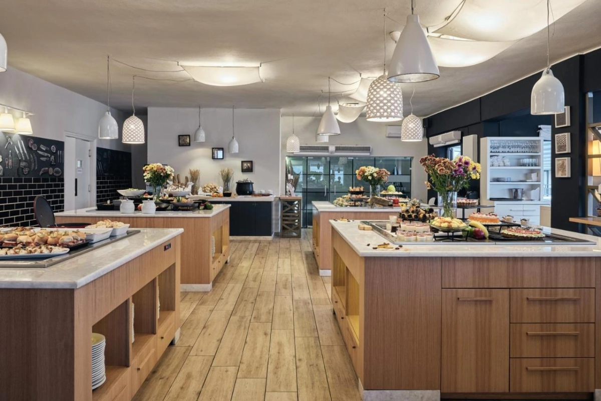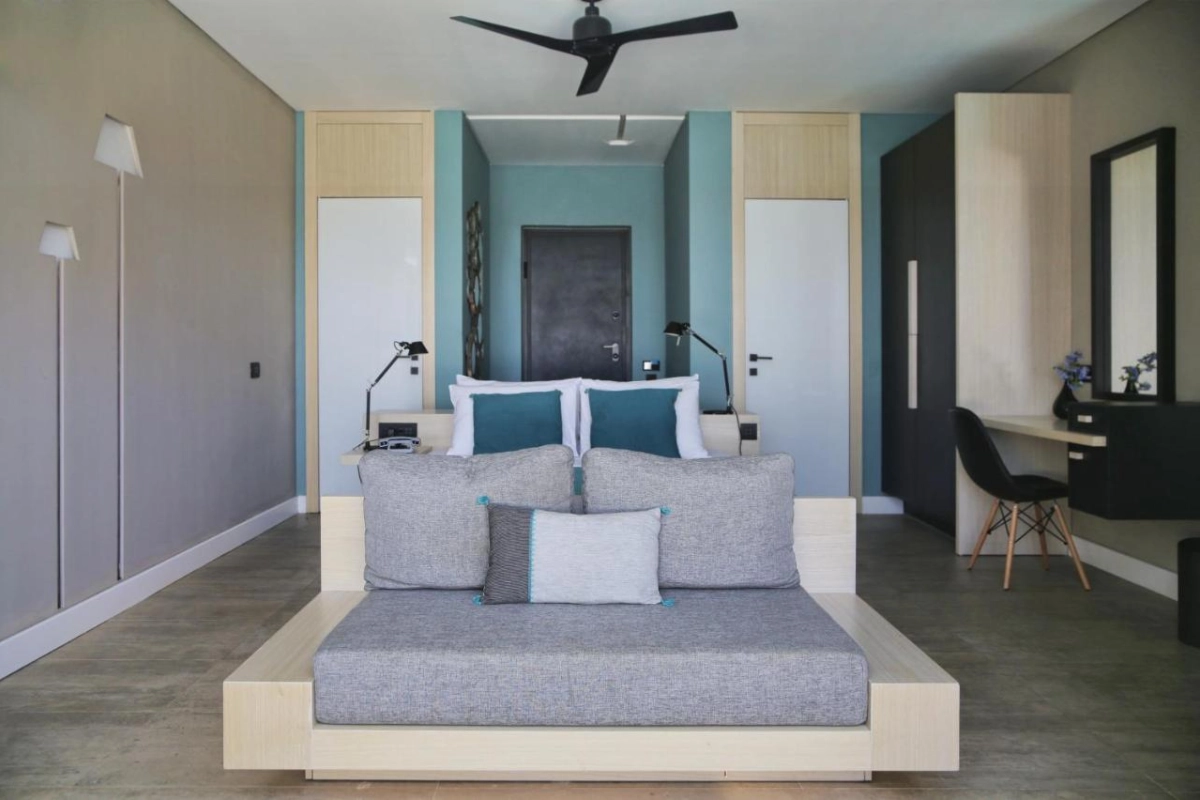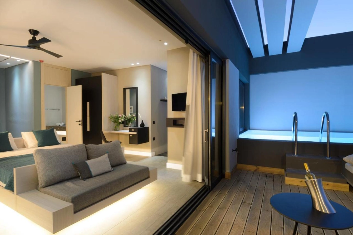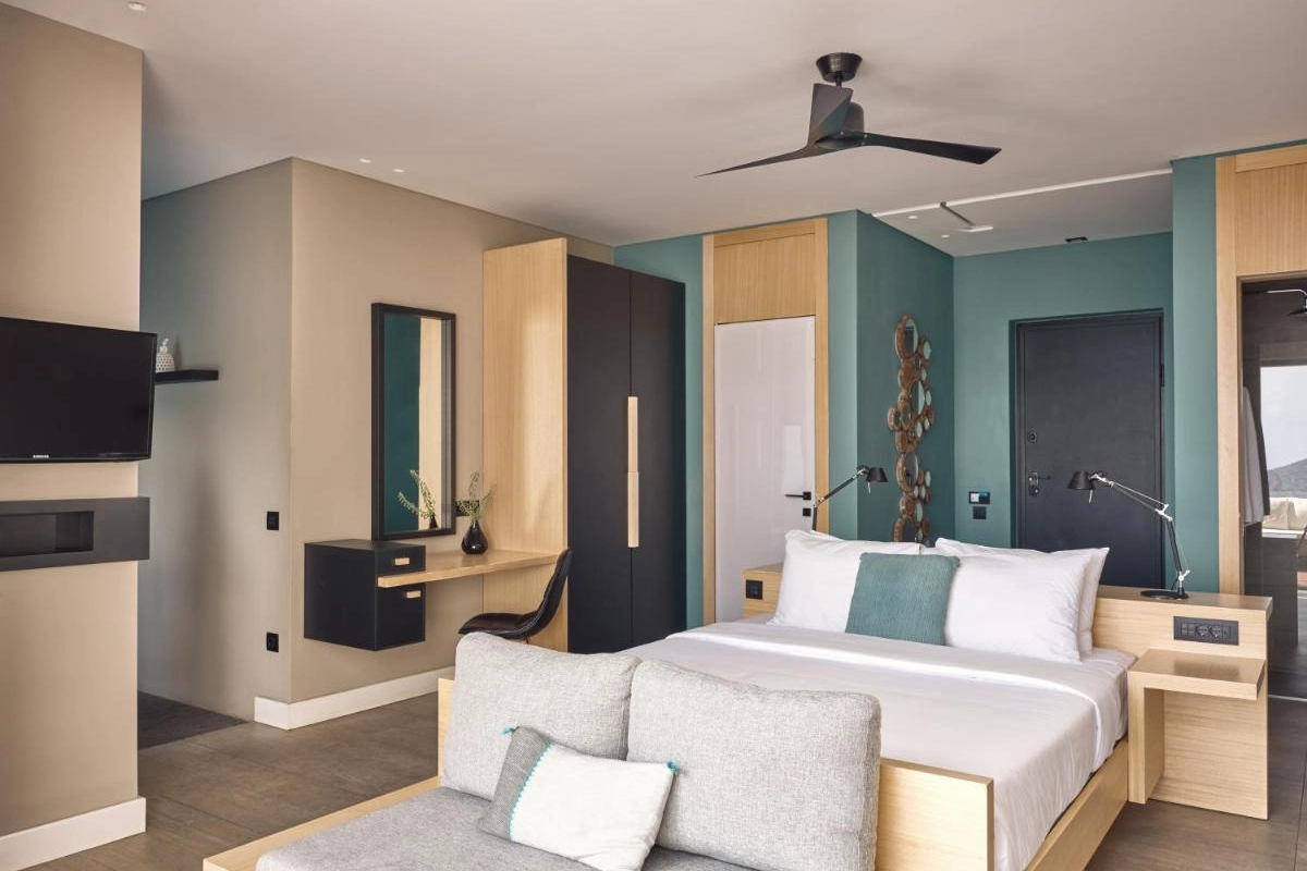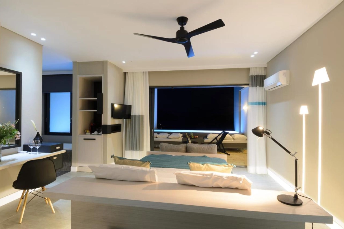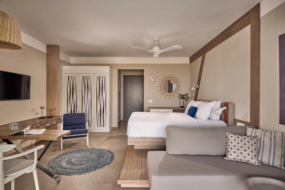 The spacious suites, elegantly furnished with a Med-retro aesthetic, feature air-conditioned comfort, flat-screen TVs, and private balconies or terraces showcasing breathtaking gulf vistas. Select Cool Living Selection suites elevate the experience with exclusive access to elite amenities and areas. Each accommodation blends modern sophistication with the island's laid-back charm, creating an inviting oasis for relaxation and rejuvenation amidst lush gardens.