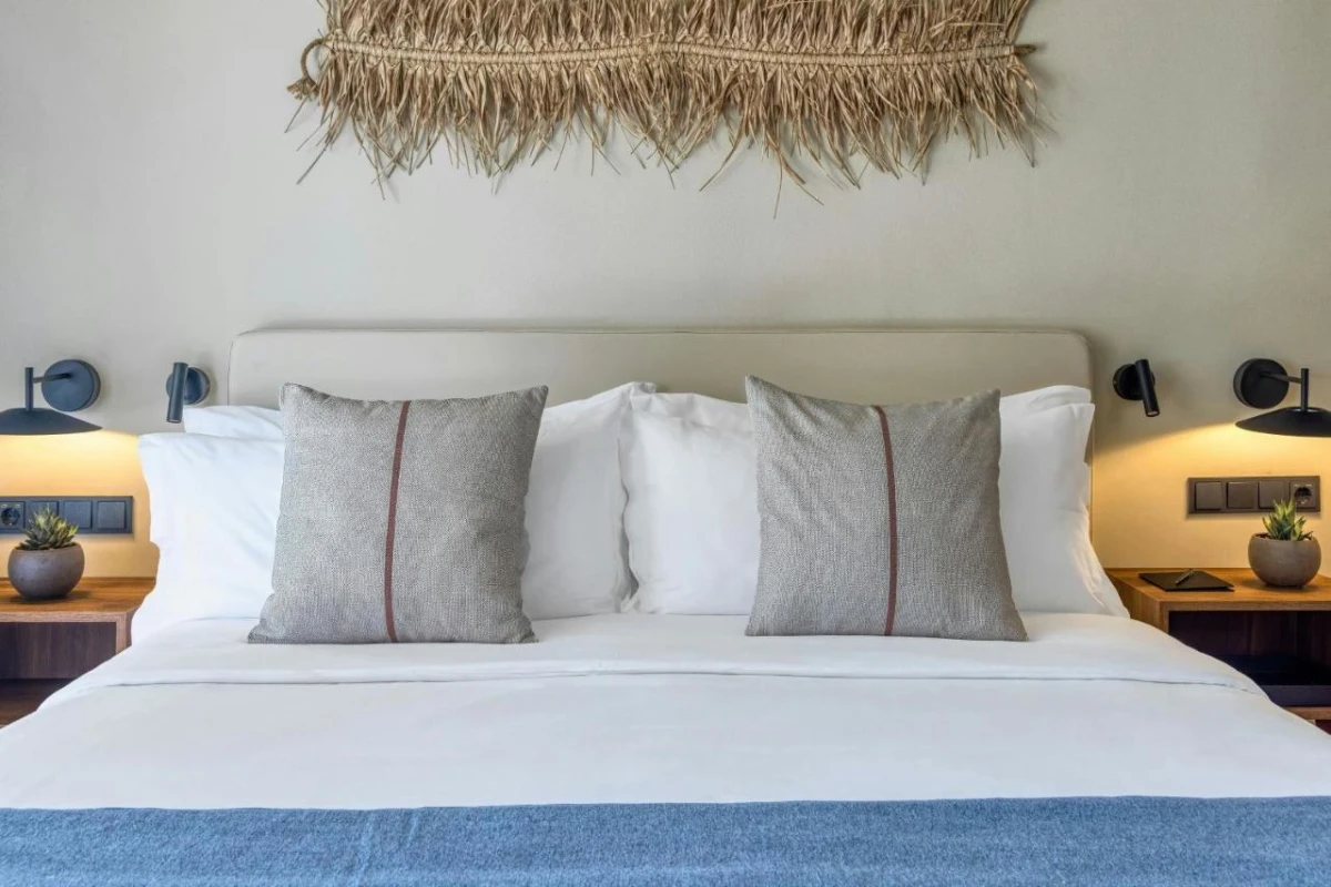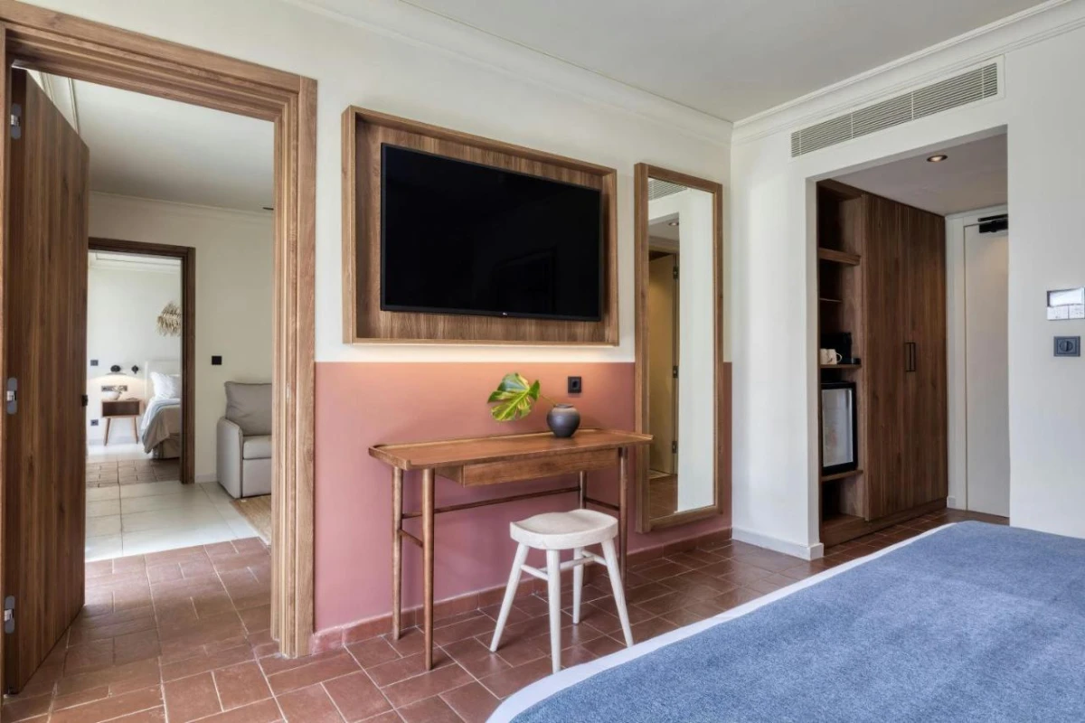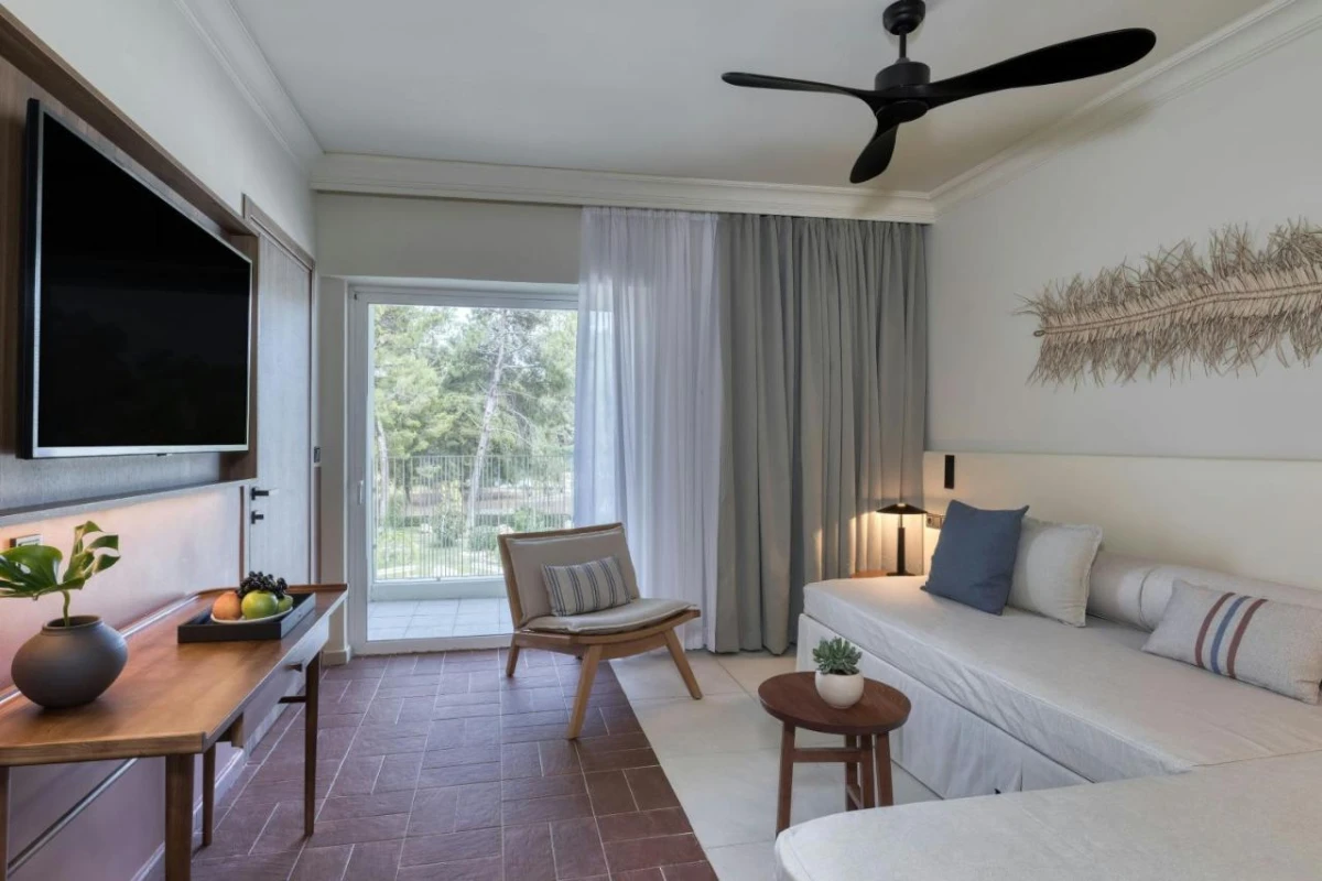 The 78 opulent rooms and suites, adorned with elegant decor, feature air-conditioned comfort, flat-screen TVs, and private balconies or terraces, many with exclusive pools offering unrivaled privacy and views of the island's crystalline coastline or vibrant gardens. The design blends modern sophistication with Zakynthos' natural charm, creating a serene haven for relaxation.