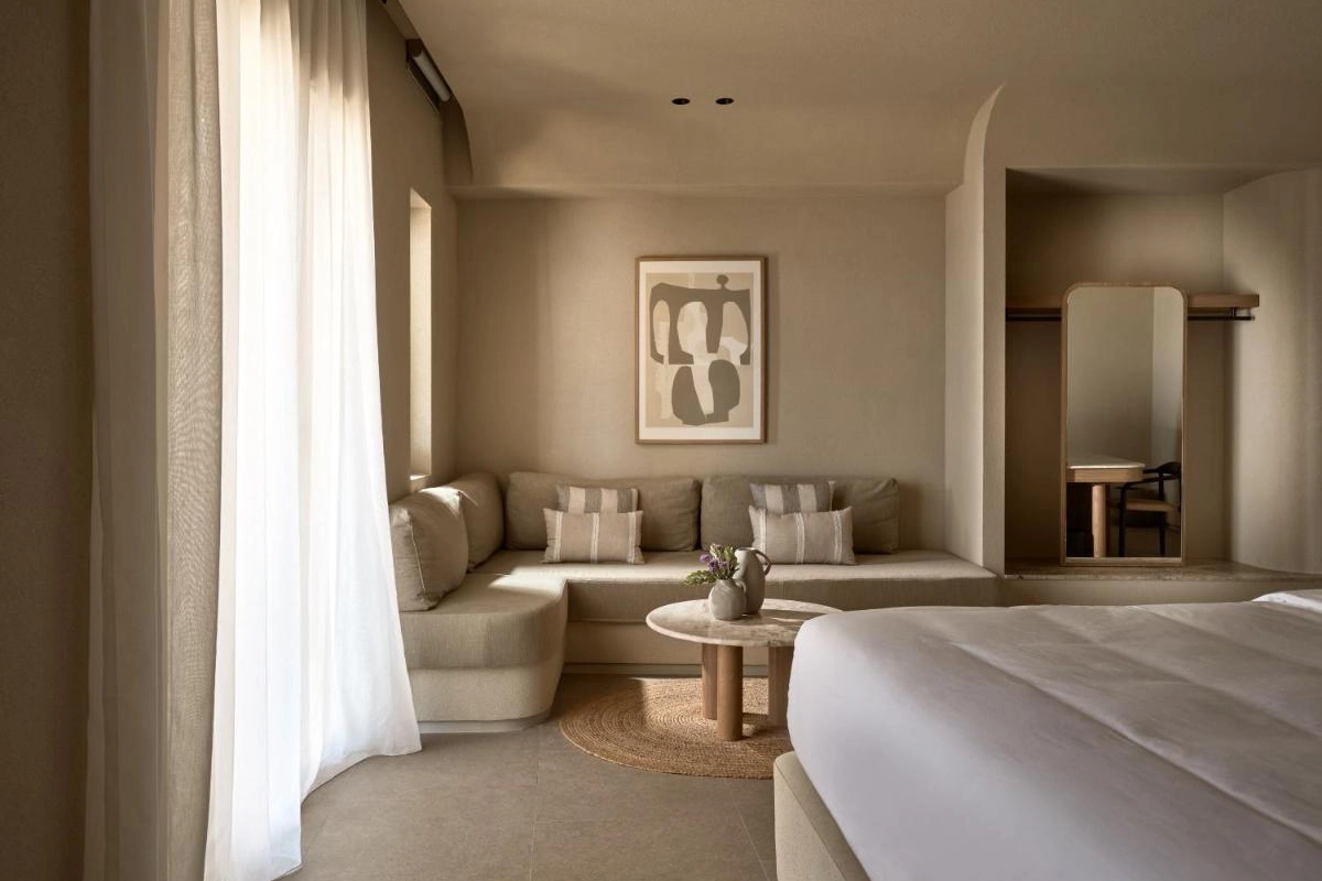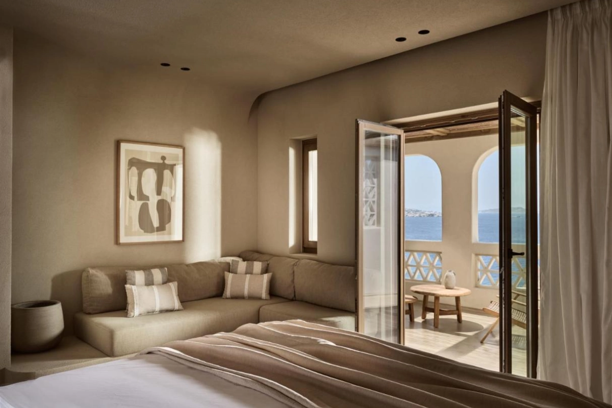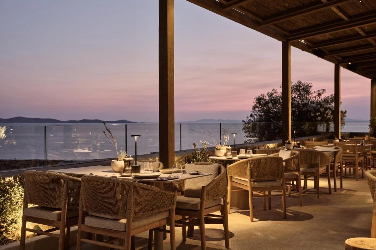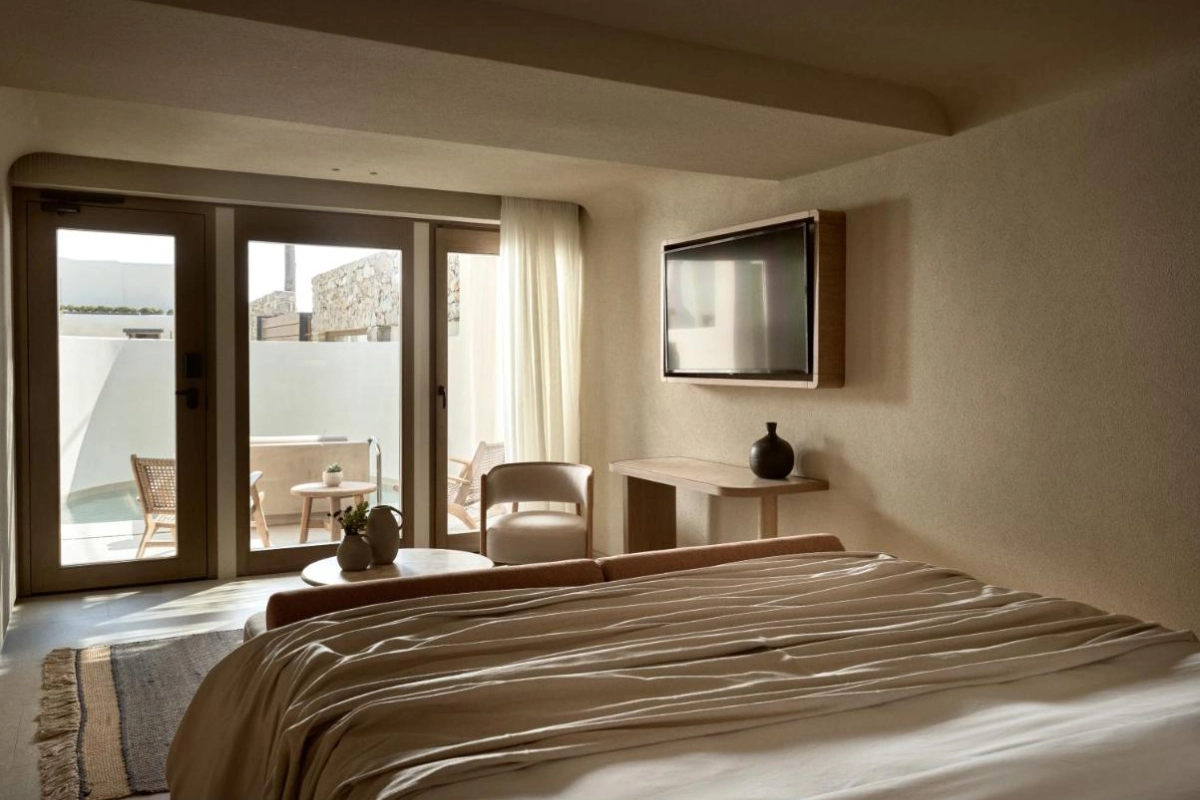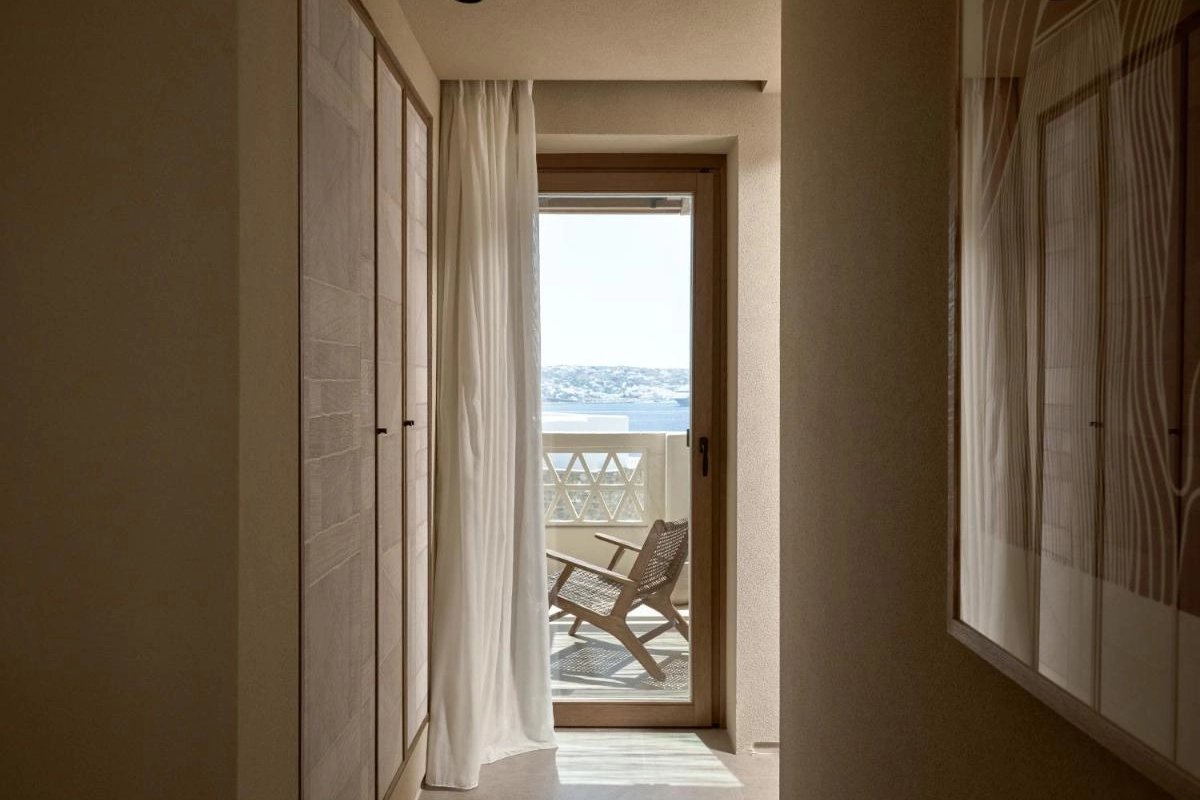 The chic rooms and suites, designed with immaculate designer interiors, feature air-conditioned comfort, flat-screen TVs, safety deposit boxes, and spa-ready bathrooms with showers and premium toiletries. Select accommodations offer terraces with captivating Aegean views, blending Mykonos' bohemian charm with top-tier luxury to create a private oasis for relaxation and indulgence.