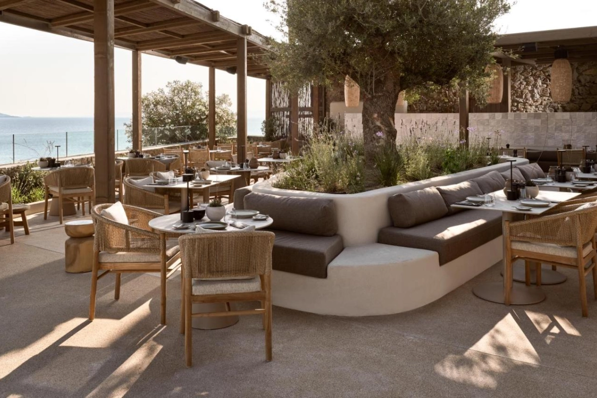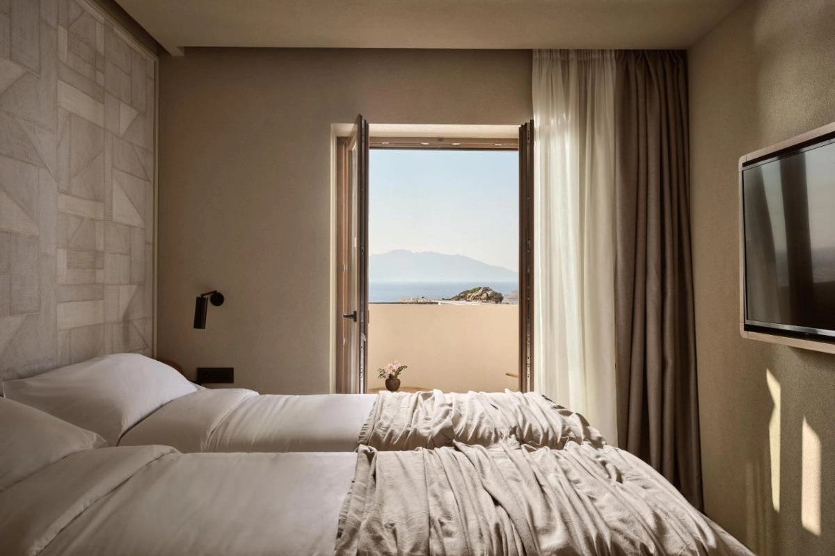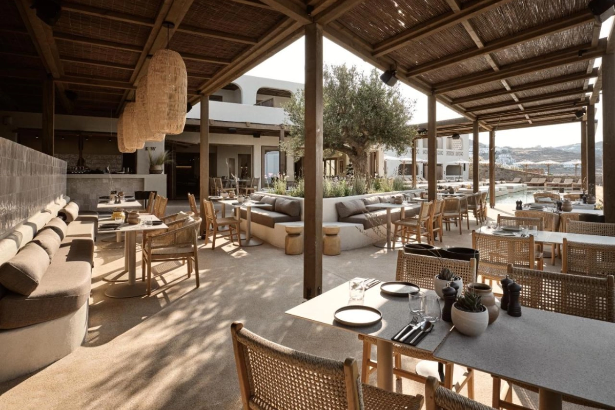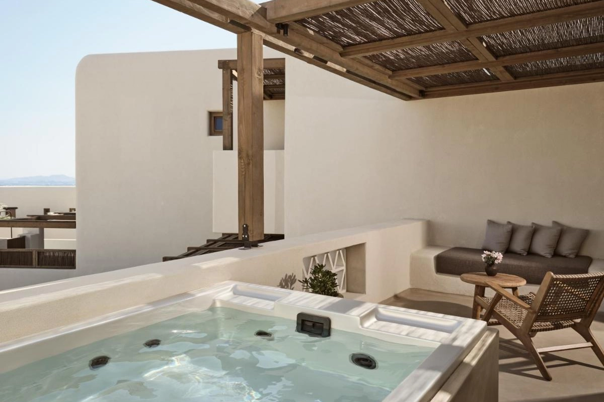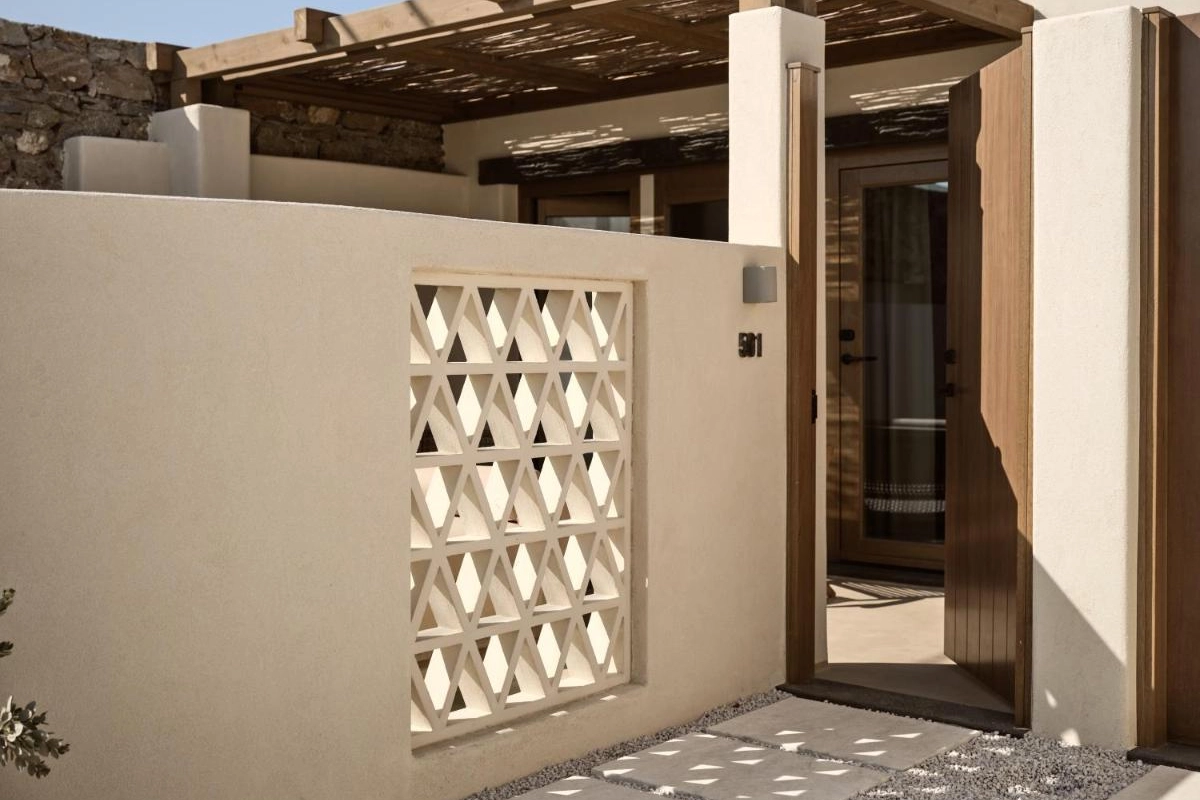 The chic rooms and suites, designed with immaculate designer interiors, feature air-conditioned comfort, flat-screen TVs, safety deposit boxes, and spa-ready bathrooms with showers and premium toiletries. Select accommodations offer terraces with captivating Aegean views, blending Mykonos' bohemian charm with top-tier luxury to create a private oasis for relaxation and indulgence.
