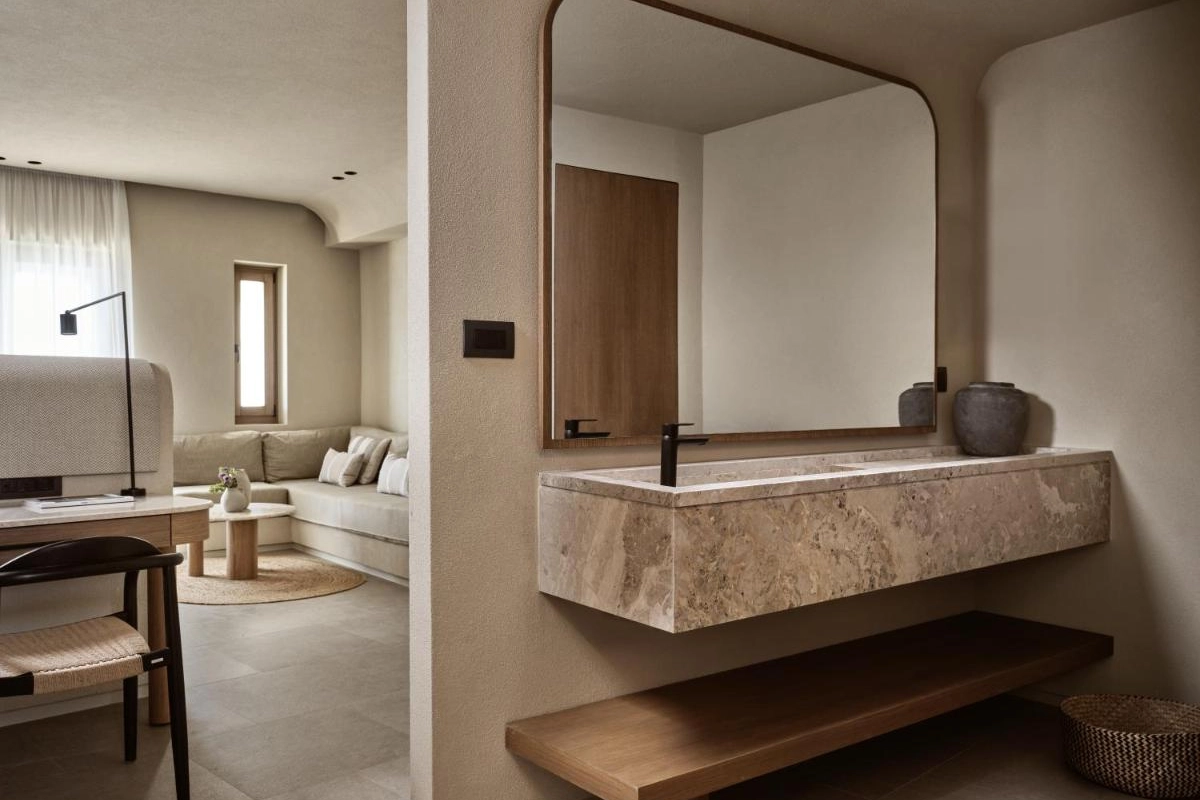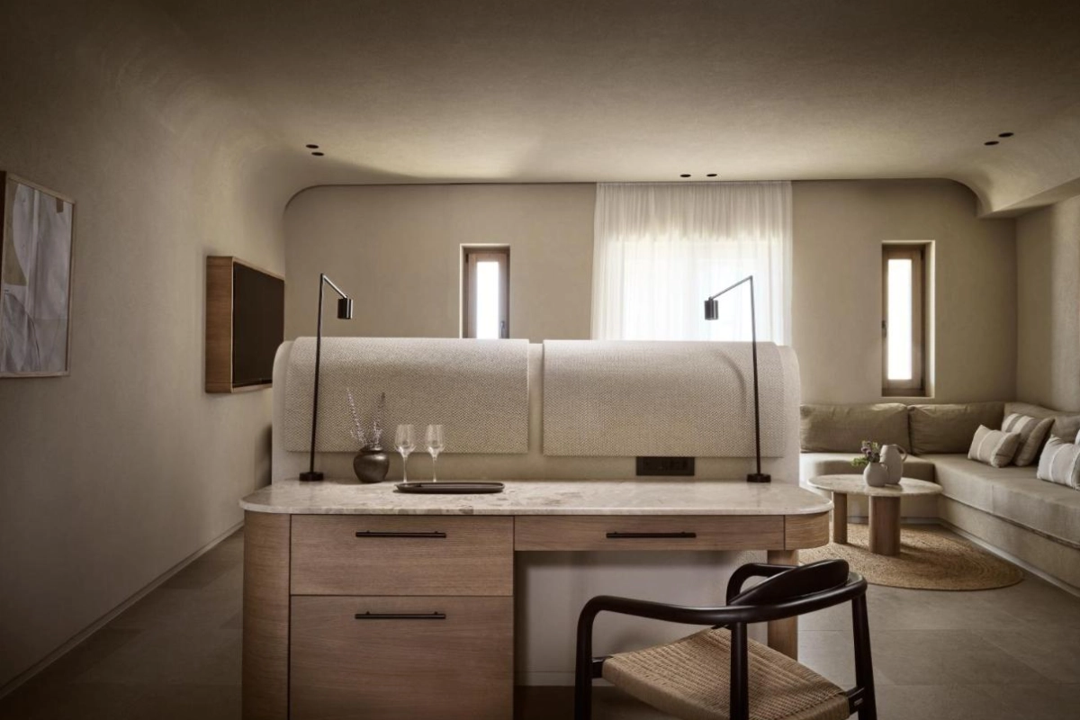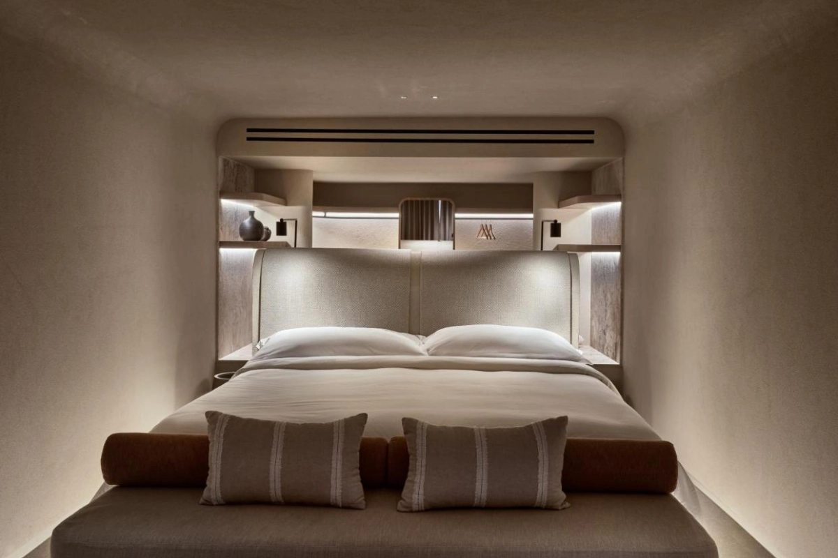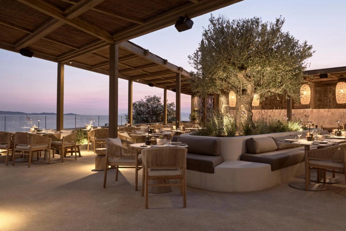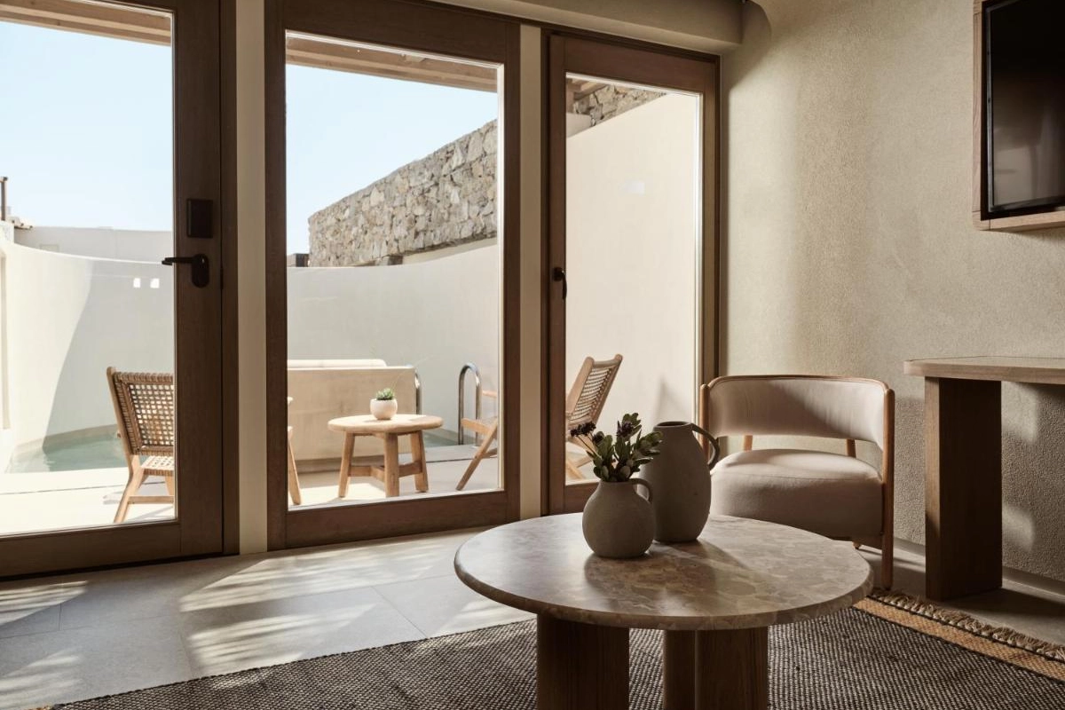 The chic rooms and suites, designed with immaculate designer interiors, feature air-conditioned comfort, flat-screen TVs, safety deposit boxes, and spa-ready bathrooms with showers and premium toiletries. Select accommodations offer terraces with captivating Aegean views, blending Mykonos' bohemian charm with top-tier luxury to create a private oasis for relaxation and indulgence.