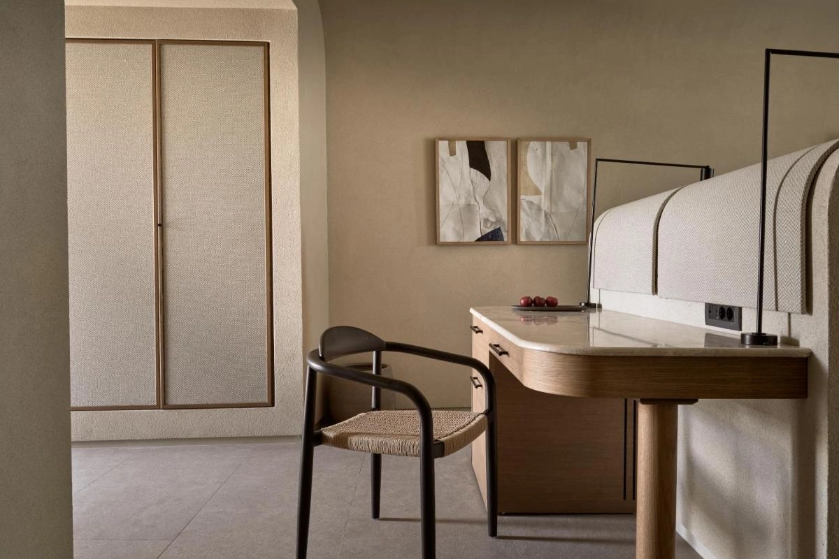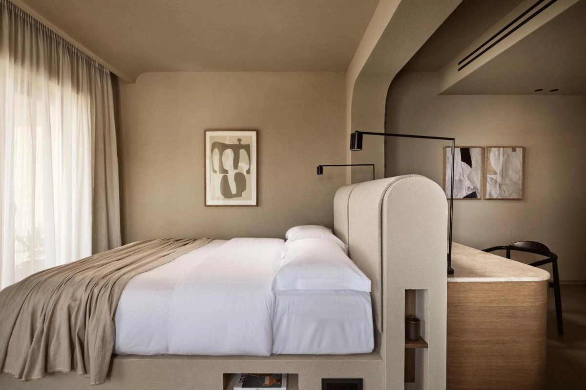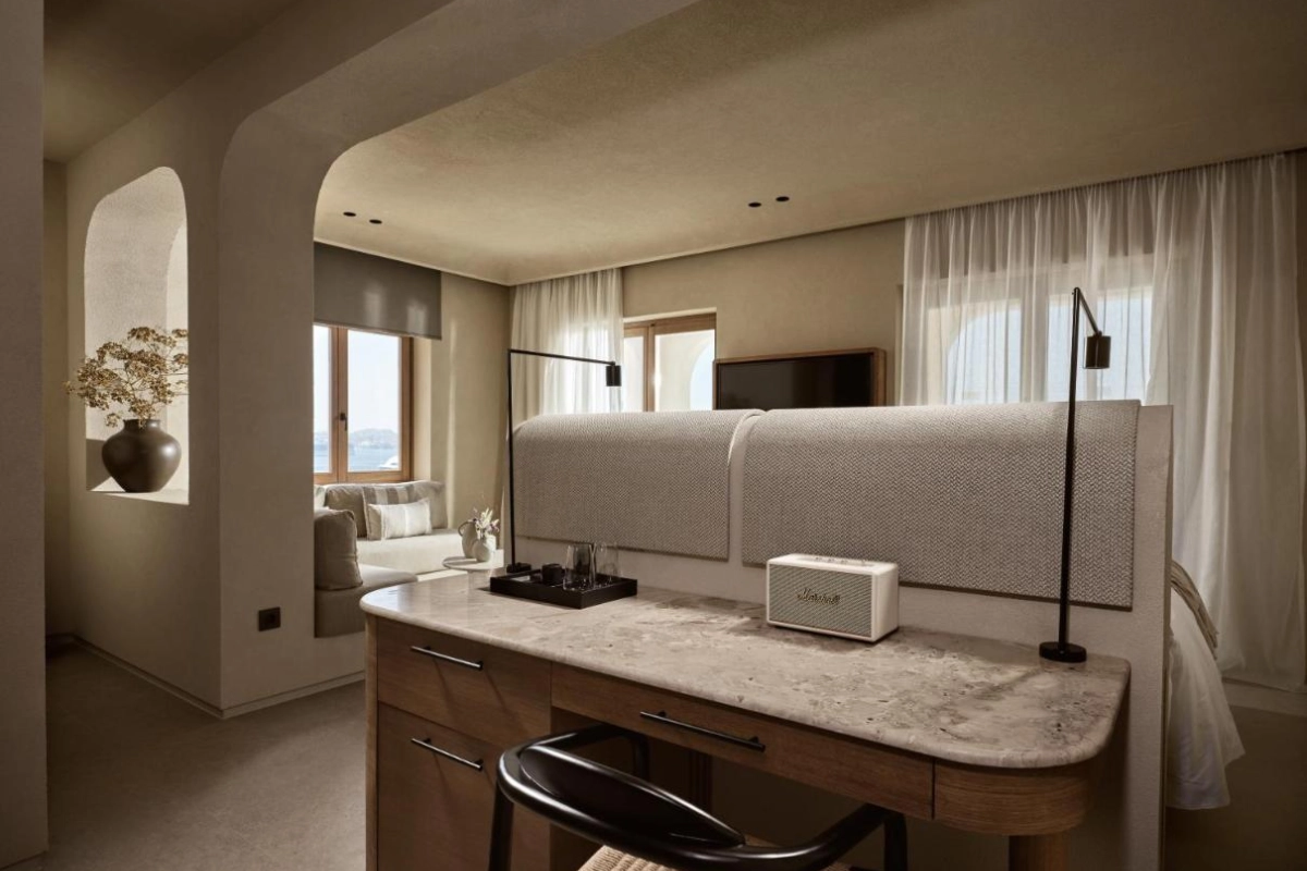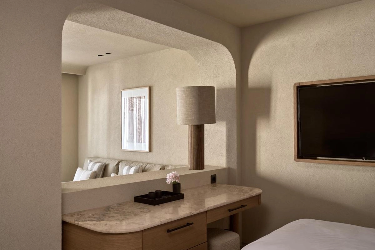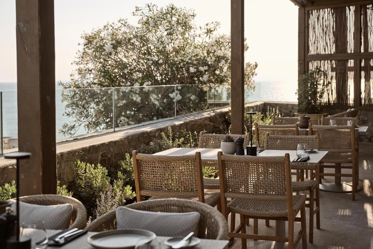 The chic rooms and suites, designed with immaculate designer interiors, feature air-conditioned comfort, flat-screen TVs, safety deposit boxes, and spa-ready bathrooms with showers and premium toiletries. Select accommodations offer terraces with captivating Aegean views, blending Mykonos' bohemian charm with top-tier luxury to create a private oasis for relaxation and indulgence.